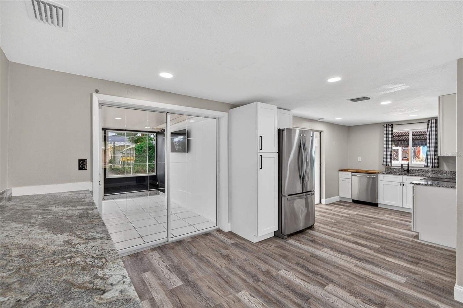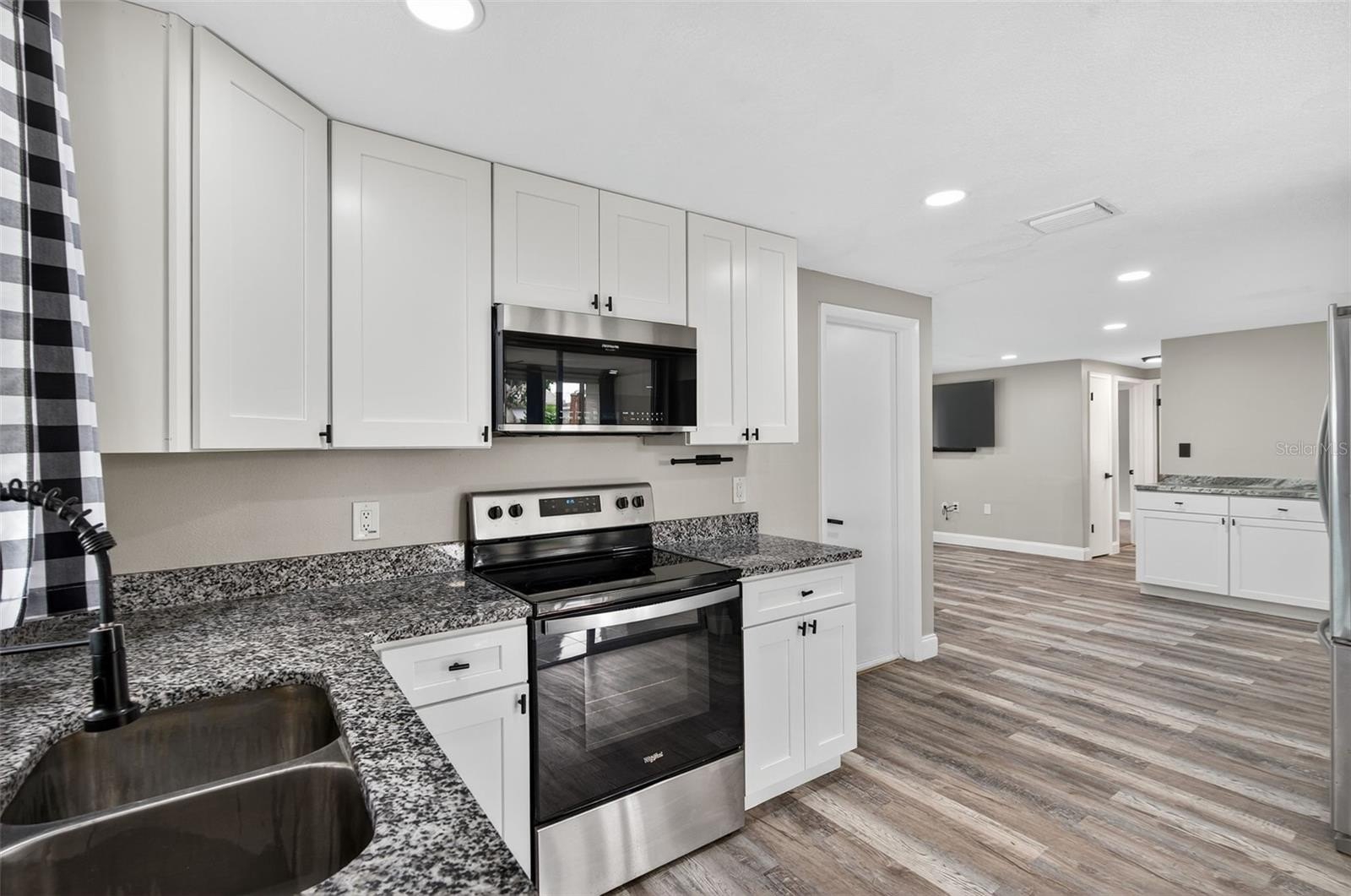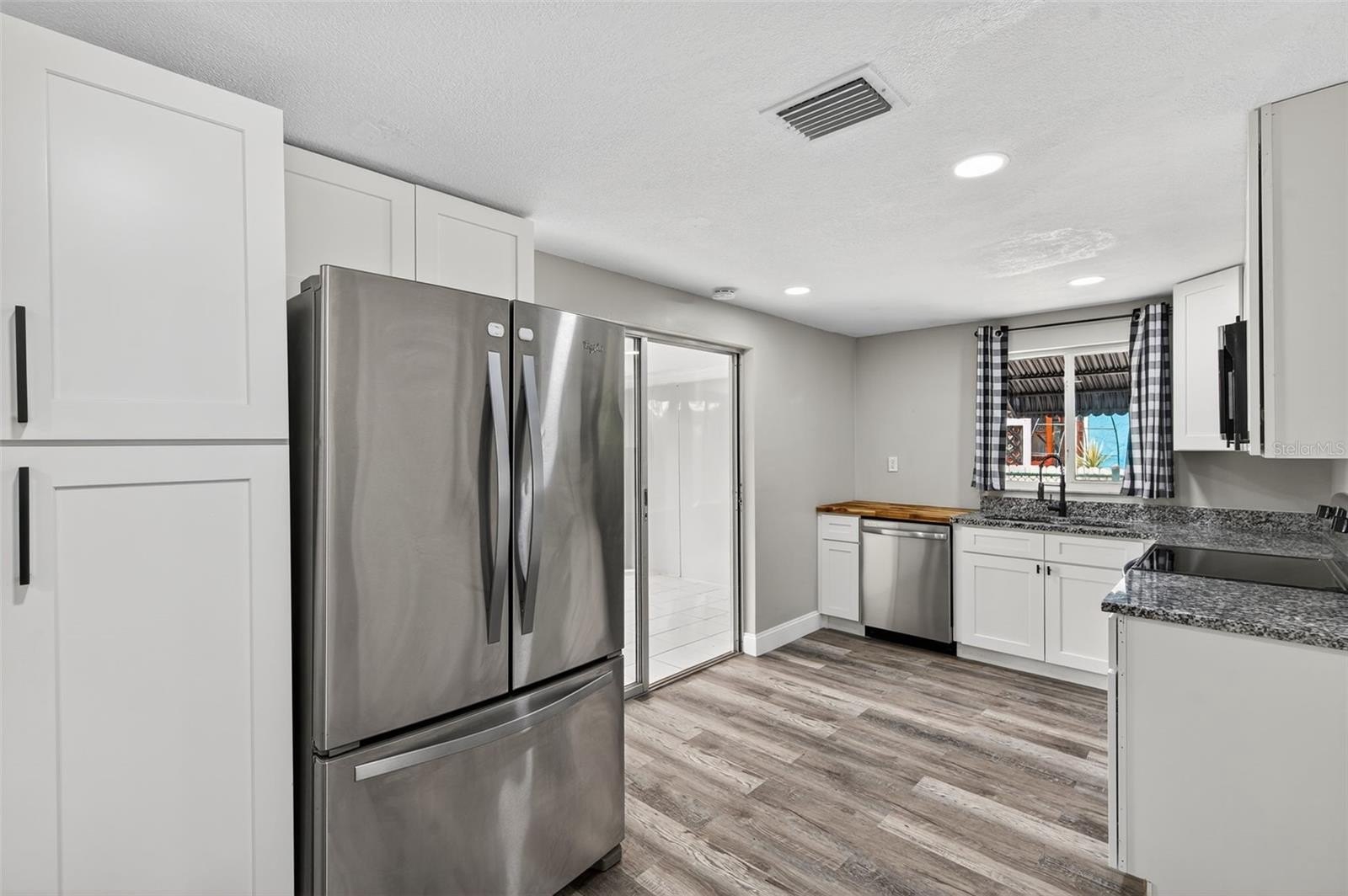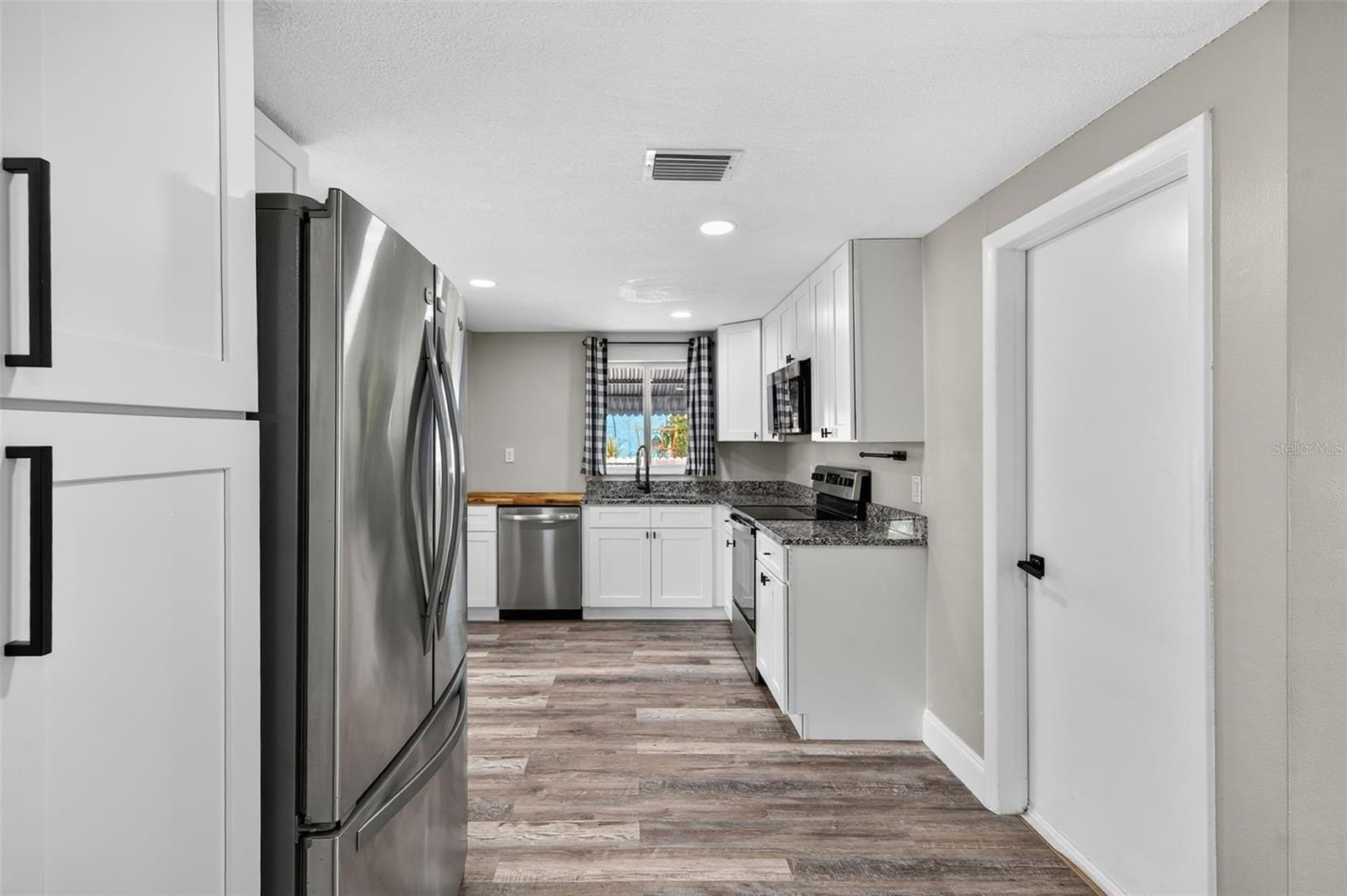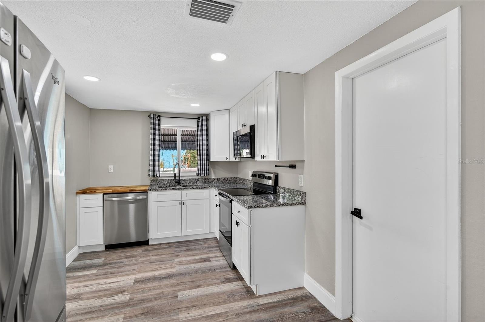 The remodeled kitchen is a true centerpiece, featuring crisp white shaker cabinetry, granite countertops paired with a stylish butcher-block accent, stainless steel appliances, built-in pantry storage, and even a matching cabinet extension in the dining space for extra functionality.