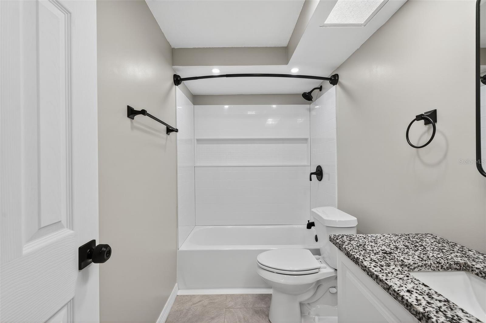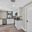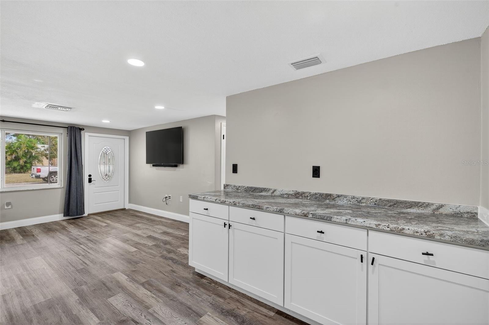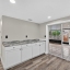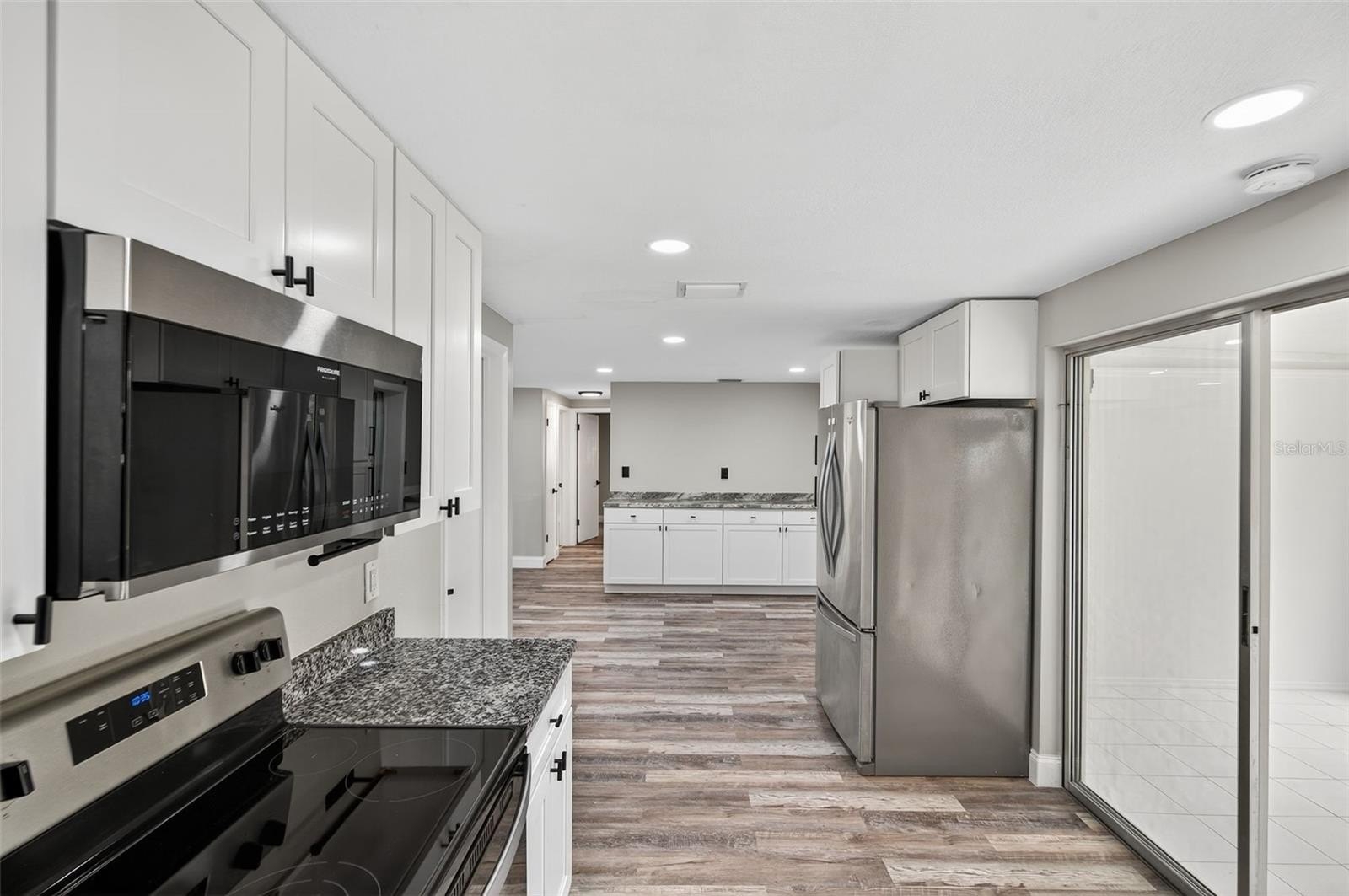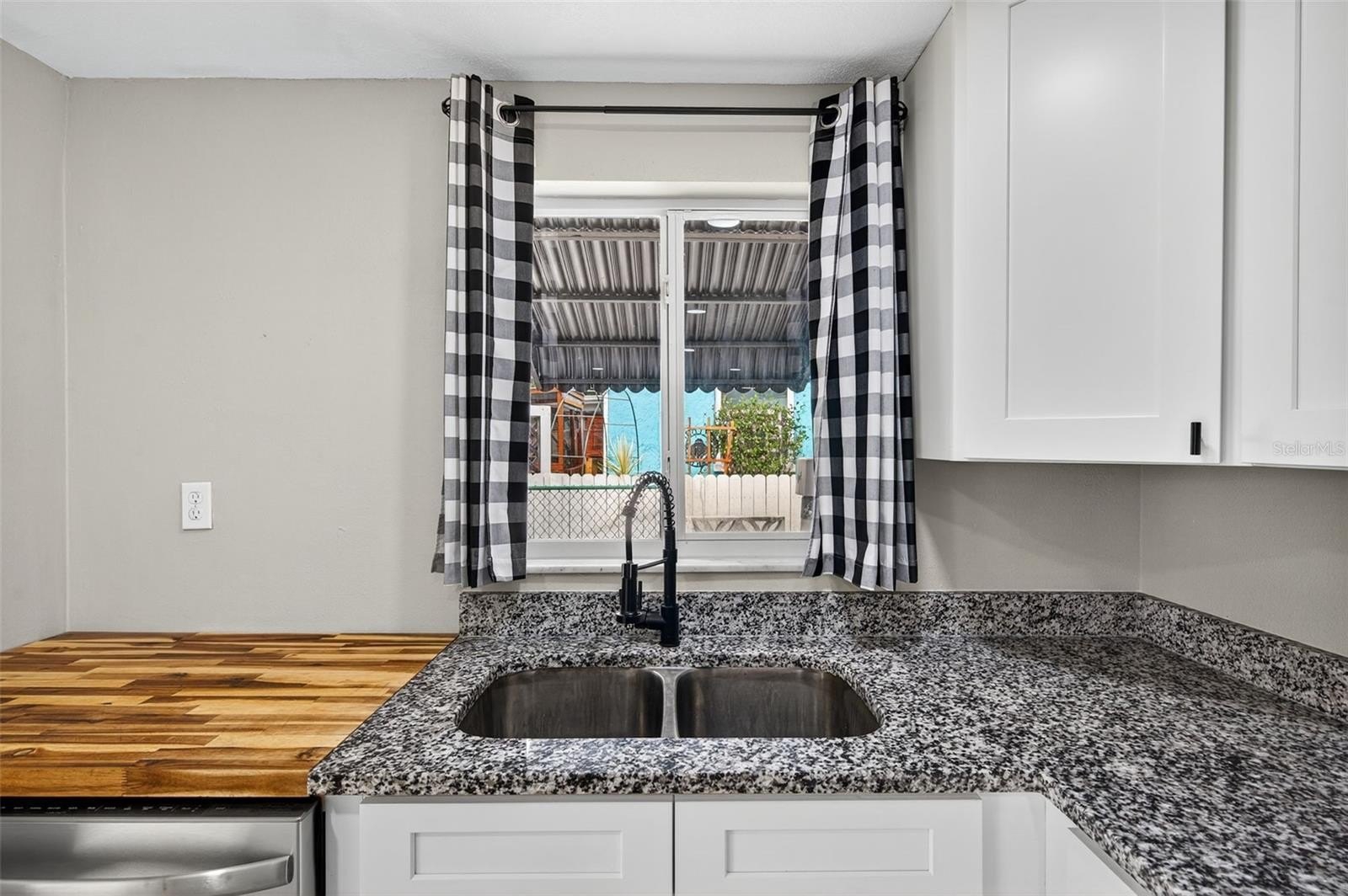 The remodeled kitchen is a true centerpiece, featuring crisp white shaker cabinetry, granite countertops paired with a stylish butcher-block accent, stainless steel appliances, built-in pantry storage, and even a matching cabinet extension in the dining space for extra functionality.