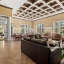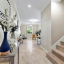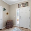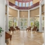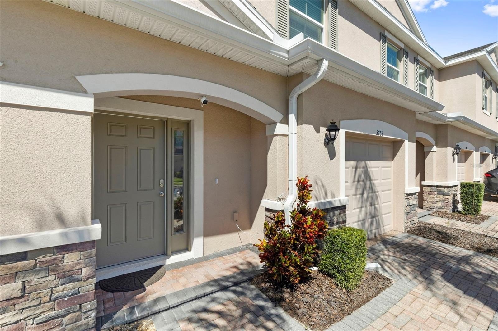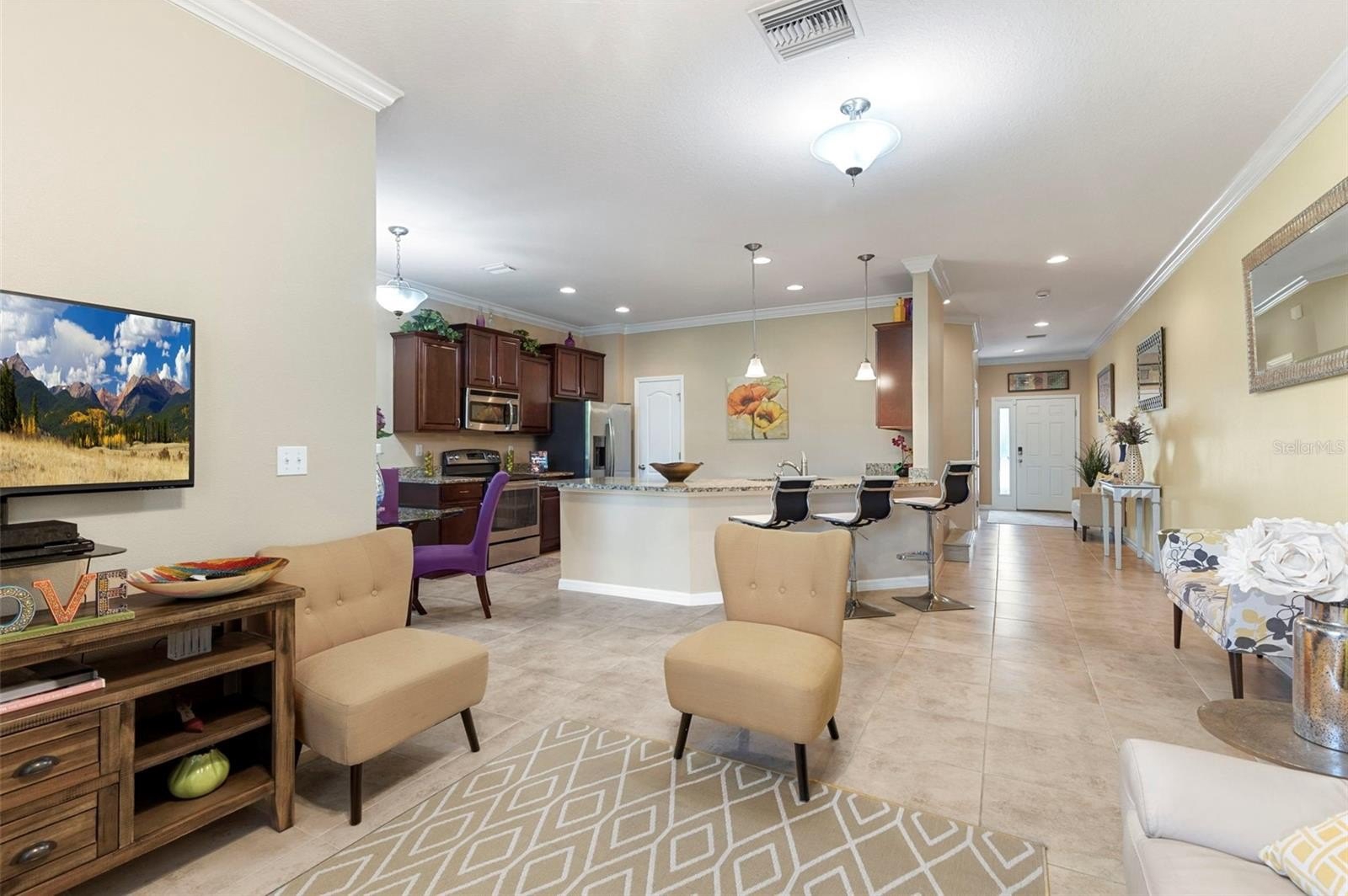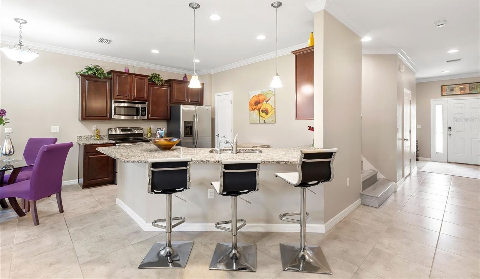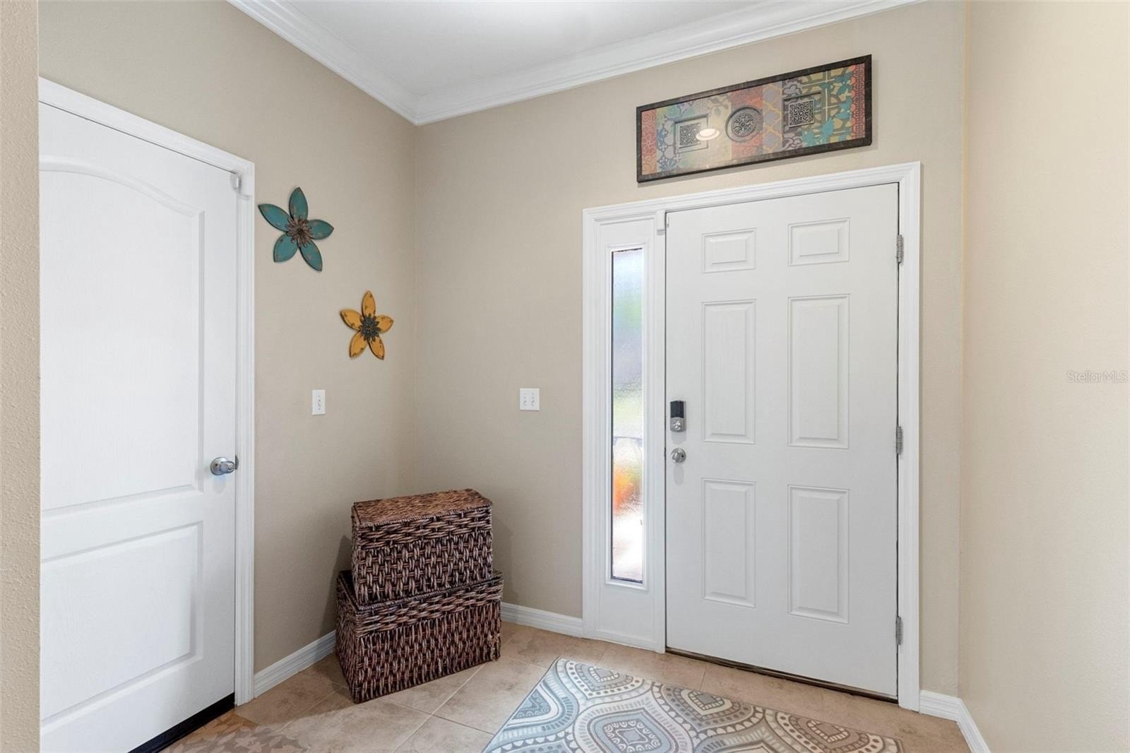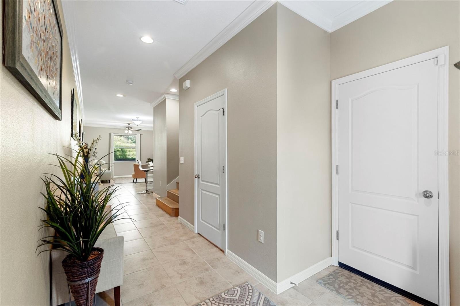 The property captivates from the start with its paver driveway, tasteful exterior lighting, and lush tropical landscaping. Stone-accented pillars frame the entryway, adding architectural depth and timeless curb appeal. Upon entering, soft natural light cascades through the space, creating a bright and airy welcome. Crown molding flows gracefully throughout, adding a refined finishing touch. The foyer offers the perfect nook for a cozy seating area or decorative console, setting the tone for the warmth that continues within.