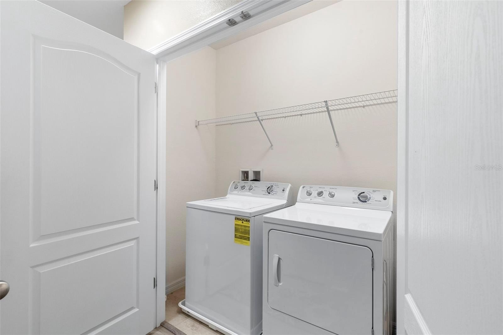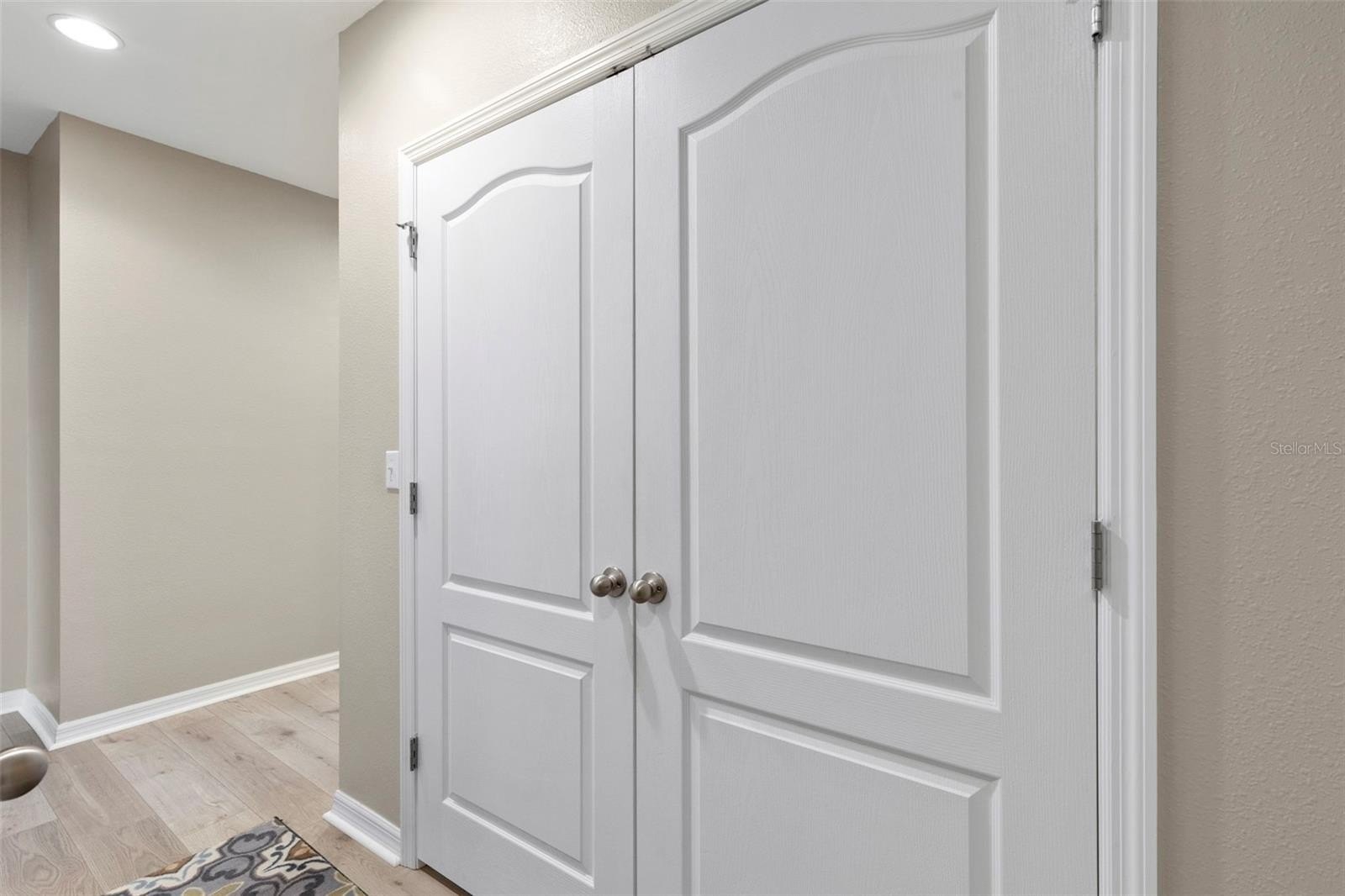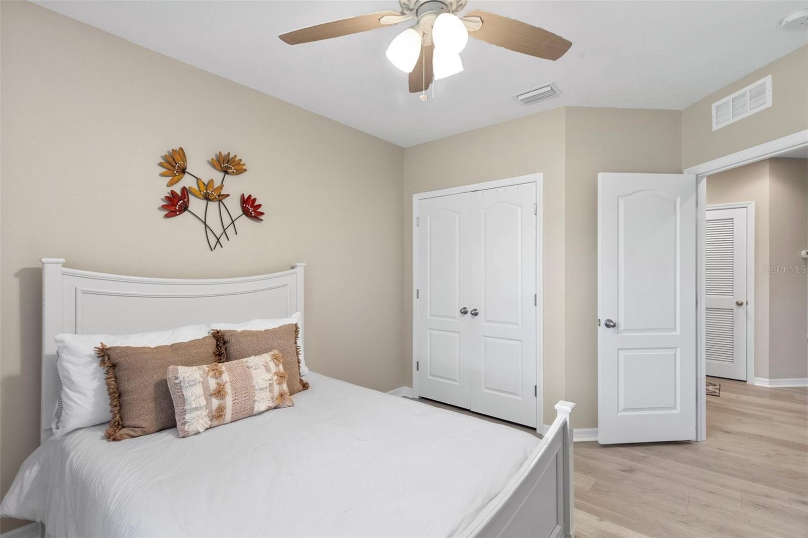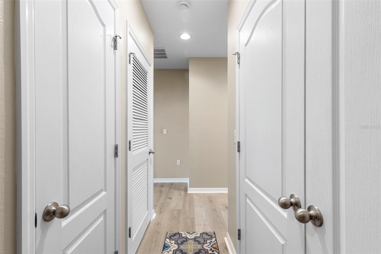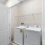 Upstairs, the laundry closet with shelving is conveniently located near all three bedrooms. The two secondary bedrooms are spacious and versatile, each with generous closet space. The full guest bathroom features solid wood cabinetry, sleek fixtures, and a combination tub and shower.