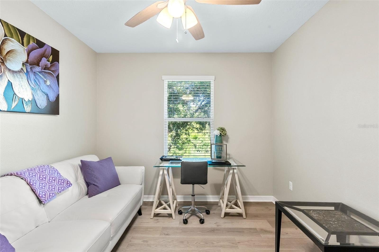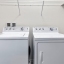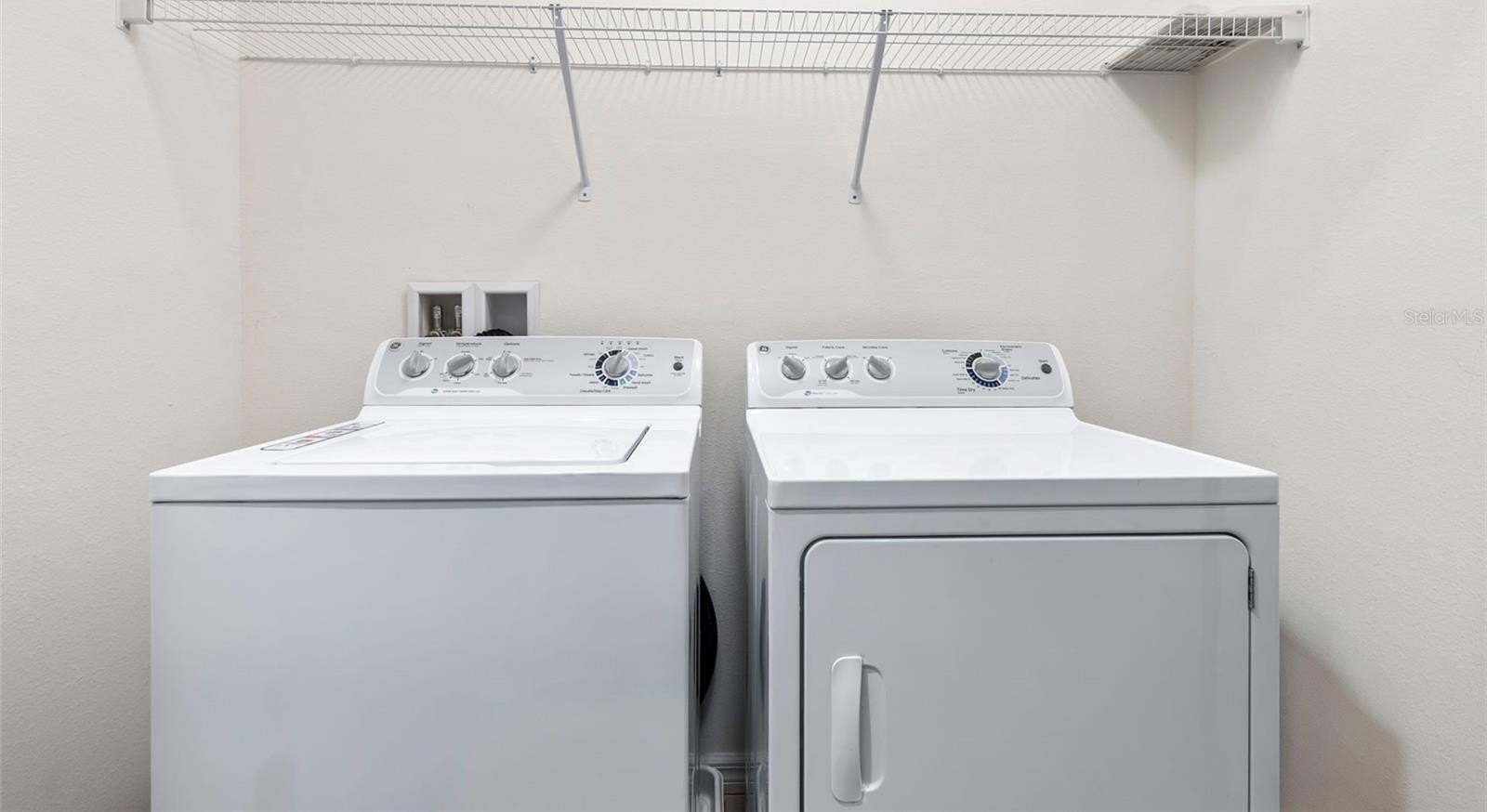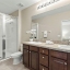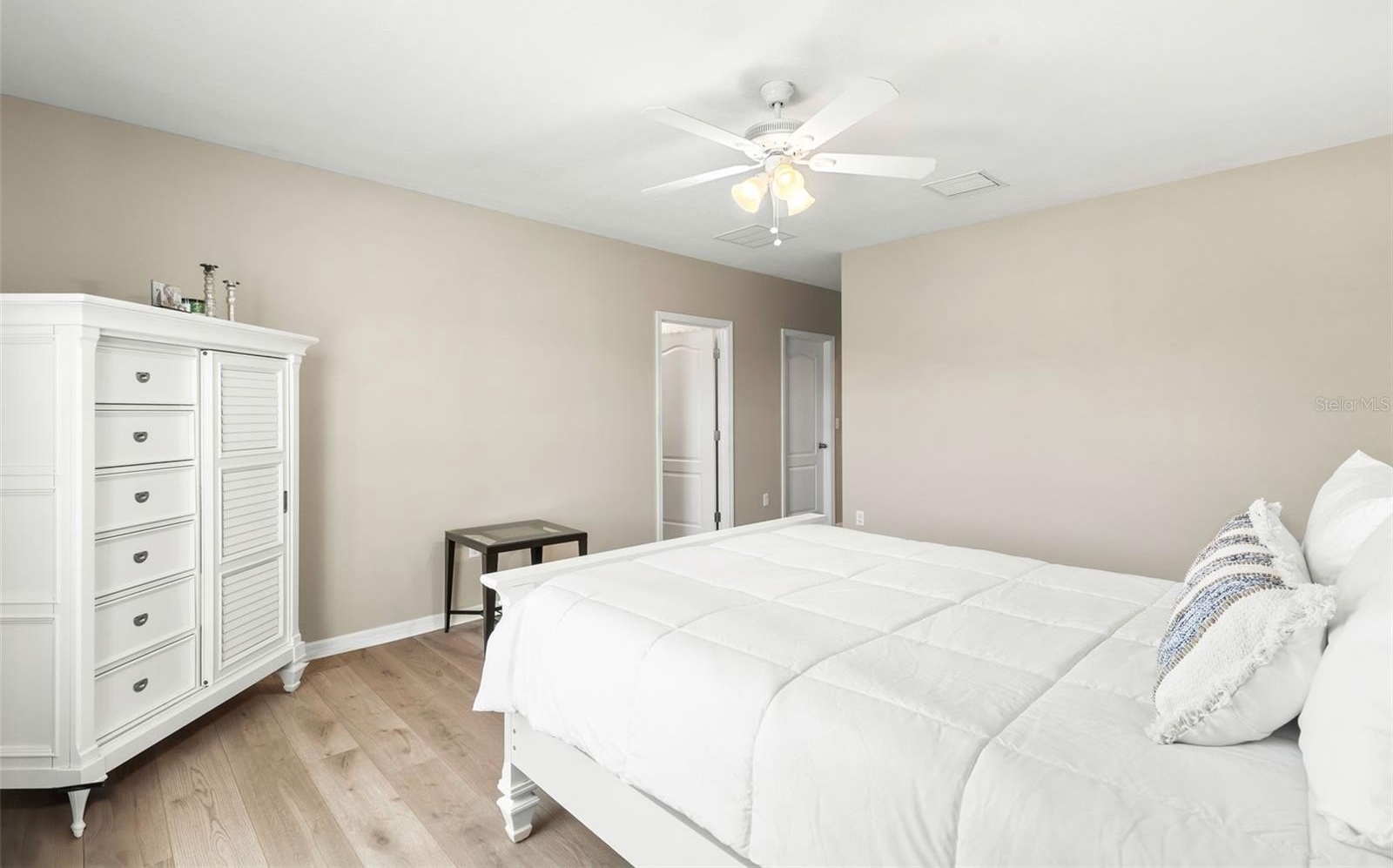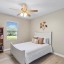 Upstairs, the laundry closet with shelving is conveniently located near all three bedrooms. The two secondary bedrooms are spacious and versatile, each with generous closet space. The full guest bathroom features solid wood cabinetry, sleek fixtures, and a combination tub and shower.