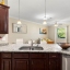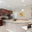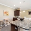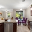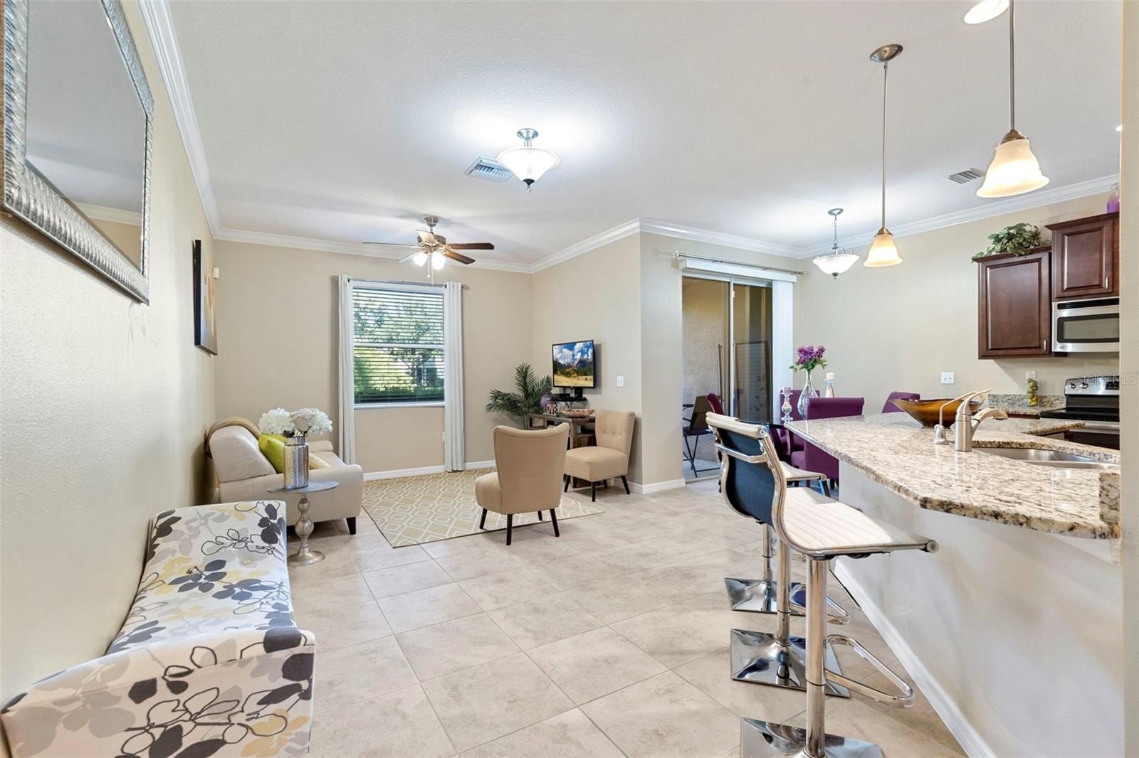 The home opens into a spacious open-concept living area designed for both relaxation and entertaining. The living room invites you to unwind, with large windows framing serene pond views and space for your favorite furnishings. Adjacent to the living area, the gourmet kitchen showcases solid wood cabinetry, granite countertops, recessed lighting, stainless steel appliances, a pantry, and a breakfast bar ideal for casual dining. Beyond the kitchen, the dinette area is bathed in natural light through sliding glass doors, offering a tranquil pond backdrop—perfect for intimate meals or quiet mornings.