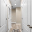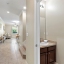 Just off the foyer is access to the one-car garage with epoxy-coated flooring—both stylish and practical. Down the hallway, a half bathroom features a solid wood vanity and modern fixtures, seamlessly blending function and design.