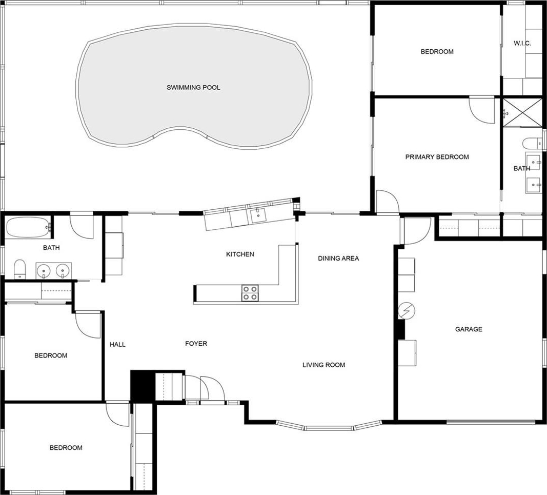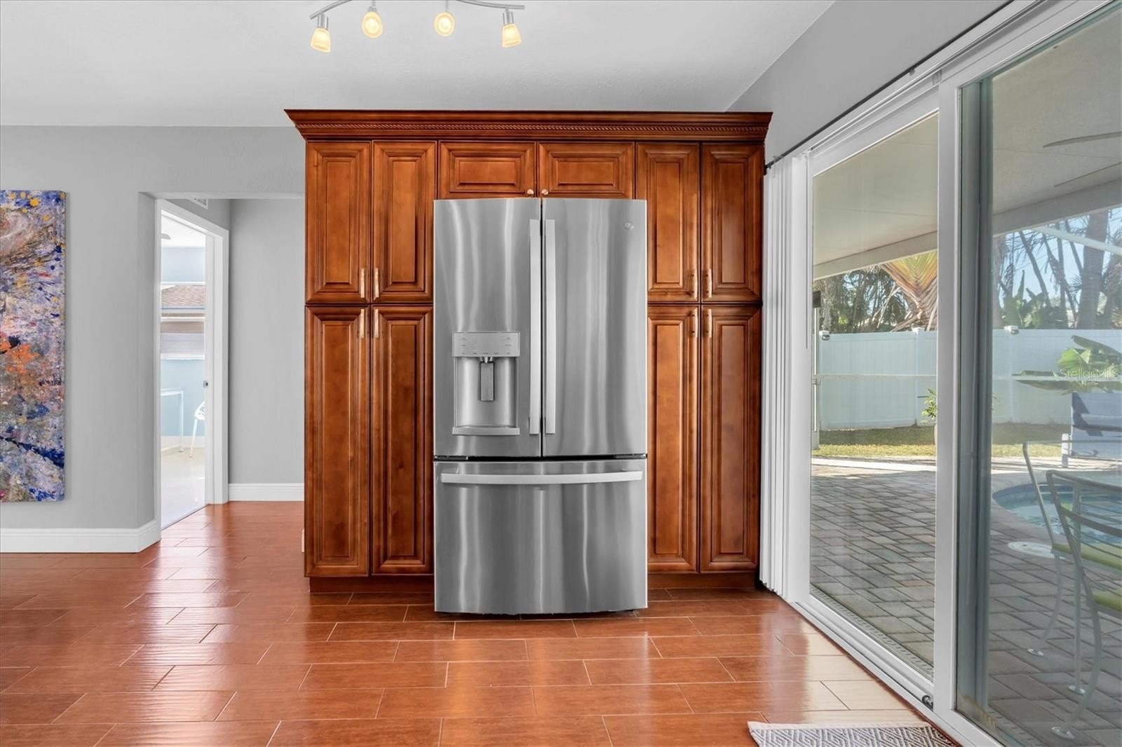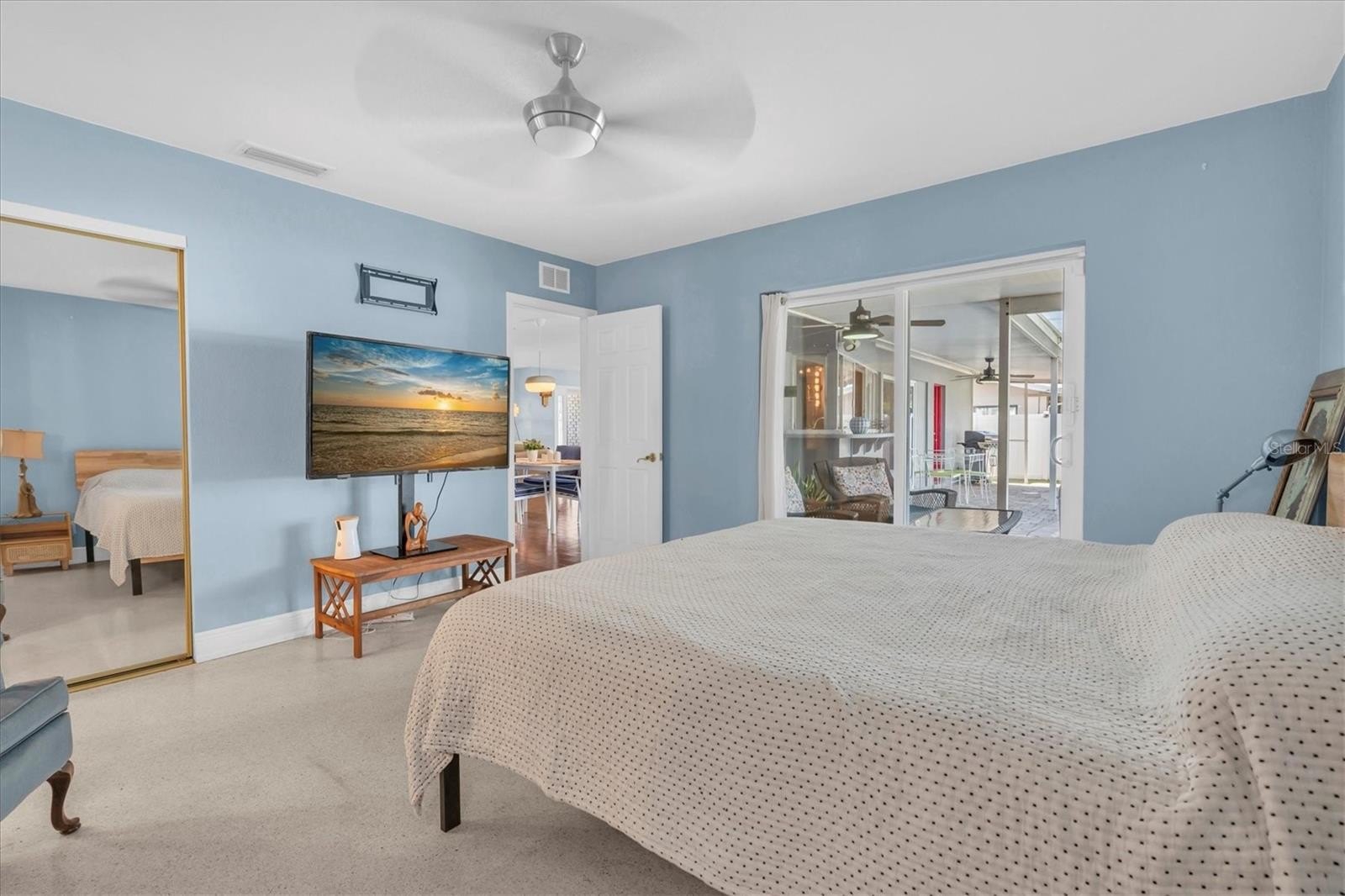 This home features a desirable split floor plan, ensuring privacy for everyone, while the bedrooms add vintage charm with classic and durable Terrazzo floors. The large primary suite is a true retreat, complete with glass sliding doors that open directly to the sparkling pool area, extending your living space outdoors. The ensuite primary bathroom features a walk-in shower and a spacious linen closet, offering comfort, convenience, and thoughtful storage. The adjoining 4th bedroom, also with sliding glass doors to the pool, offers incredible versatility—ideal as a nursery, home office, workout studio, or custom walk-in closet. Enjoy superior organization with custom-designed closets throughout the home. The dining area also features sliding glass doors that seamlessly blend indoor and outdoor living.