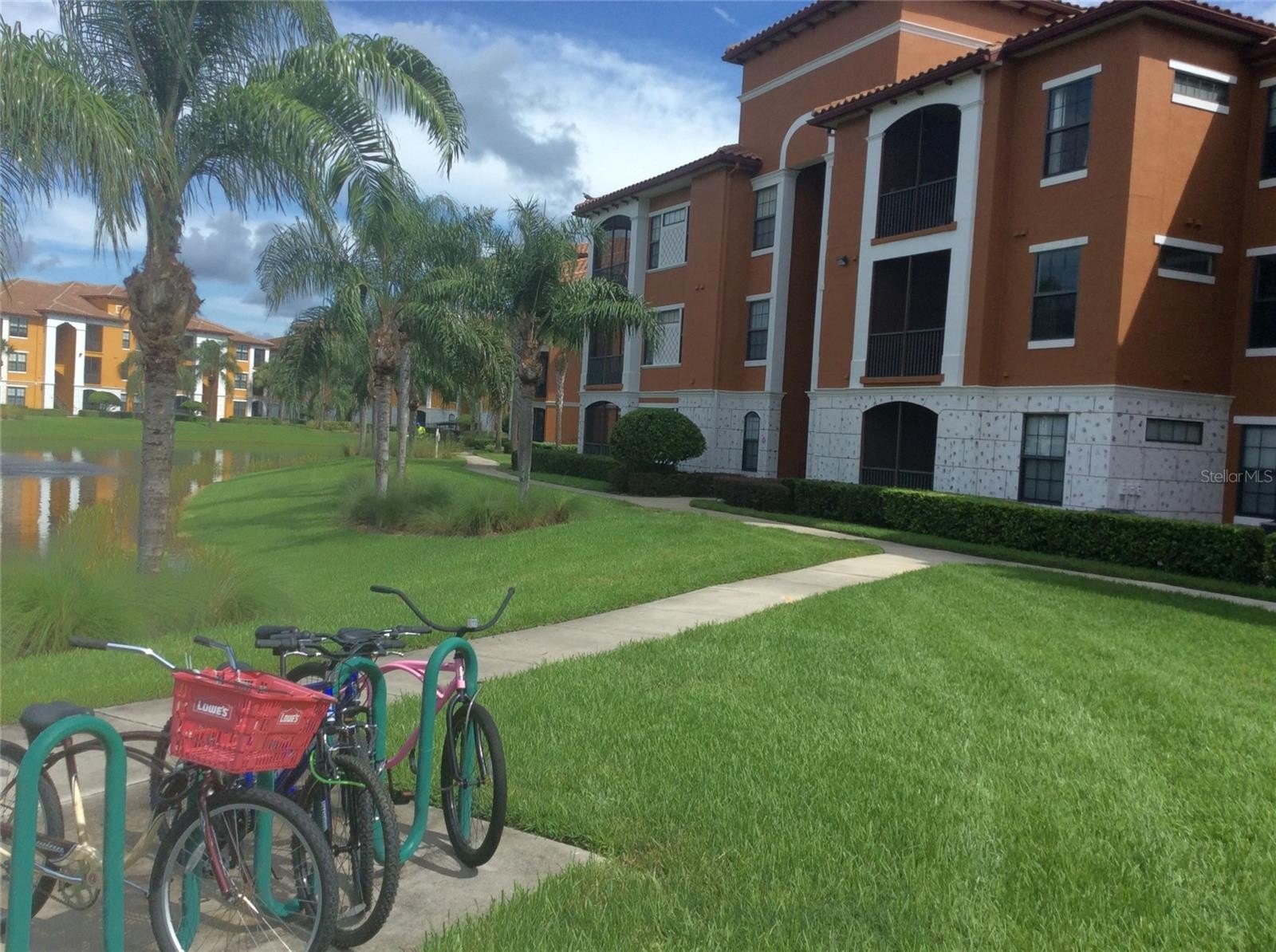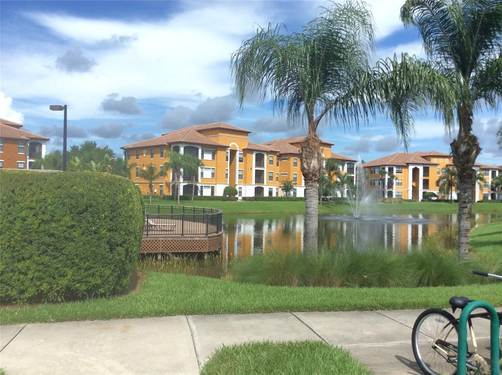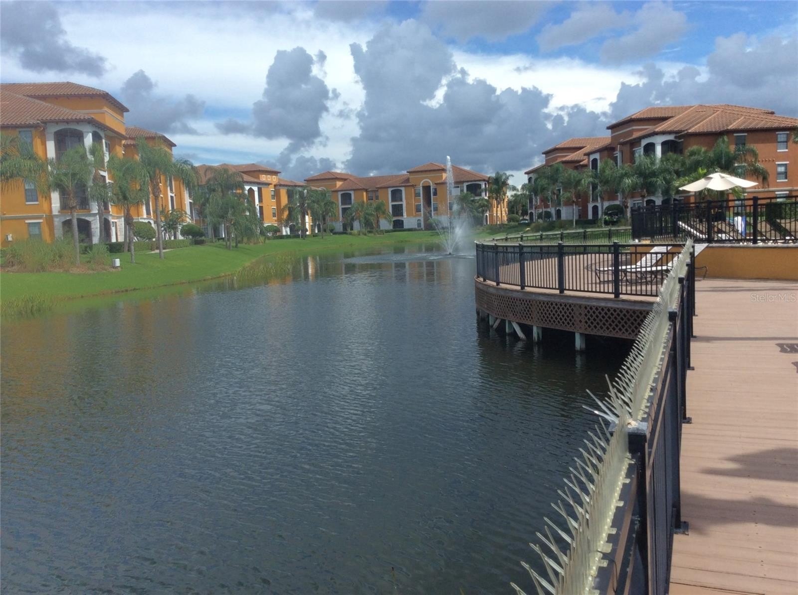 Serenata condominium is a gated community with a resort-style setting, centered around a scenic lake with fountains and a walking path.