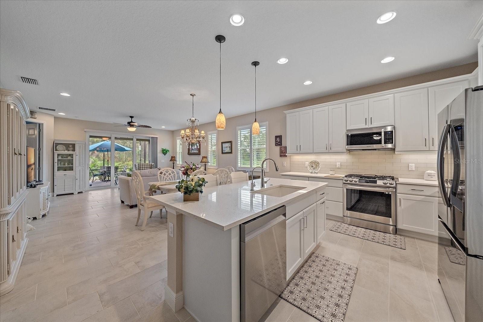 DESIGNER KITCHEN with 42” CABINETRY, TOP-OF-THE-LINE STAINLESS STEEL APPLIANCES, TILE BACKSPLASH & OVERSIZED ISLAND perfect for entertaining. Natural Gas for stove, dryer and lanai grill hookup.