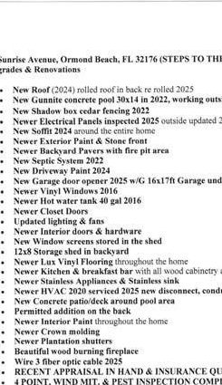 BUYER'S FINANCING FELL THROUGH! THIS IS A GOLDEN OPPORTUNITY TO STEP INTO A BEAUTIFUL BEACH HOUSE W/ NEW POOL PRICED BELOW APPRAISED VALUE! THE APPRAISAL'S IN HAND, THE INSPECTIONS COMPLETED,INSURANCE QUOTE,SURVEY DONE,TITLE INS. SEARCH DONE! THE FAMILY IS PACKING & MOVING SALE! THIS BEAUTIFUL POOL HOME HAS ONLY 5 HOUSES BETWEEN YOU & THE DIRECT BEACH ENTRY IN ORMOND BY THE SEA! THERE IS A LONG LIST OF RECENT UPDATES AVAILABLE! ROOF 2024,30X14 POOL 2022,SEPTIC 2022,PRIVACY FENCE 2022, ELECTRIC PANELS UPDATED 2025 & UPDATED PLUMBING,HVAC 2020 SERVICED 2025,HOT H20 TANK 2016,WINDOWS 2016 (NEW SCREENS),GARAGE DOOR OPENER 2025,12X8 STORAGE SHED, INSIDE LAUNDRY, GARAGE 17X16 UNDER AIR COND., UPDATED KITCHEN W/ WOOD CABINETS (SOFT CLOSE)GRANITE COUNTER,BREAKFAST BAR & STAINLESS APPLIANCES,BATHS UPDATED,STEP IN SHOWER,LIGHTING & FANS, LUXURY WATER PROOF FLOORING,WOOD BURNING FIREPLACE,PLANTATION SHUTTERS,CROWN MOLDING,PAVERS FRONT & BACK WITH FIRE PIT., OUTDOOR SHOWER,HUGE SCREENED PATIO!