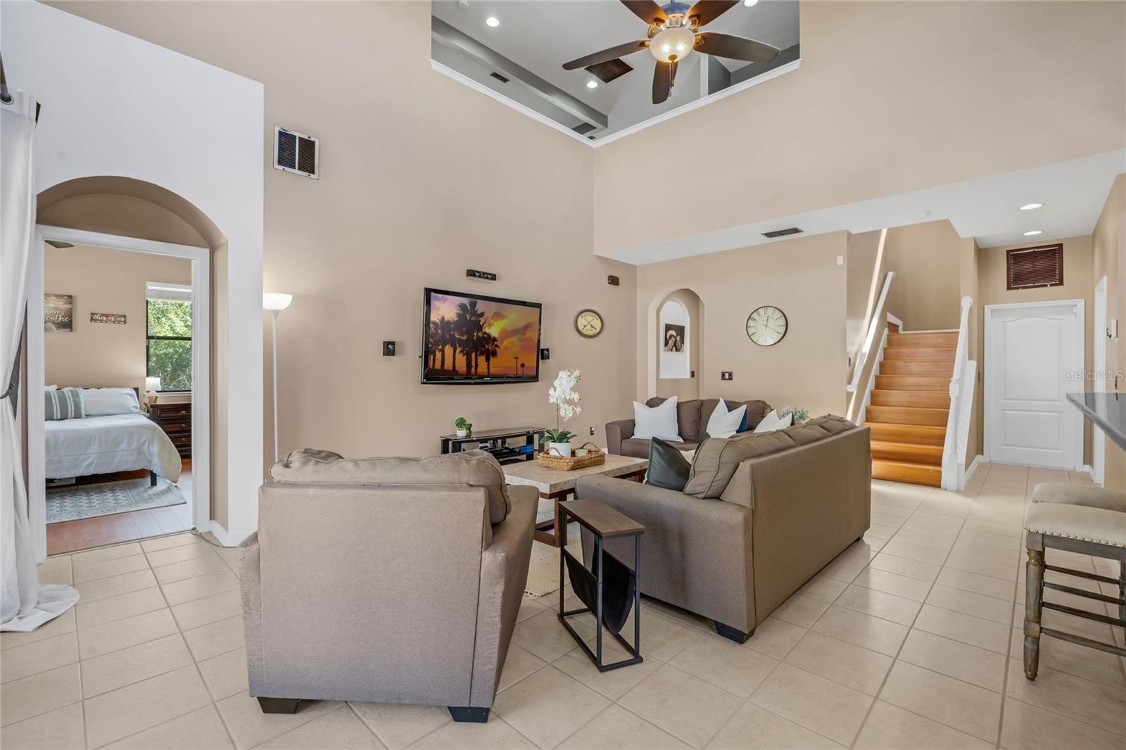 Step into a thoughtfully-designed floor plan featuring a flexible front living/dining area that adapts to your needs—perfect as a formal entertaining space or whatever you desire. The heart of the home lies in the open-concept kitchen and family room with gorgeous high ceilings and tons of natural light. The kitchen flows seamlessly into the dining area and expansive family room, framed by sliding glass doors that open to a tranquil screened-in back porch and solar-heated pool, creating the ideal indoor-outdoor lifestyle for relaxing or entertaining year-round.