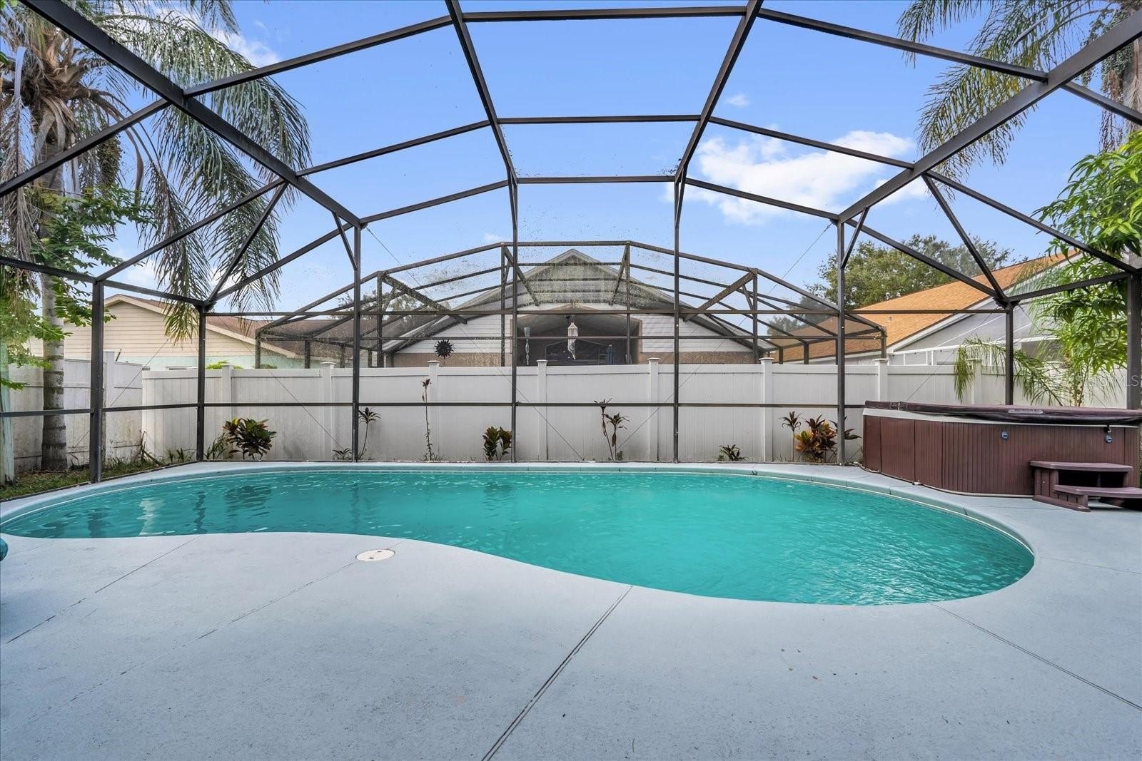 The split floor plan provides comfort and privacy, while the spacious living areas open to a fully fenced backyard — your own private retreat with a sparkling pool, separate hot tub, and covered lanai, perfect for relaxing or hosting outdoor gatherings.