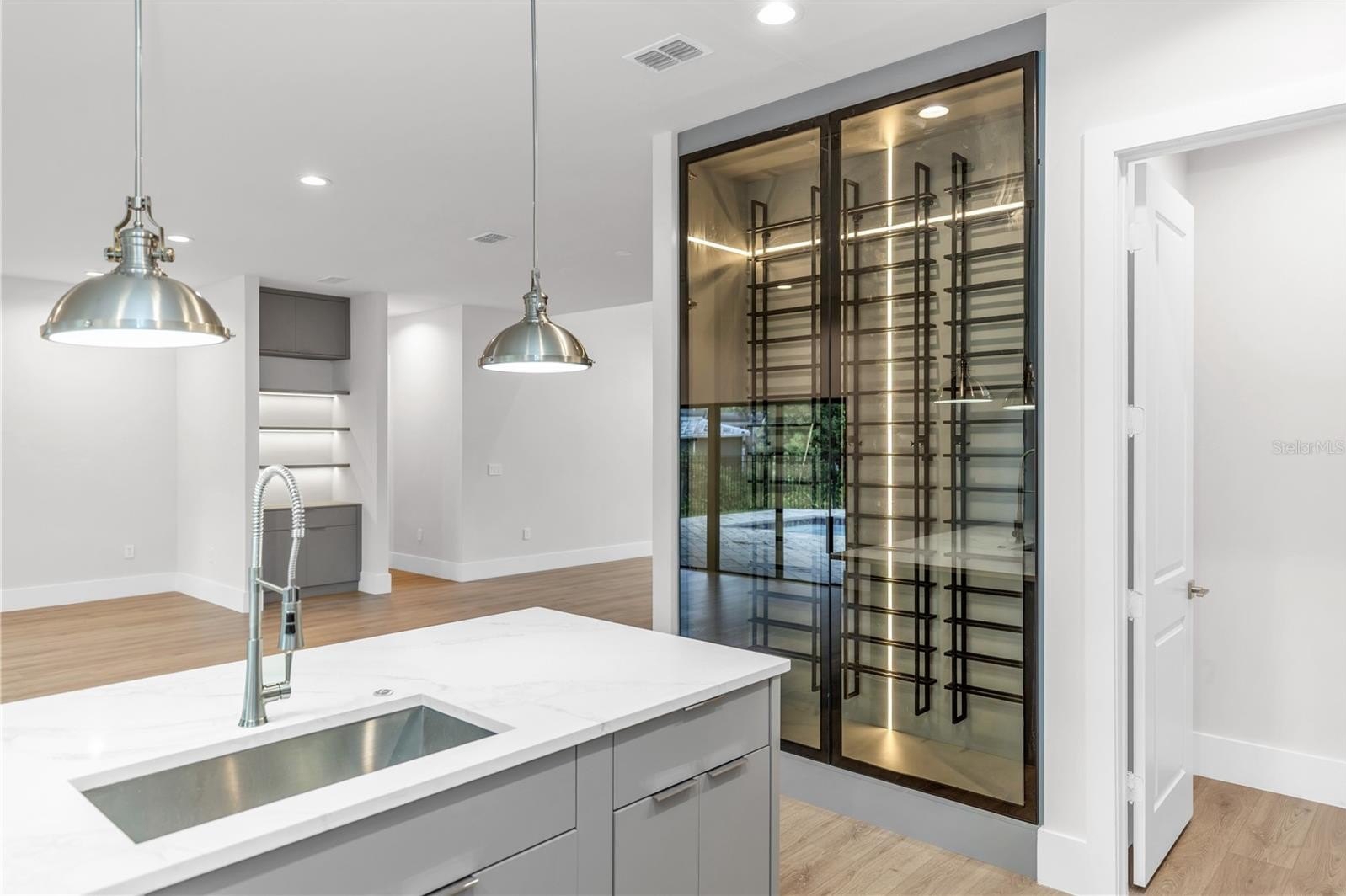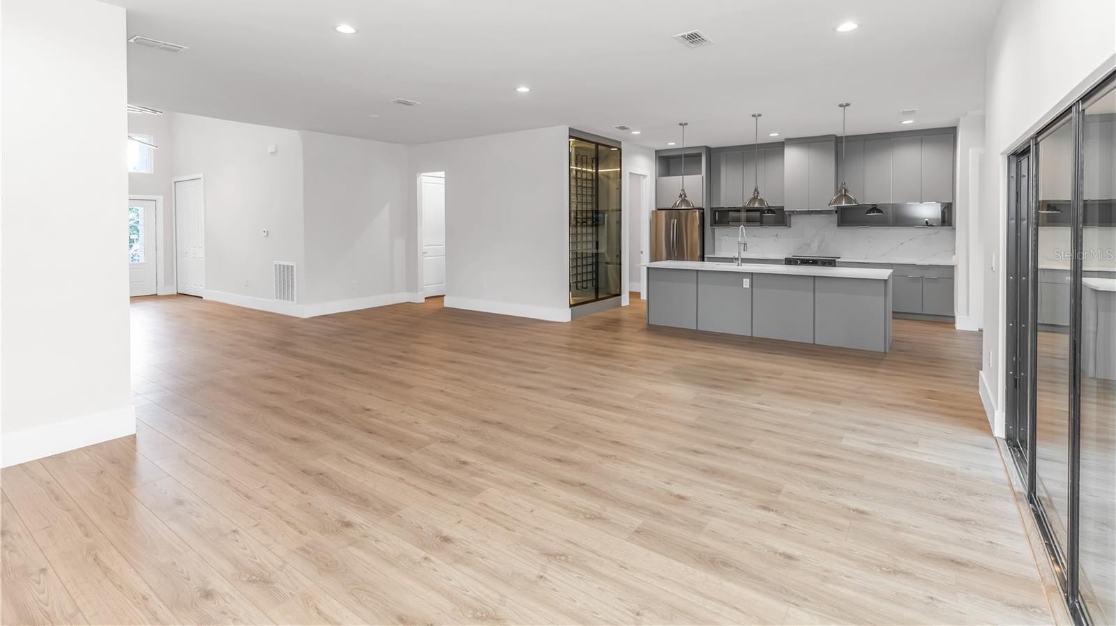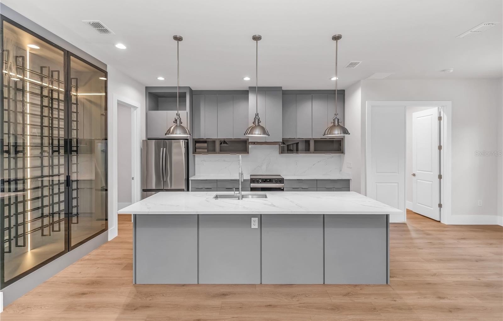At the heart of the home is a designer kitchen boasting quartz countertops, stainless steel appliances, and a custom LED-lit wine cabinet—perfect for the culinary enthusiast. The seamless flow into the dining and living areas creates an ideal space for entertaining, all while overlooking your private backyard oasis.