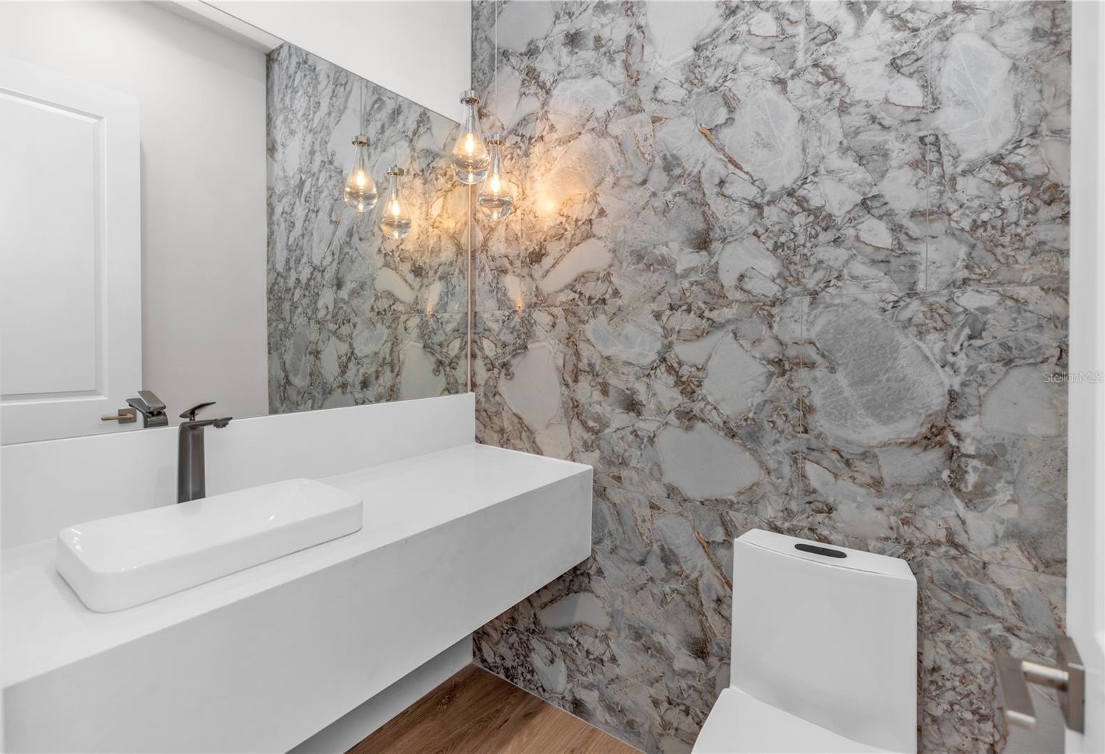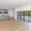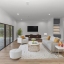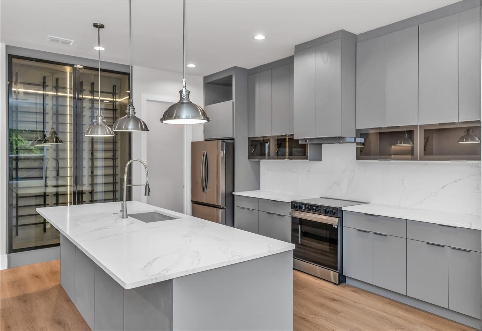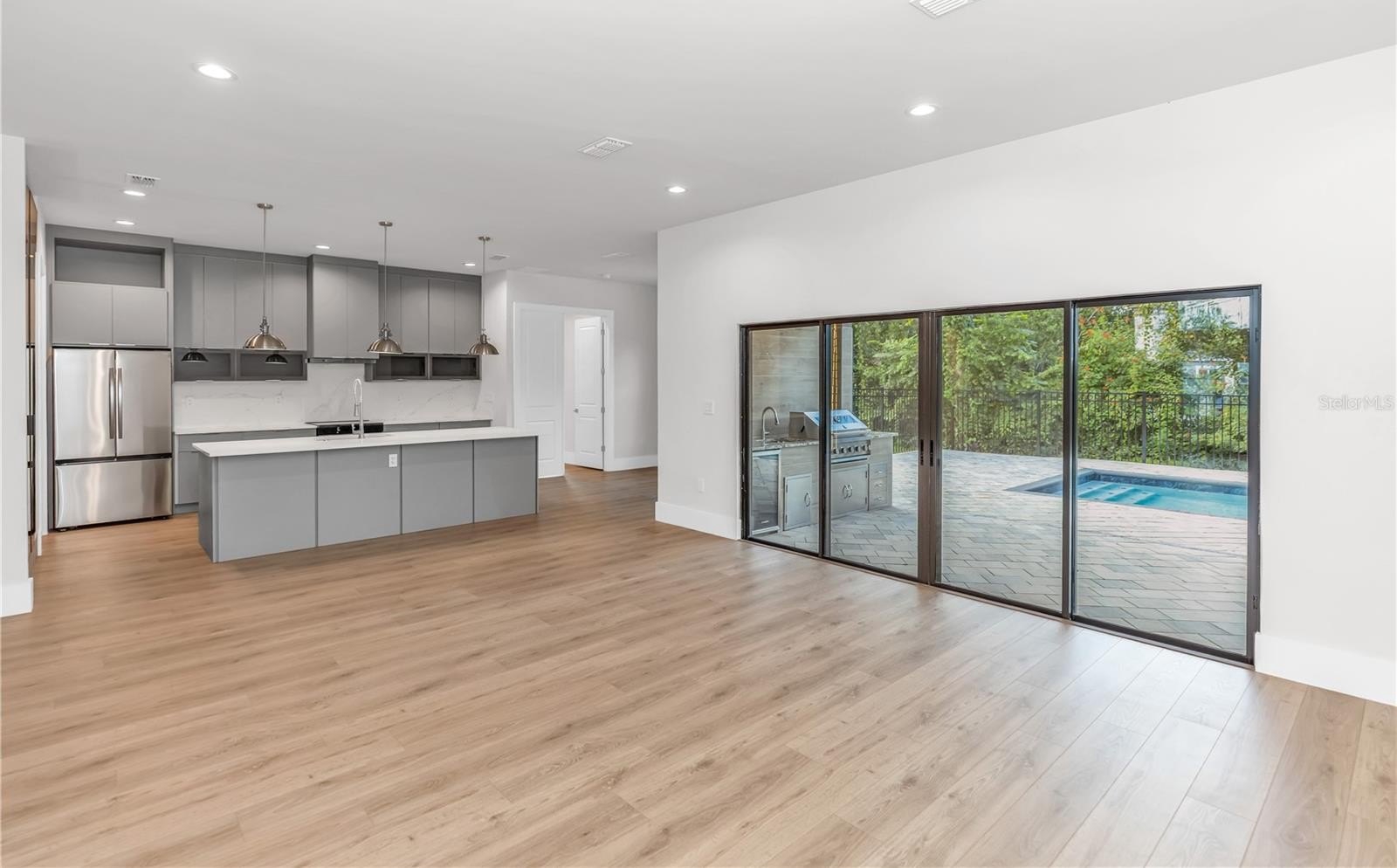 At the heart of the home is a designer kitchen boasting quartz countertops, stainless steel appliances, and a custom LED-lit wine cabinet—perfect for the culinary enthusiast. The seamless flow into the dining and living areas creates an ideal space for entertaining, all while overlooking your private backyard oasis.