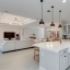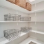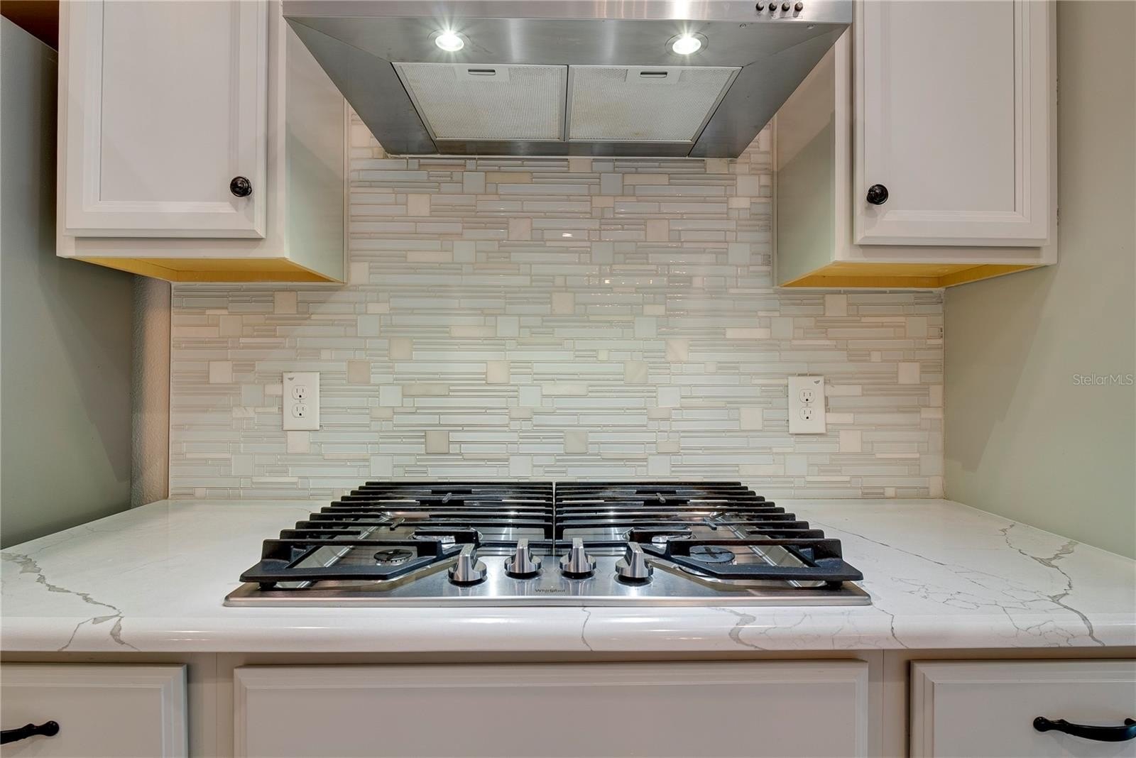 Designer upgrades run throughout the home, including custom accent walls, art deco wallpaper, upgraded lighting, lush landscaping, crown molding, recessed lighting, newer bedroom fans, custom wall detailing, and an oversized garage with overhead storage. The gourmet kitchen serves as the heart of the home, offering a large island with pendant lighting, quartz countertops, upgraded cabinetry with a glass-front accent cabinet, soft-close drawers, a tile backsplash, stainless steel appliances, a gas stove, and a walk-in pantry with upgraded shelving.
