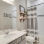 The true three-way split floor plan includes two front bedrooms with a full tub/shower bath, a third guest bedroom with its own full bath at the back, and a privately tucked-away primary suite with dual closets and a spa-inspired bath with quartz counters, dual vanities, a freestanding soaking tub, and an all-glass walk-in shower.