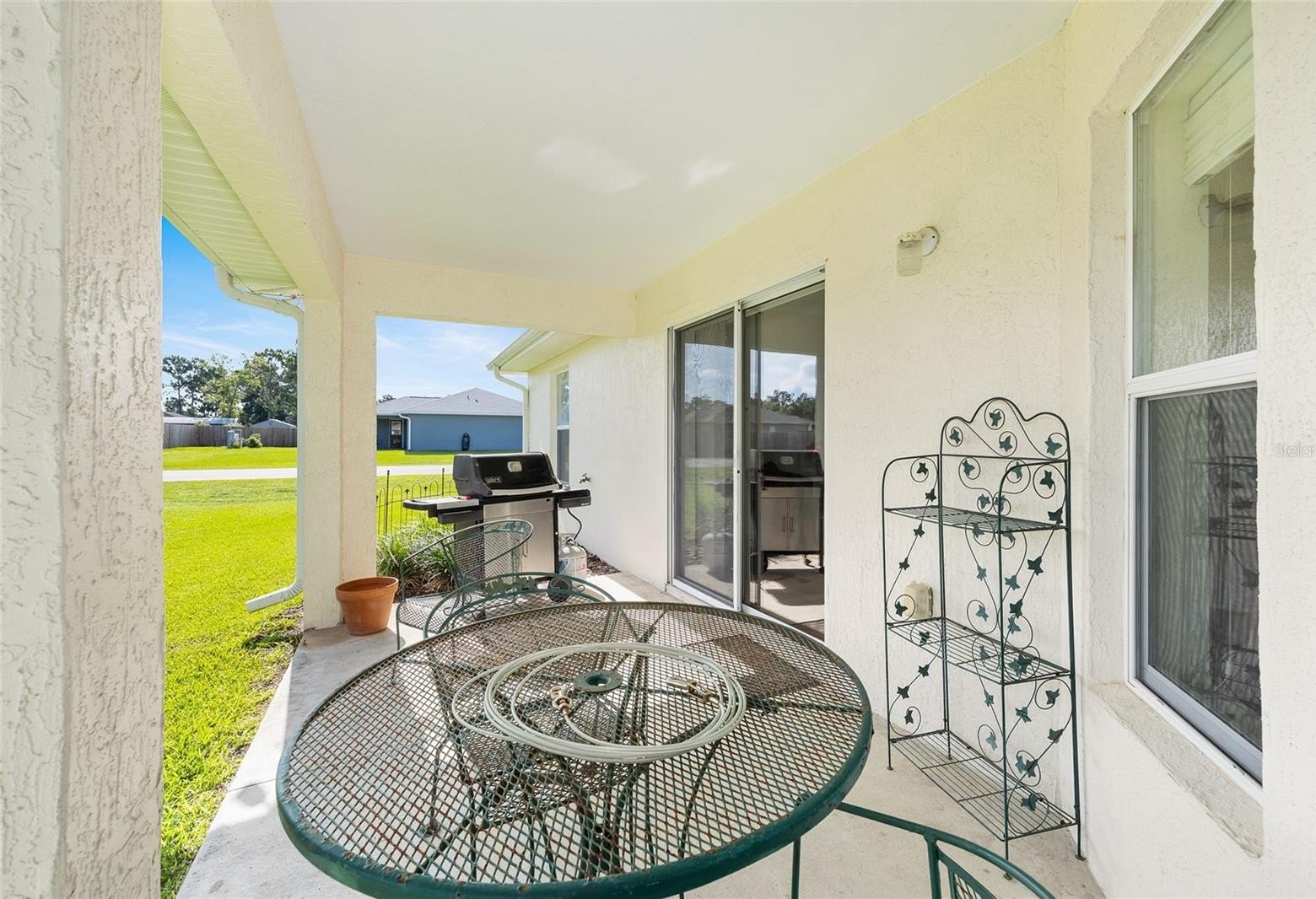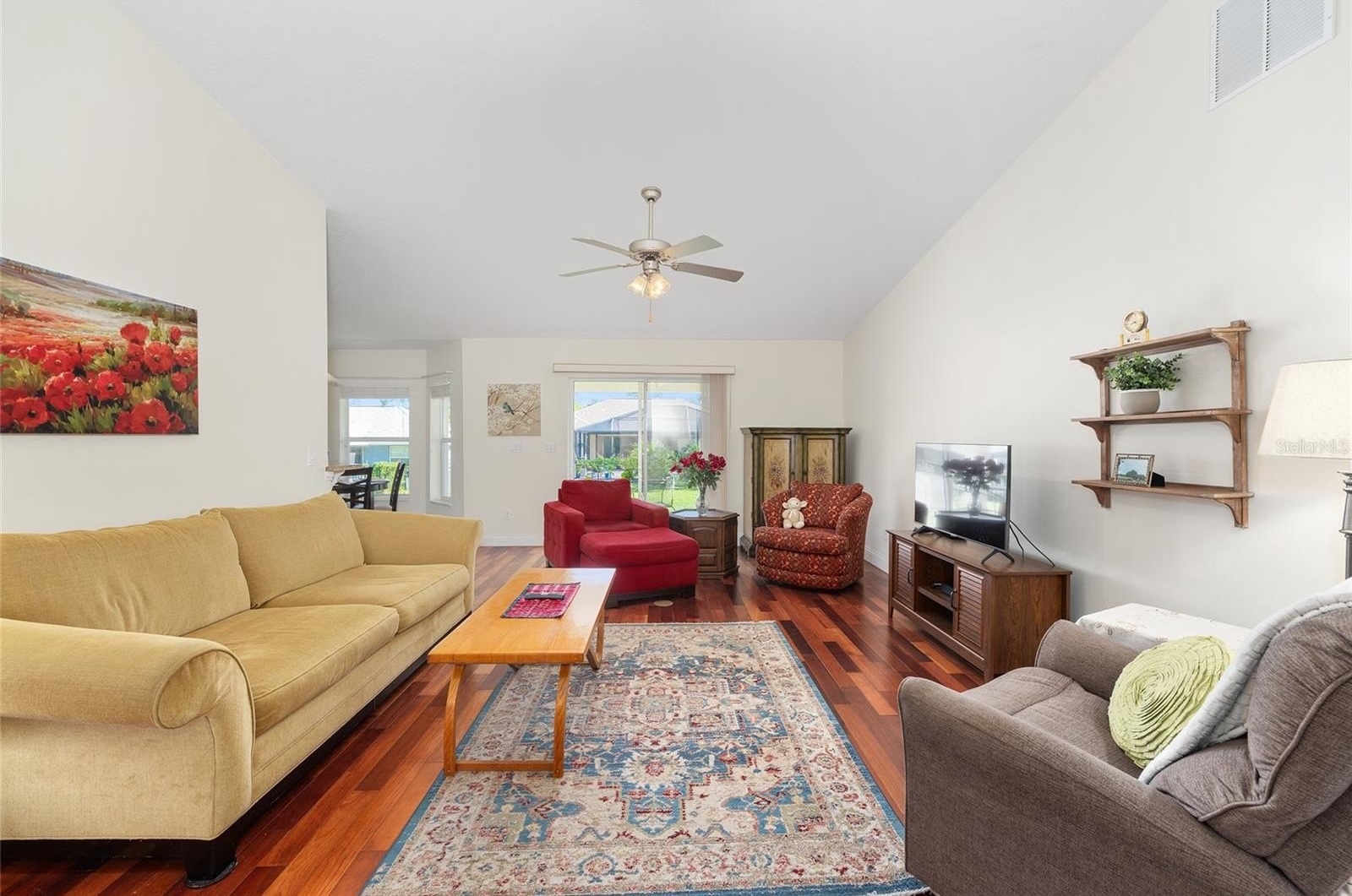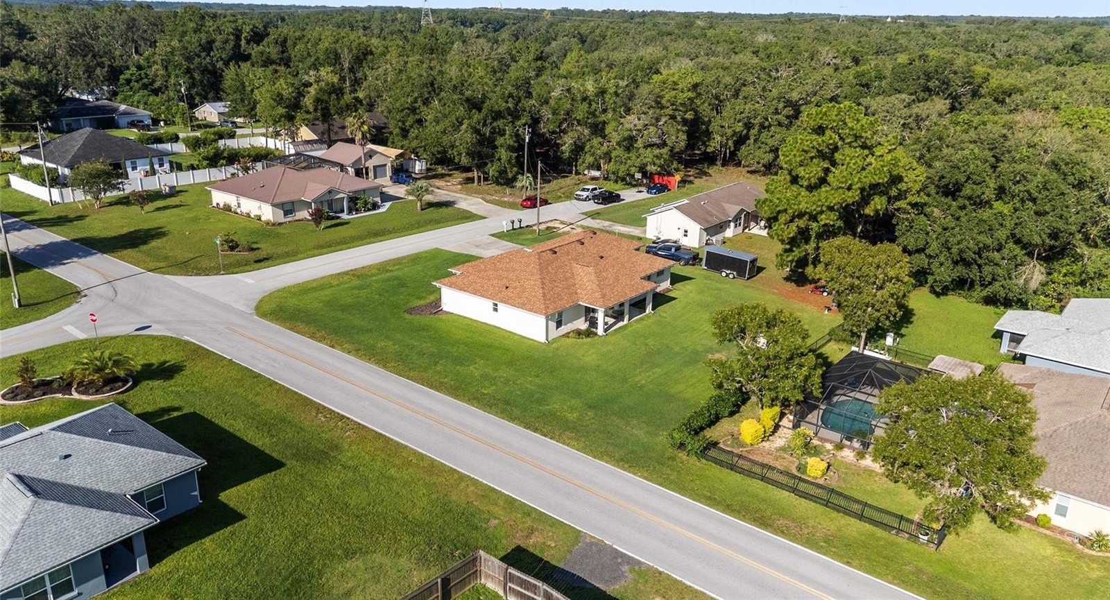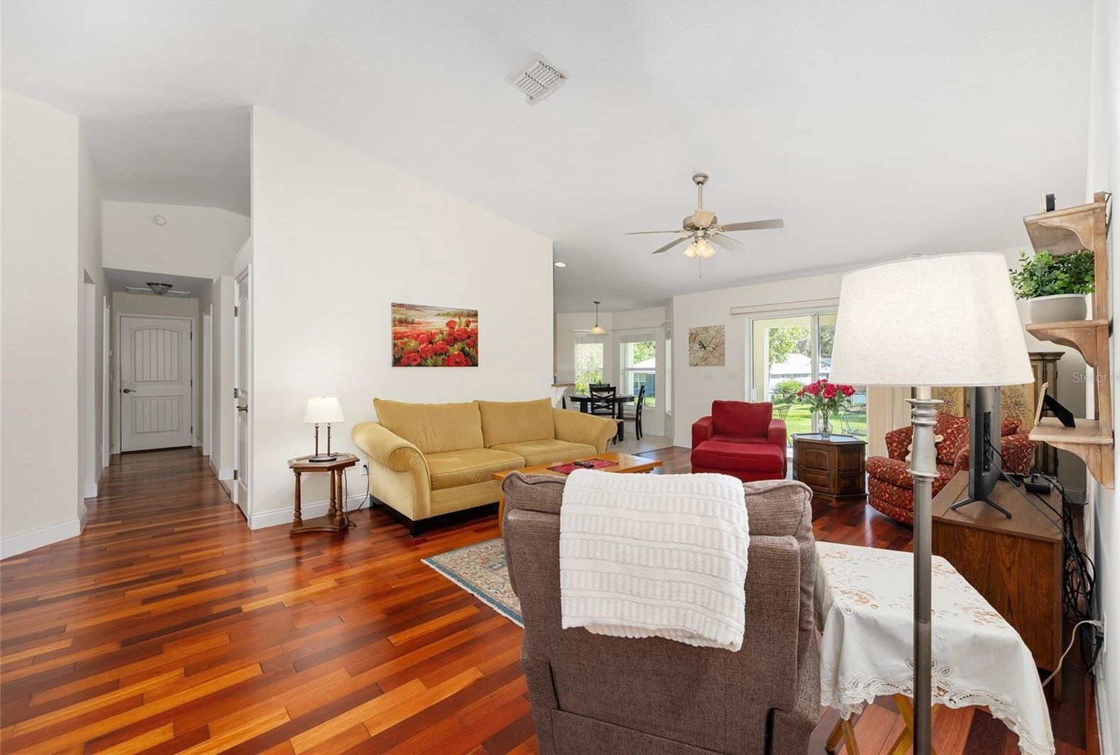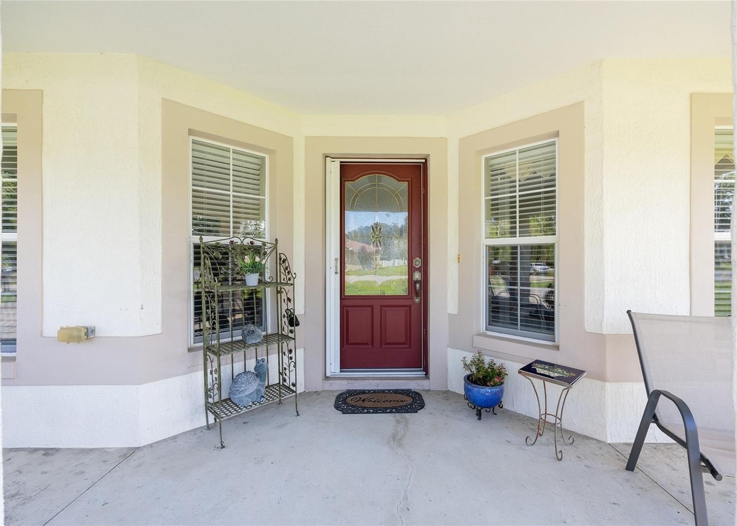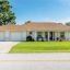 Ideal Location & Impeccably Maintained home. Welcome to this beautifully cared-for 3-bedroom, 2-bath block home in a golf cart-friendly community just across from The Villages – with no HOA and pride of original ownership evident throughout! Situated on a landscaped corner lot, this home offers both convenience and comfort in a sought-after Summerfield location. Step inside to find vaulted ceilings and natural light filling the space. The entry foyer opens to a formal dining room on one side and a private office with French doors on the other. The engineered hardwood flooring flows through the main living areas, with carpeted bedrooms in a desirable split-bedroom layout. The spacious living room features sliding doors that lead to a covered lanai, perfect for morning coffee or evening relaxation. The fully equipped kitchen boasts granite countertops, stainless steel appliances, a pantry closet, and a casual dining nook for everyday meals. The primary suite offers a large walk-in closet and an ensuite bathroom with a dual granite vanity, garden tub, and roll-in shower. A privacy door separates the guest wing, which includes two additional bedrooms and a full bath with granite counters. Practical features include a laundry room with extra project or storage space, and a generously sized 28' x 24' garage with room for two cars plus a golf cart. Enjoy relaxing on the covered front porch and appreciate the curb appeal of tasteful landscaping. New Roof 2024, New well pump 2025 and new HVAC 2018. This is a rare opportunity to enjoy peaceful living with easy access to all the shopping and entertainment of The Villages—without the fees.