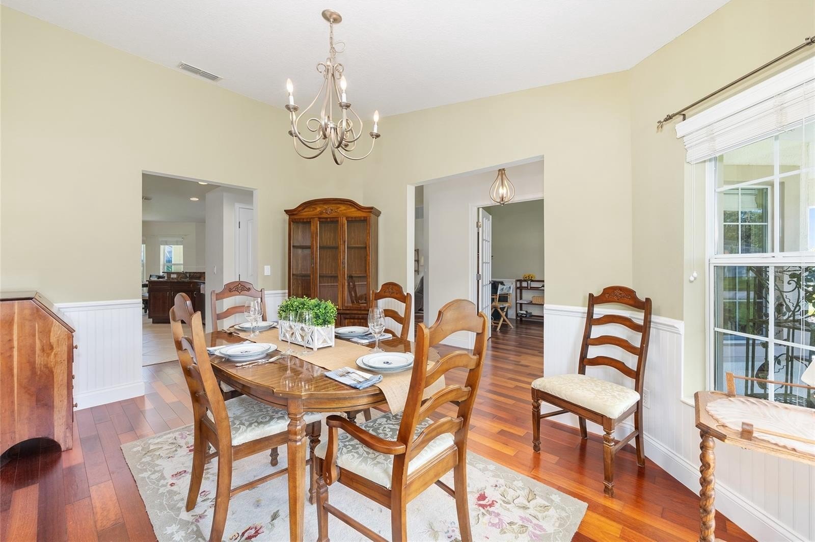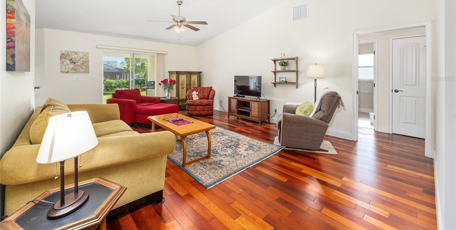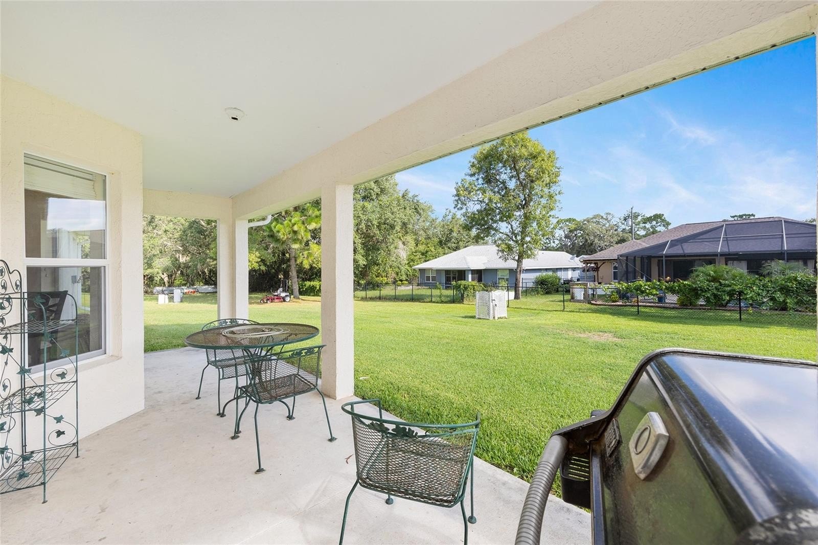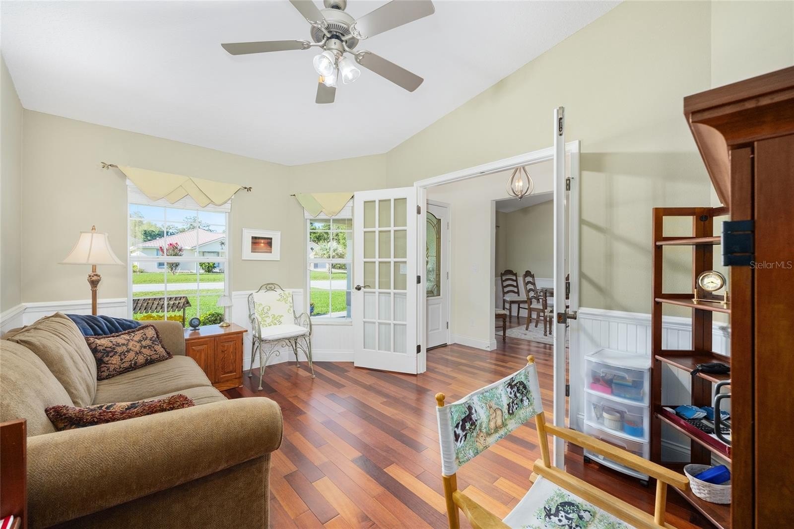 Ideal Location & Impeccably Maintained home. Welcome to this beautifully cared-for 3-bedroom, 2-bath block home in a golf cart-friendly community just across from The Villages – with no HOA and pride of original ownership evident throughout! Situated on a landscaped corner lot, this home offers both convenience and comfort in a sought-after Summerfield location. Step inside to find vaulted ceilings and natural light filling the space. The entry foyer opens to a formal dining room on one side and a private office with French doors on the other. The engineered hardwood flooring flows through the main living areas, with carpeted bedrooms in a desirable split-bedroom layout. The spacious living room features sliding doors that lead to a covered lanai, perfect for morning coffee or evening relaxation. The fully equipped kitchen boasts granite countertops, stainless steel appliances, a pantry closet, and a casual dining nook for everyday meals. The primary suite offers a large walk-in closet and an ensuite bathroom with a dual granite vanity, garden tub, and roll-in shower. A privacy door separates the guest wing, which includes two additional bedrooms and a full bath with granite counters. Practical features include a laundry room with extra project or storage space, and a generously sized 28' x 24' garage with room for two cars plus a golf cart. Enjoy relaxing on the covered front porch and appreciate the curb appeal of tasteful landscaping. New Roof 2024, New well pump 2025 and new HVAC 2018. This is a rare opportunity to enjoy peaceful living with easy access to all the shopping and entertainment of The Villages—without the fees.