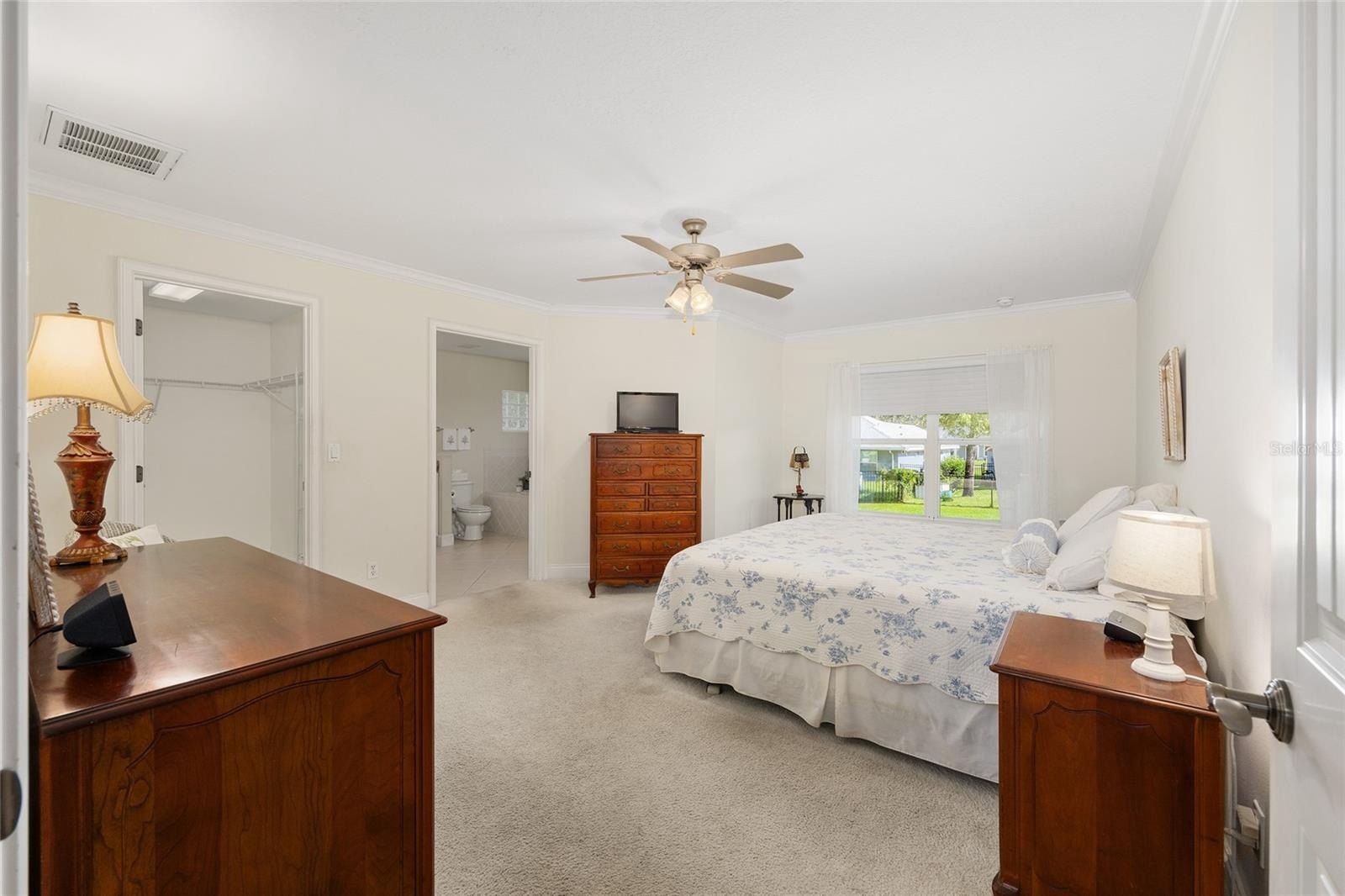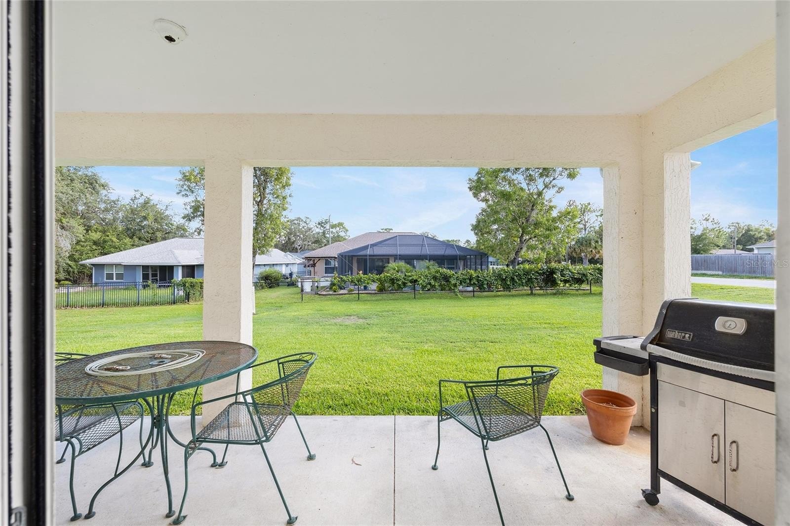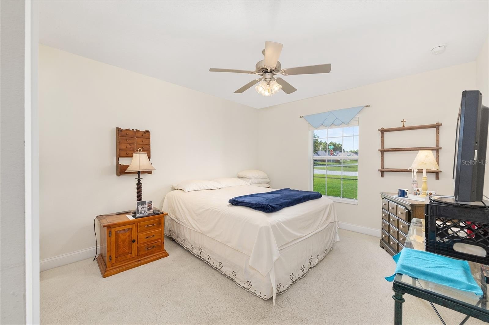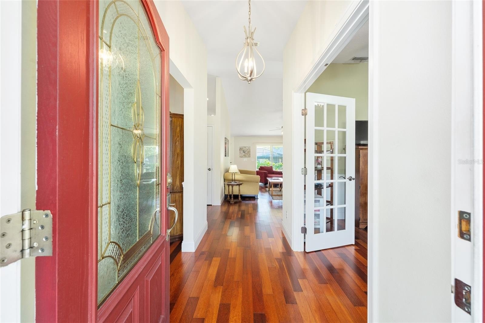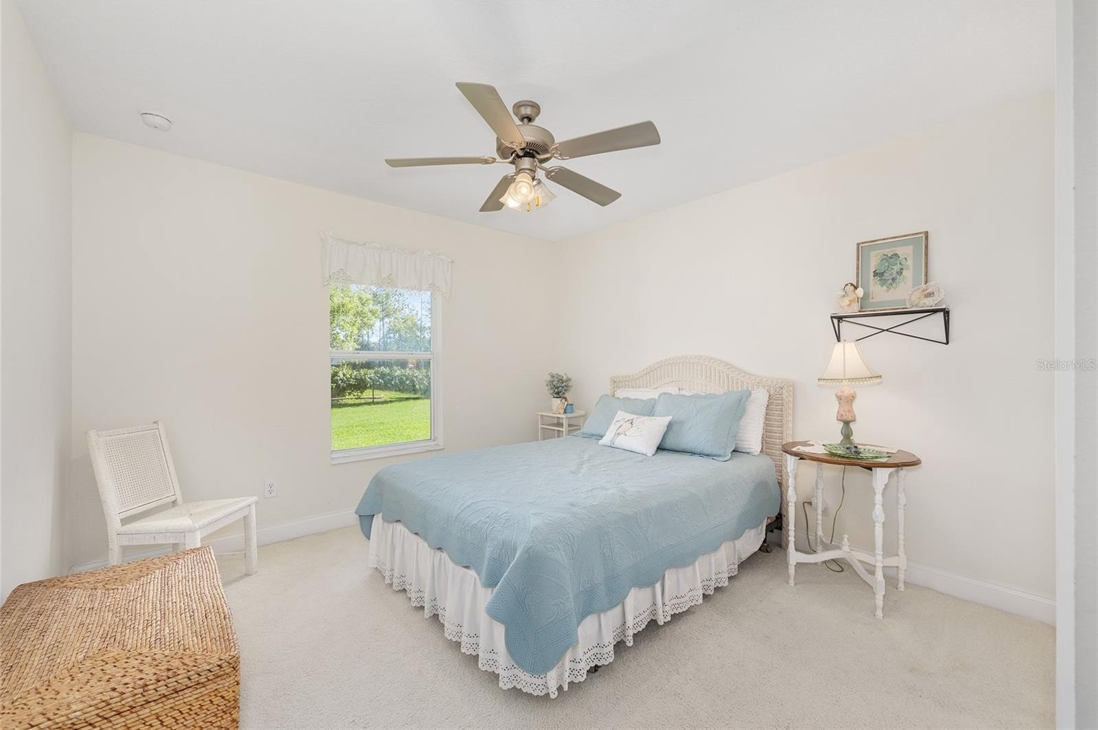 Ideal Location & Impeccably Maintained home. Welcome to this beautifully cared-for 3-bedroom, 2-bath block home in a golf cart-friendly community just across from The Villages – with no HOA and pride of original ownership evident throughout! Situated on a landscaped corner lot, this home offers both convenience and comfort in a sought-after Summerfield location. Step inside to find vaulted ceilings and natural light filling the space. The entry foyer opens to a formal dining room on one side and a private office with French doors on the other. The engineered hardwood flooring flows through the main living areas, with carpeted bedrooms in a desirable split-bedroom layout. The spacious living room features sliding doors that lead to a covered lanai, perfect for morning coffee or evening relaxation. The fully equipped kitchen boasts granite countertops, stainless steel appliances, a pantry closet, and a casual dining nook for everyday meals. The primary suite offers a large walk-in closet and an ensuite bathroom with a dual granite vanity, garden tub, and roll-in shower. A privacy door separates the guest wing, which includes two additional bedrooms and a full bath with granite counters. Practical features include a laundry room with extra project or storage space, and a generously sized 28' x 24' garage with room for two cars plus a golf cart. Enjoy relaxing on the covered front porch and appreciate the curb appeal of tasteful landscaping. New Roof 2024, New well pump 2025 and new HVAC 2018. This is a rare opportunity to enjoy peaceful living with easy access to all the shopping and entertainment of The Villages—without the fees.
