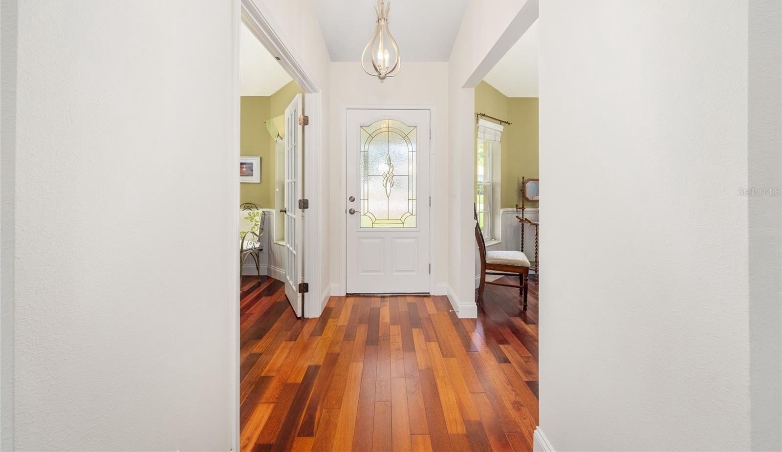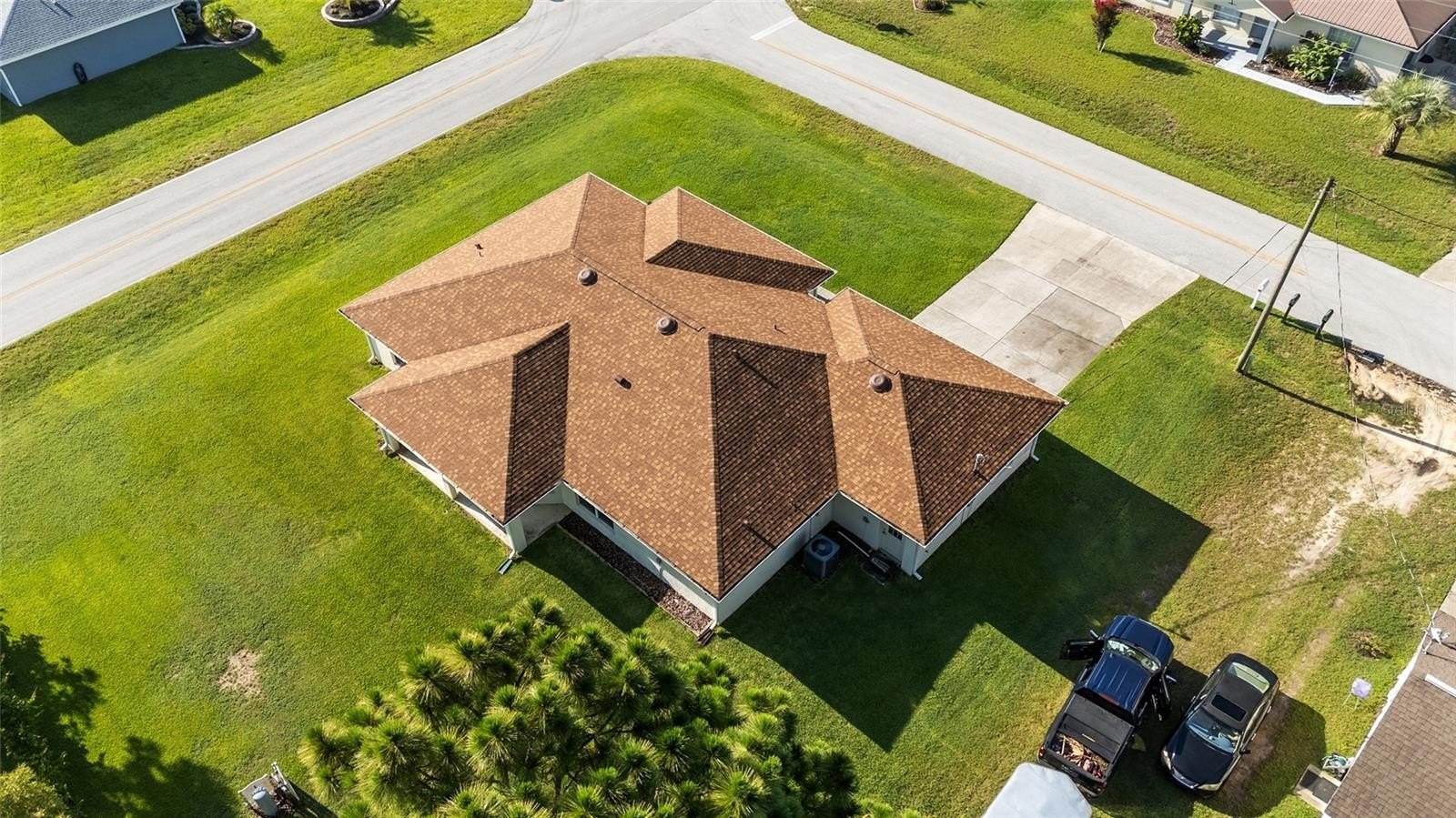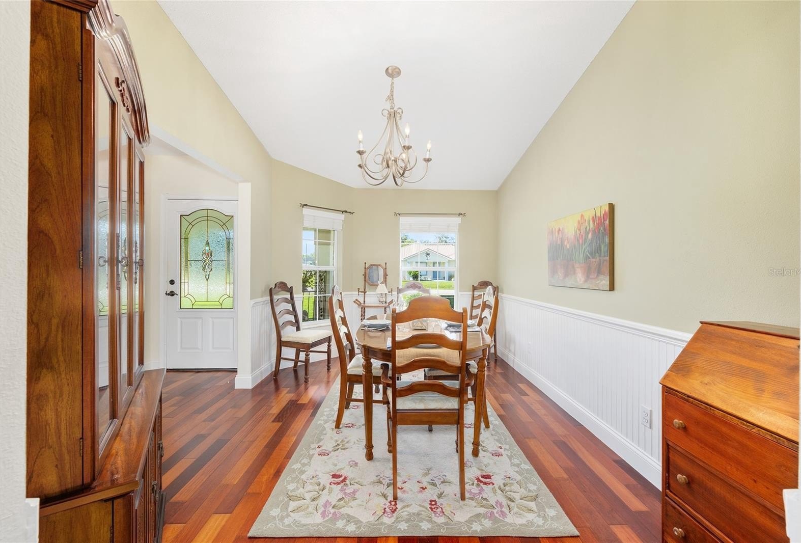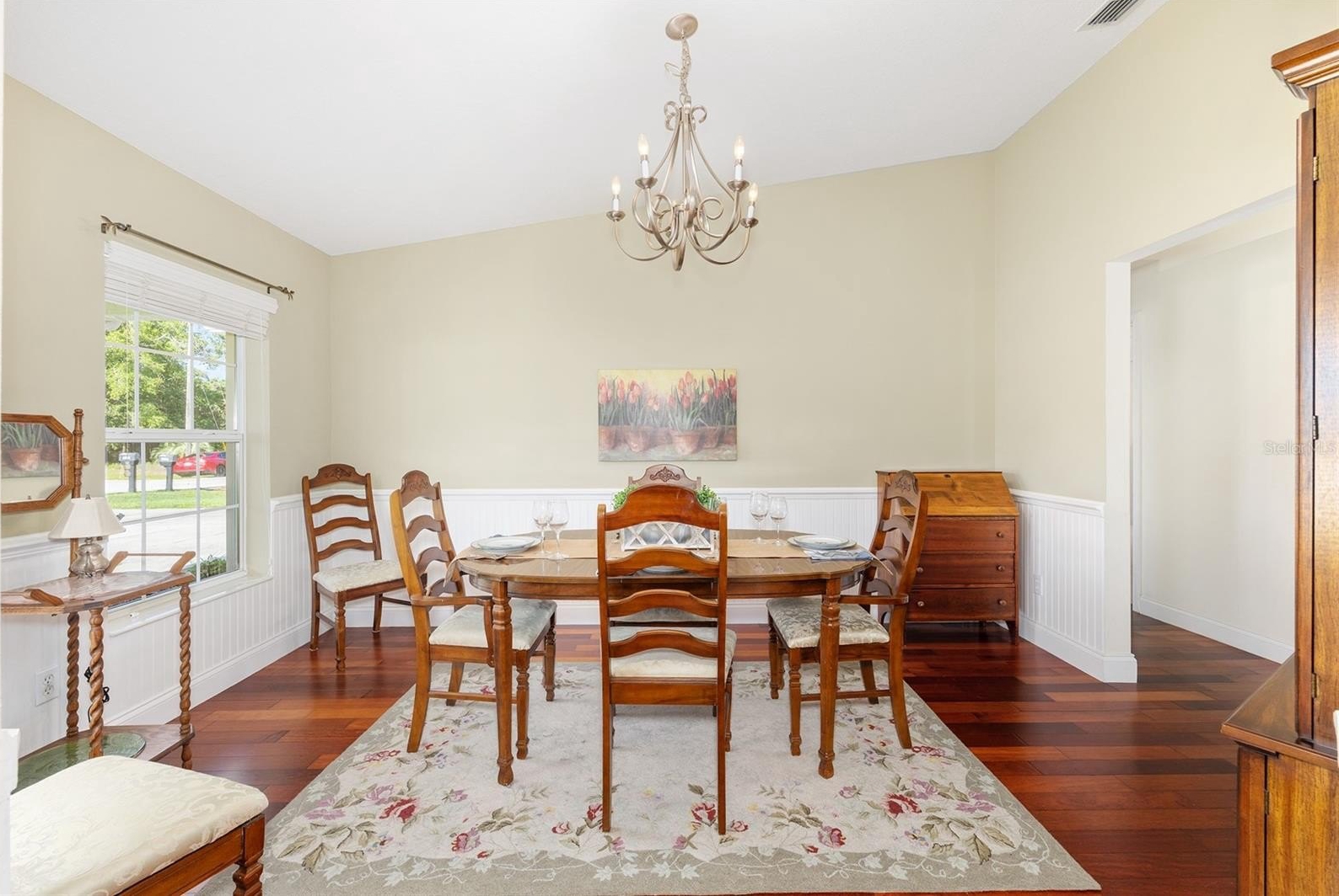 Ideal Location & Impeccably Maintained home. Welcome to this beautifully cared-for 3-bedroom, 2-bath block home in a golf cart-friendly community just across from The Villages – with no HOA and pride of original ownership evident throughout! Situated on a landscaped corner lot, this home offers both convenience and comfort in a sought-after Summerfield location. Step inside to find vaulted ceilings and natural light filling the space. The entry foyer opens to a formal dining room on one side and a private office with French doors on the other. The engineered hardwood flooring flows through the main living areas, with carpeted bedrooms in a desirable split-bedroom layout. The spacious living room features sliding doors that lead to a covered lanai, perfect for morning coffee or evening relaxation. The fully equipped kitchen boasts granite countertops, stainless steel appliances, a pantry closet, and a casual dining nook for everyday meals. The primary suite offers a large walk-in closet and an ensuite bathroom with a dual granite vanity, garden tub, and roll-in shower. A privacy door separates the guest wing, which includes two additional bedrooms and a full bath with granite counters. Practical features include a laundry room with extra project or storage space, and a generously sized 28' x 24' garage with room for two cars plus a golf cart. Enjoy relaxing on the covered front porch and appreciate the curb appeal of tasteful landscaping. New Roof 2024, New well pump 2025 and new HVAC 2018. This is a rare opportunity to enjoy peaceful living with easy access to all the shopping and entertainment of The Villages—without the fees.