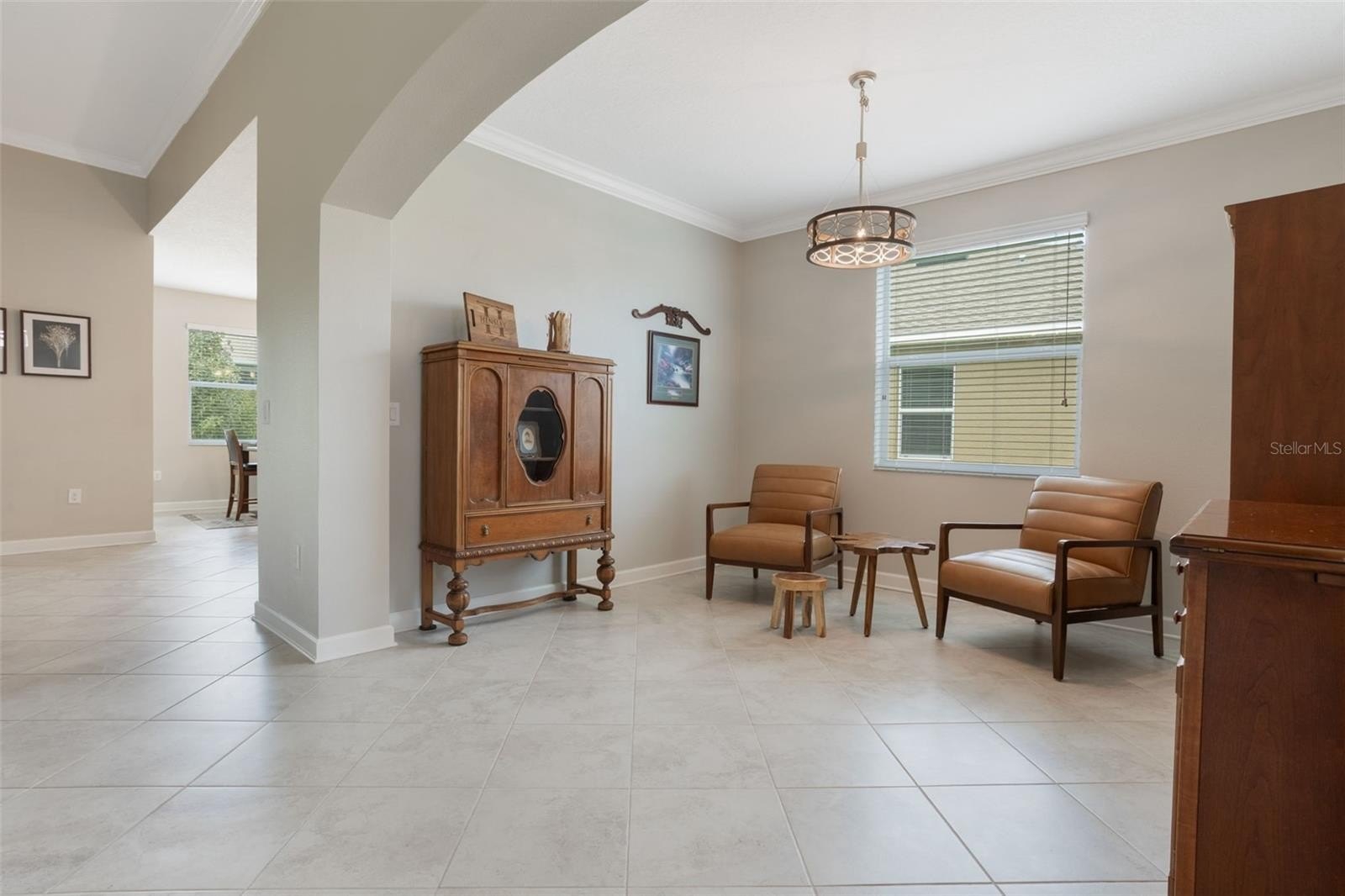The den/office exudes warmth with a reclaimed wood accent ceiling, while crown molding and arched entryways throughout the home add architectural elegance.