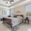 The primary bedroom suite offers a private retreat with tray ceilings, tile flooring, sliding doors, and a spacious walk-in closet. The en-suite bathroom is luxuriously appointed with a comfort-height vanity featuring center cabinetry, dual sinks, quartz countertops, a water closet, and a handicap-accessible tiled shower with decorative listello tile accents.