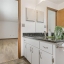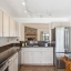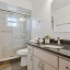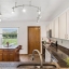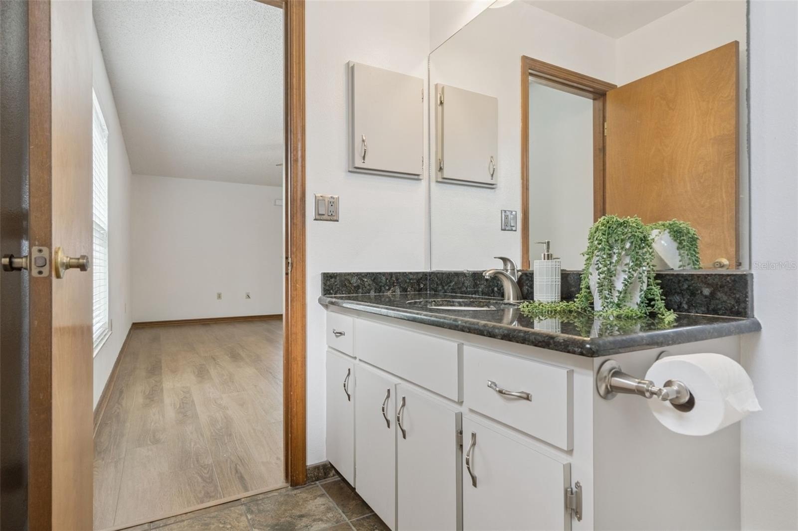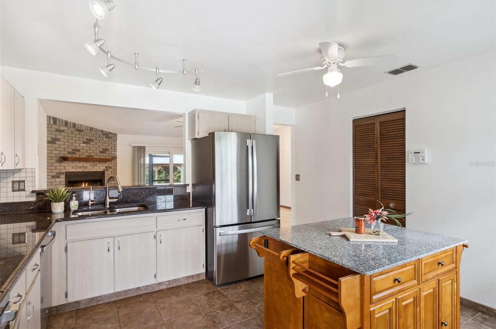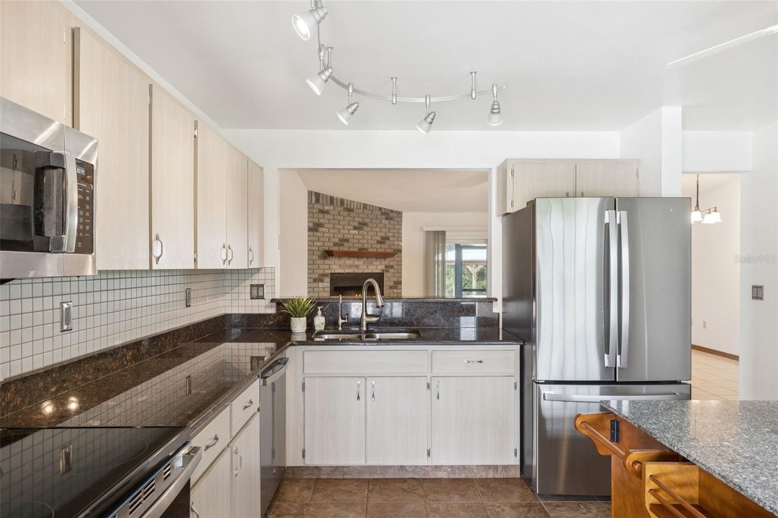 The eat-in kitchen boasts sleek flat-panel cabinetry with brushed nickel hardware and stainless steel appliances. A center island with granite countertops, a reverse osmosis system at the sink, and a closet pantry add both style and functionality. A convenient pass-through window to the living room makes entertaining effortless.
