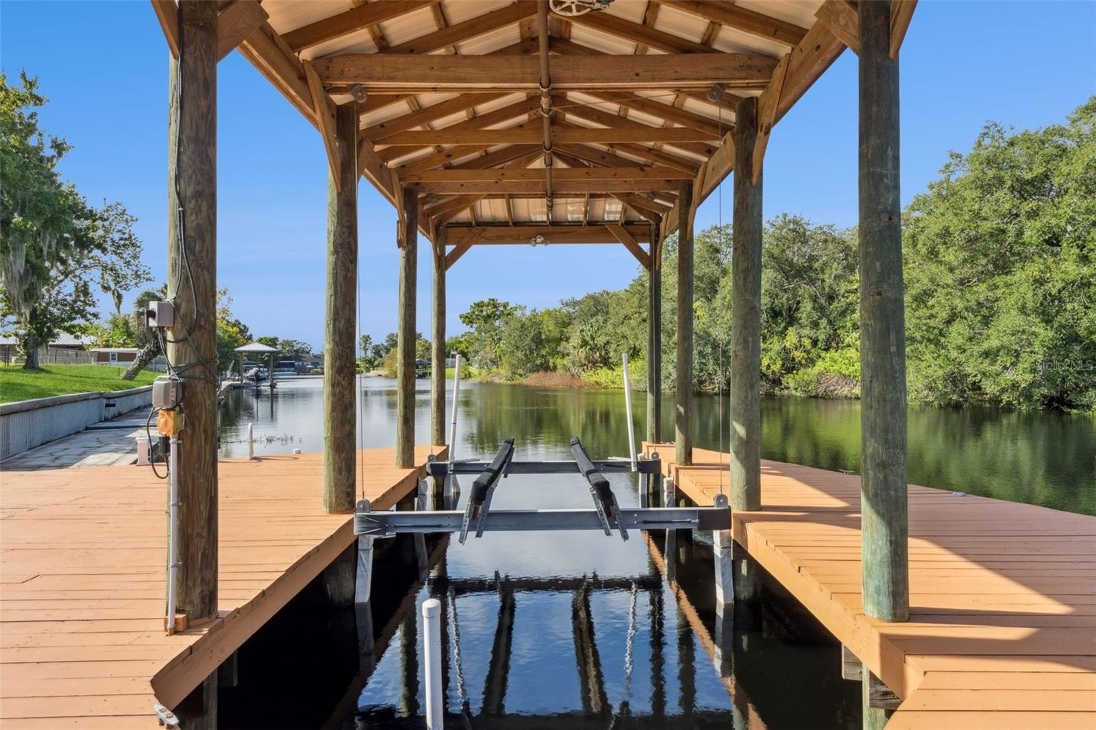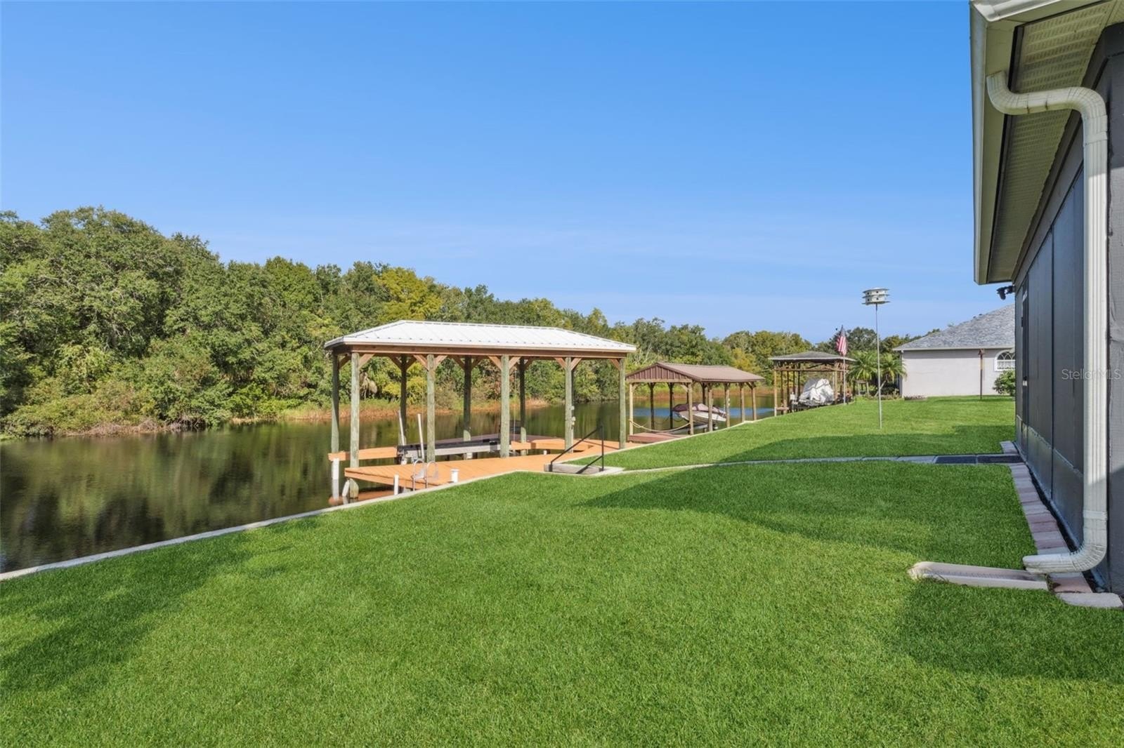 Boating enthusiasts will appreciate the private dock with a stylish metal roof and boat lift, providing easy access to the tranquil waters of Shingle Creek.
