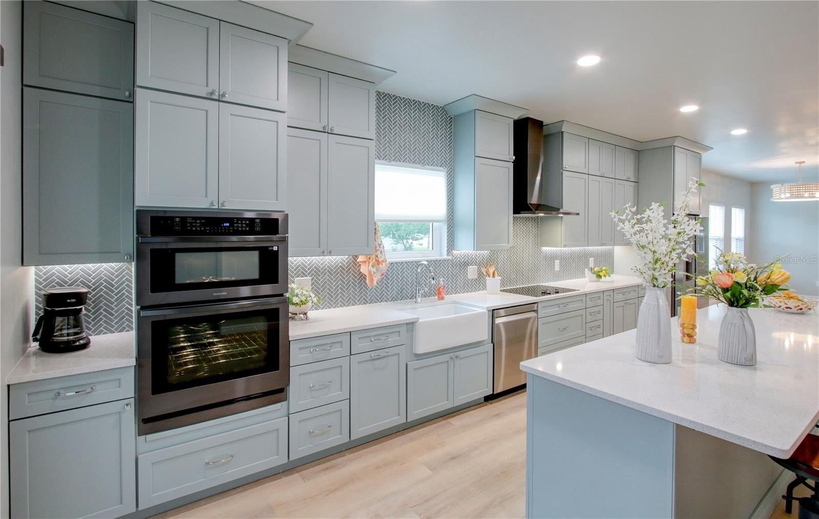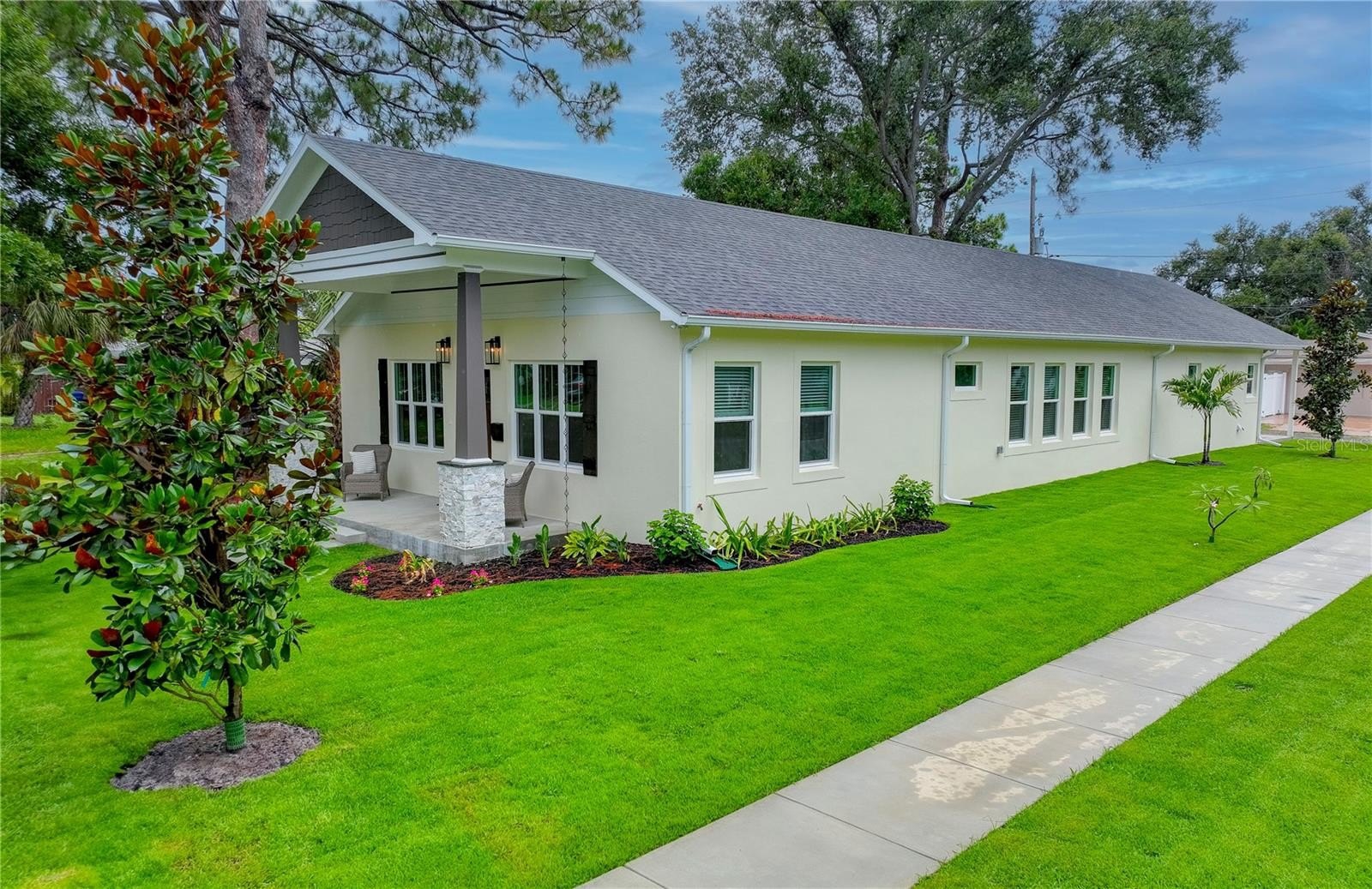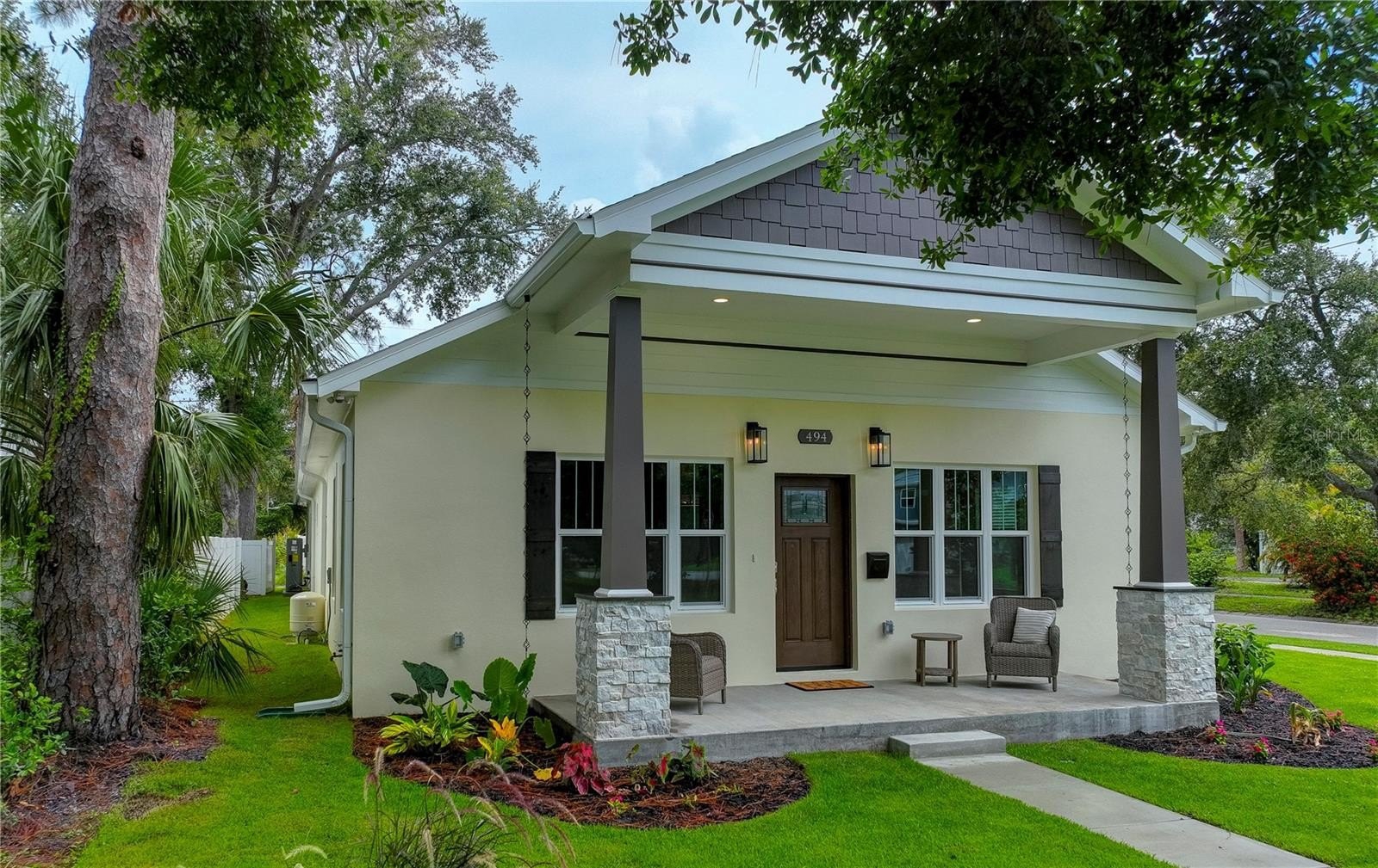 One or more photo(s) has been virtually staged. Welcome to this beautifully designed custom block home—currently the only new single-story construction of its kind in St. Petersburg. Located in the Allendale/Five Points Districrt, this 3-bedroom, 2.5-bath residence offers 2,300 square feet of thoughtfully crafted living space, complete with a 2-car attached garage featuring EV wiring, insulated doors, and an attic crawl space for added storage. Inside, the gourmet kitchen shines with quartz countertops, a spacious island, upgraded Samsung appliances, under-counter lighting, soft-close drawers, and a double pantry. The home features luxury vinyl plank flooring throughout and tiled bathrooms, as well as custom closets and low E impact resistant windows and doors. The owner's suite includes a luxurious bath with a soaking tub, marble walk-in shower, and double sinks. Designed for efficiency and comfort, the home includes open cell foam insulation, a recirculation pump for instant hot water, and a Rheem HVAC and water heater system controllable via app. Smart home ready with pre-wired USB and CAT 5e internet connections add convenience, along with a plumbing loop for a future water filtration system. Outdoors, you will find a well pump irrigation system, rain chains, magnolia trees, coastal grass, and leaf filter gutters for low-maintenance and sustainable living. Additionally a clean out connection that is perfect for an RV is located on the driveway. With a 30 year warranty on shingles and a 5-year labor warranty, this no-flood-zone, no-HOA property is just a short walk from Coffee Pot Park, shops, restaurants, and grocery stores, and blocks from Tampa Bay —offering a rare opportunity to enjoy luxury, efficiency, and location in one exceptional home.