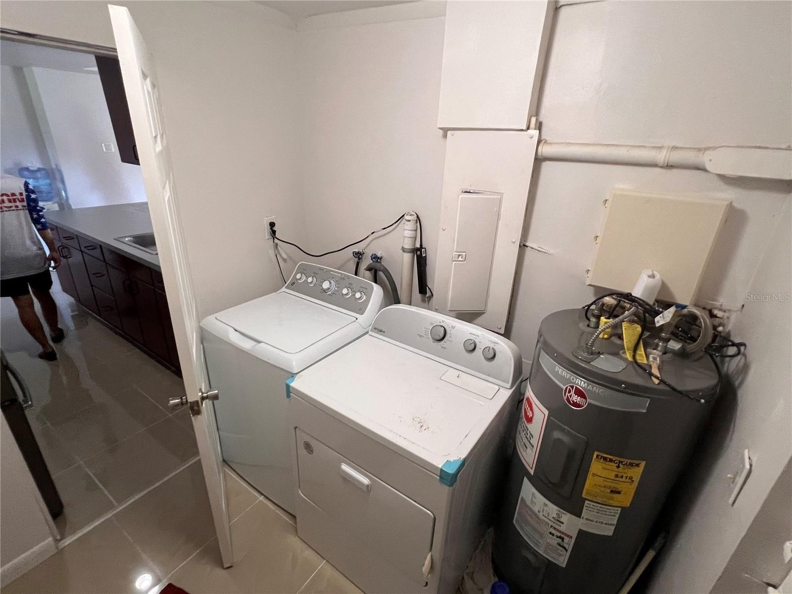 Indoor laundry room with washer, dryer, and water heater