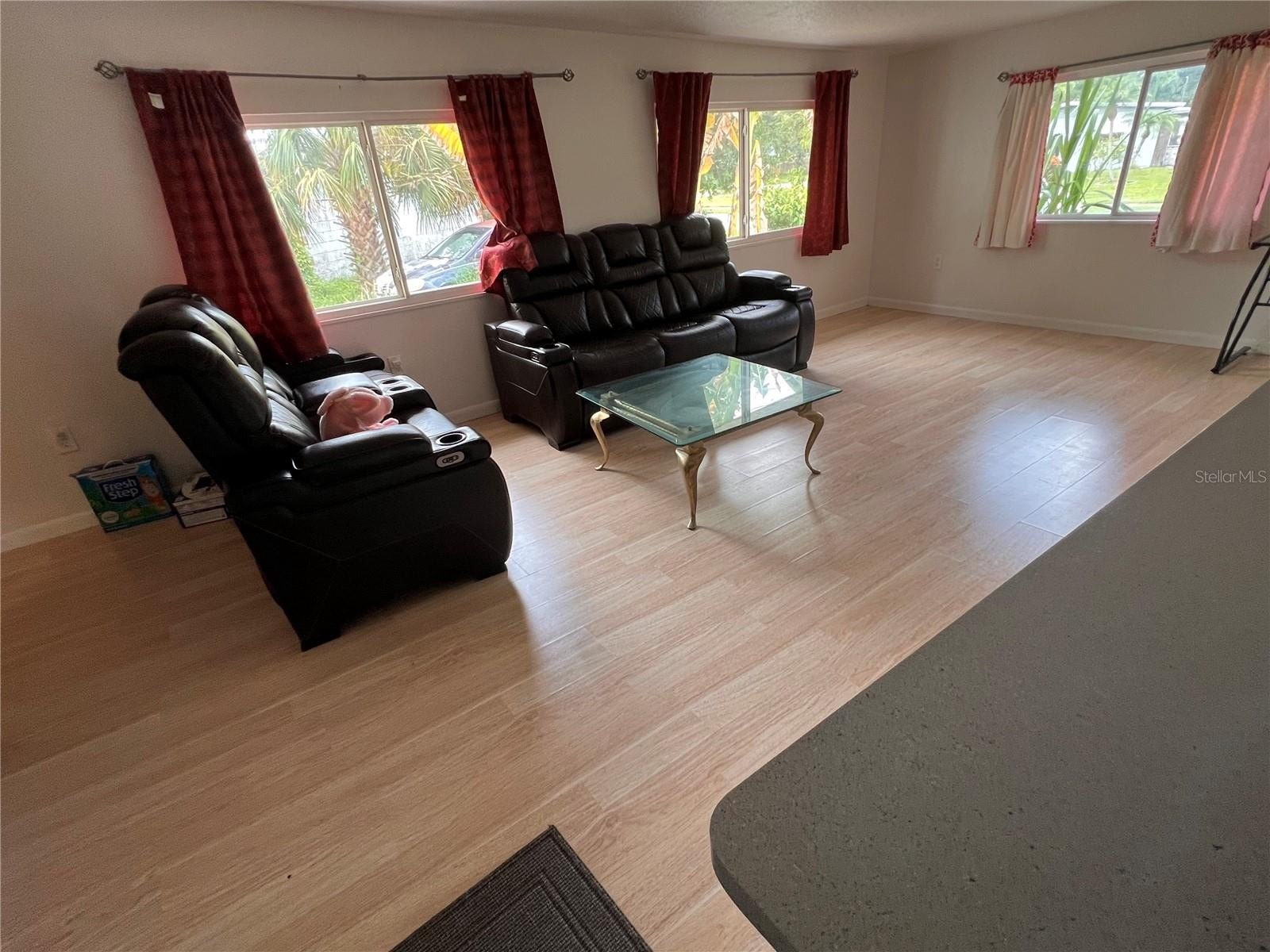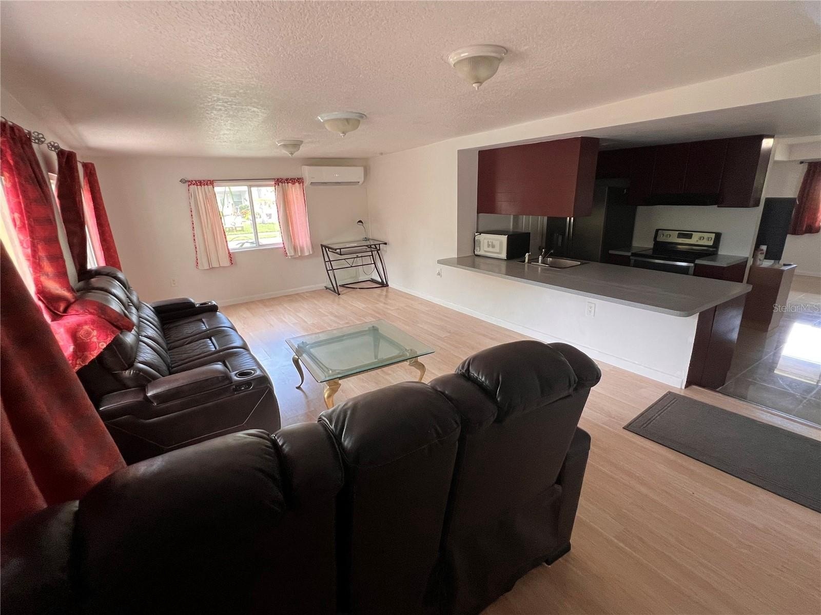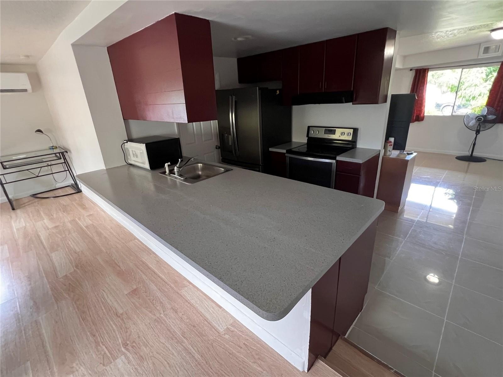 Step inside to a bright and open living area with gleaming tile floors and plenty of natural light. The updated kitchen features sleek countertops, modern appliances, and ample cabinet space, seamlessly flowing into the main living and dining areas.