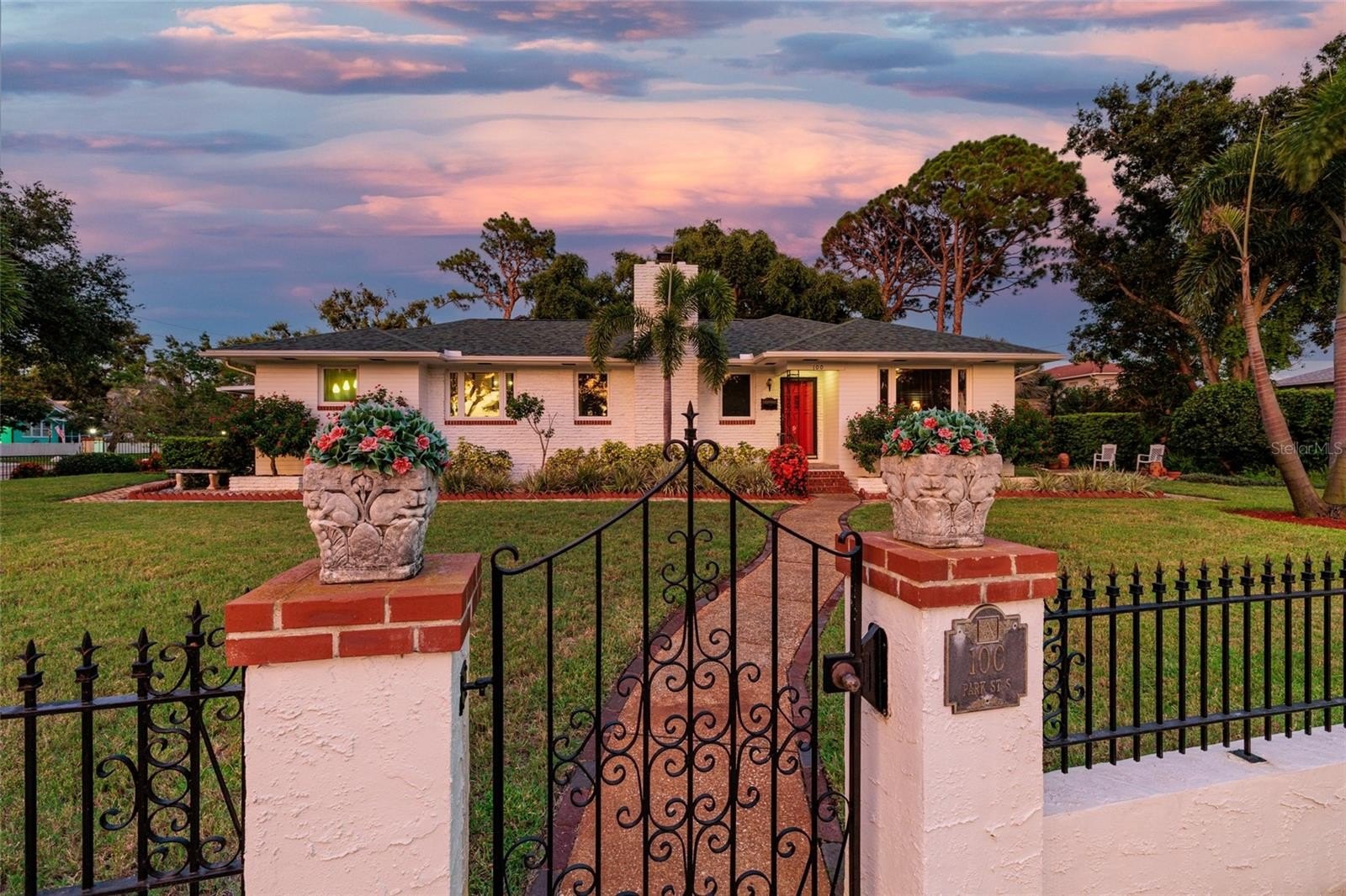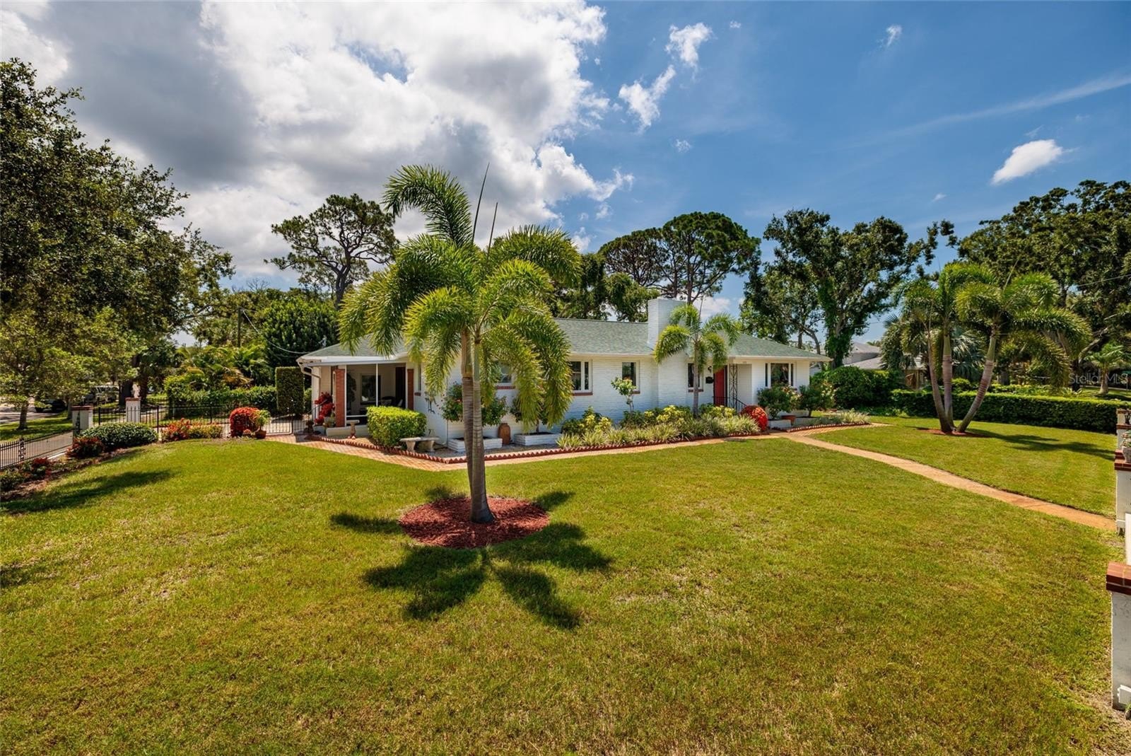 ~Historic Park Street Classic Home on a Double Lot~ this charming 1950s style home sits high and dry on a rare corner double lot and is also zoned for an ADU! Untouched by recent storms, this home has stunning sunset and water views over Sunset park . The property’s naturally elevated position makes it a true gem in a storied neighborhood with mature trees and Old St Pete charm. Meticulously cared for by one family for nearly 35 years, the sturdy block home blends original character—arched doorways, hardwood floors, pastel tile baths—with thoughtful updates like a 2024 architectural shingle roof with straps and clips, 2023 Trane HVAC, and Impact windows plus NEW hurricane-rated Andersen doors. The tranquil lot offers curated gardens, a fountain, and several peaceful sitting areas, all privately tucked away behind mature landscaping. A lovely enclosed side porch greets you from the driveway and then you will also find a large rear screened lanai overlooking generous outdoor space creating endless entertaining and relaxing opportunities. With full alley access, no immediate side neighbors, and room for a pool and a LEGAL ADU, this property offers exceptional flexibility for future development. Inside, you'll find a formal living room, dining room & a generous family room plus a pine-paneled office or third bedroom, cedar closets, large picture windows that invite in natural light and garden views. This is a rare opportunity to own a well-maintained home with timeless charm, Pride of Ownership, and future potential in one of the area's most treasured neighborhoods. Super easy access to downtown and the beaches, come tour this lovely home today.