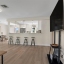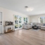 Wake up to natural light pouring through floor-to-ceiling impact casement windows (2016), highlighting sleek luxury vinyl plank flooring and an open, airy layout. The chefs kitchen pairs solid wood shaker cabinetry with Venatino soft-gold quartz countertops, a striking mosaic tile backsplash, stainless Samsung appliances, and a breakfast bar ideal for morning coffee or after sunset cocktails.