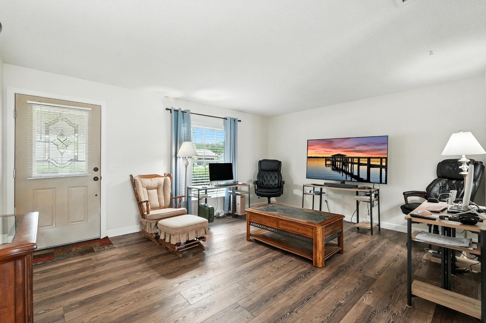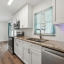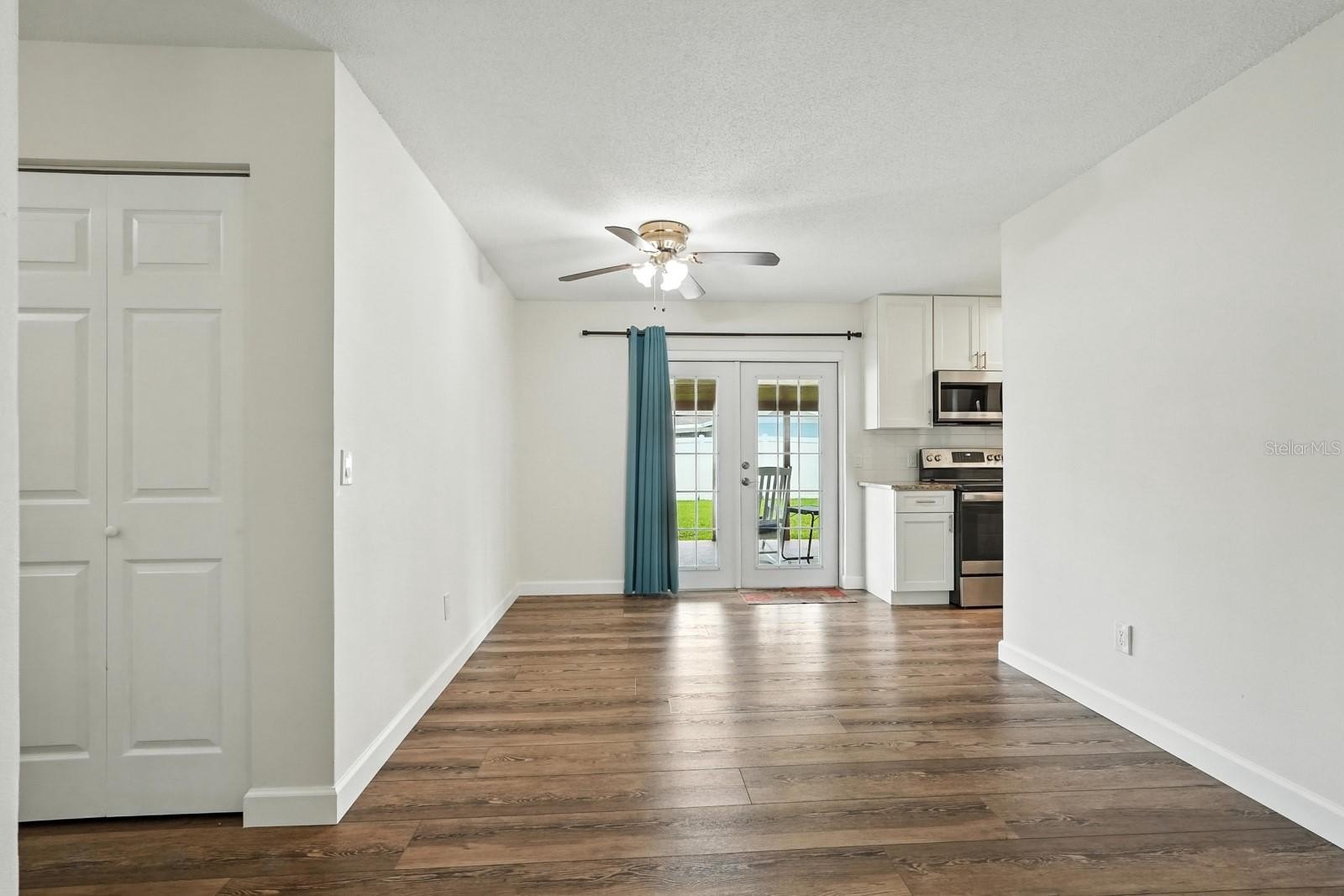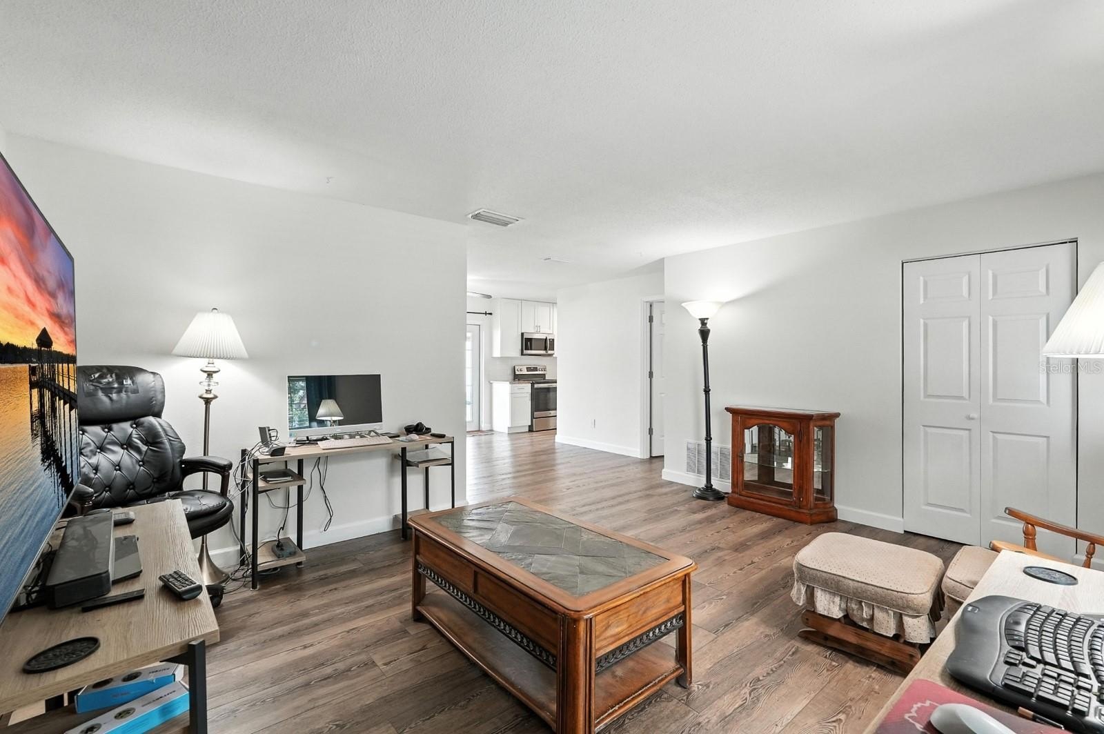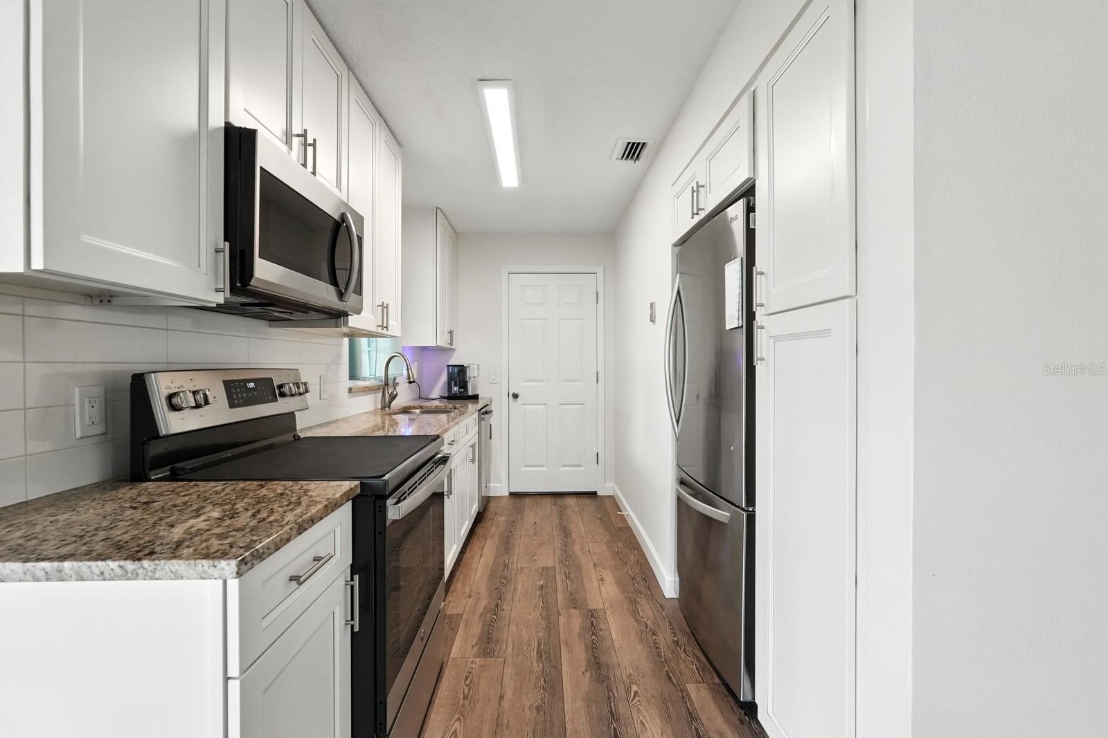The living and dining areas blend effortlessly to create a warm and welcoming space perfect for relaxing or entertaining. A stylish galley kitchen offers sleek cabinetry, modern appliances, and plenty of counter space to make meal prep a breeze.