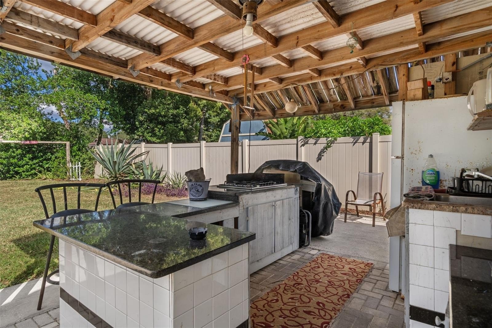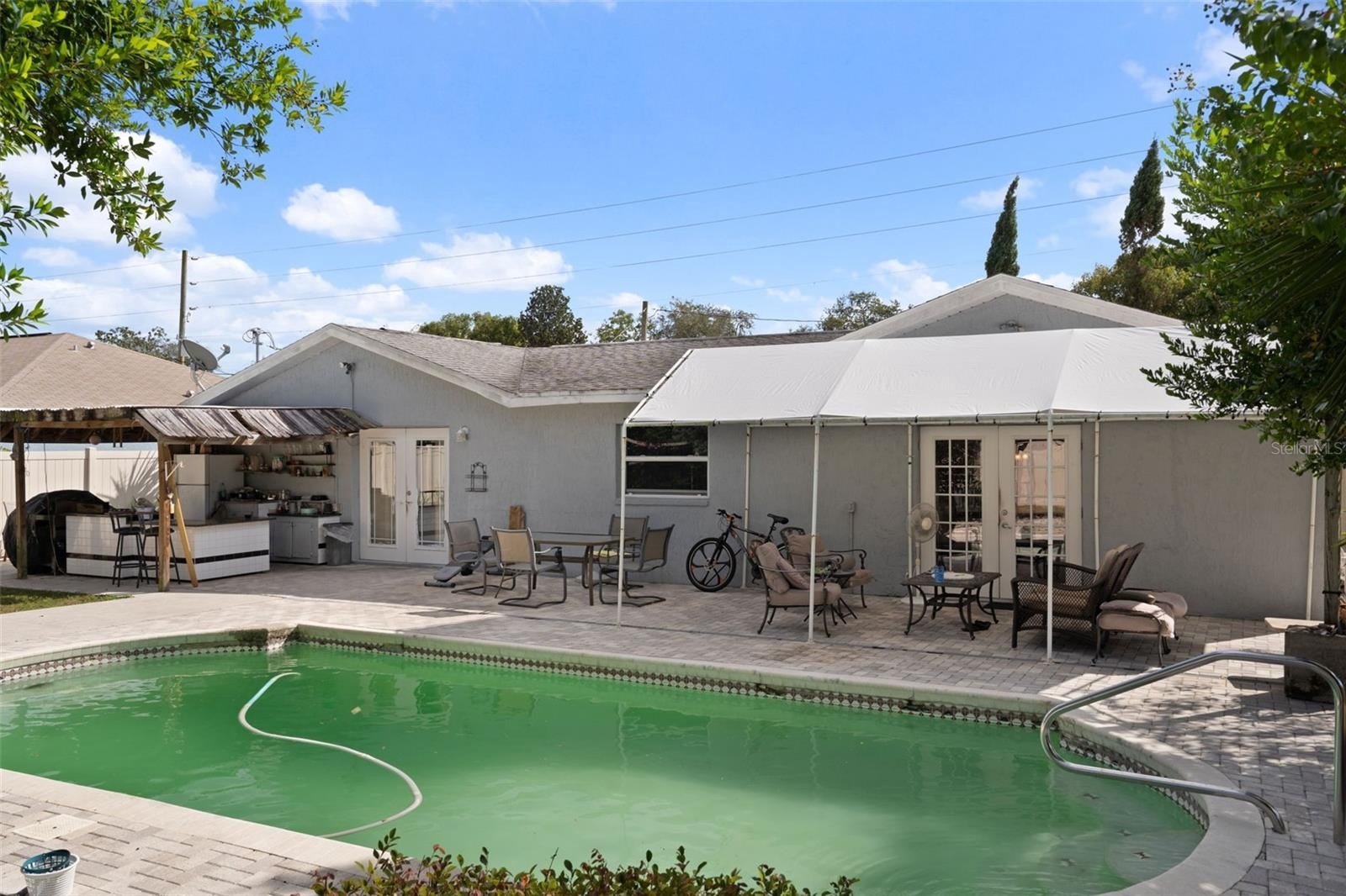 Welcome to this spacious 5-bedroom (two bedrooms do not have closets), 2-bathroom pool home in the heart of Spring Hill—offering the perfect opportunity for multi-generational living or an income-producing investment. From the moment you arrive, you’ll appreciate the mature landscaping and charming 12x7 covered front porch accented with stonework and ceramic tile. Inside, crown molding carries throughout the home, adding a touch of elegance to the 18x12 living room, which features ceramic tile flooring, French doors, and sliding access to the expansive 60x12 pavered rear patio. The kitchen serves as the heart of the home with granite countertops, updated cabinetry, a stone tile backsplash, breakfast bar seating, and pendant lighting. The layout offers incredible flexibility with five well-sized bedrooms, including a 15x12 ensuite bedroom with French door access to the patio and a walk-in closet. The 19x10 laundry room is a standout feature with abundant storage, cabinetry, tile floors, and attic access—ideal for organization and functionality. Step outside to your personal retreat featuring a 30x15 in-ground concrete pool and a fully equipped outdoor kitchen with rustic cabinetry, stone counters, a refrigerator, gas cooktop, and plenty of seating space—perfect for entertaining or creating a lucrative rental setup. The main guest bath has been tastefully updated with stone counters, a large single vanity, modern fixtures, and a stylish stone-tile tub/shower combination. With no HOA, a convenient Spring Hill location close to shopping, dining, and major routes, and endless versatility in how the space can be used, this property offers both comfort and opportunity—whether you're looking to invest, expand, or enjoy true Florida lifestyle living. Homes with this level of space, rental potential, and outdoor features rarely hit the market at this price—secure your chance before it’s gone.