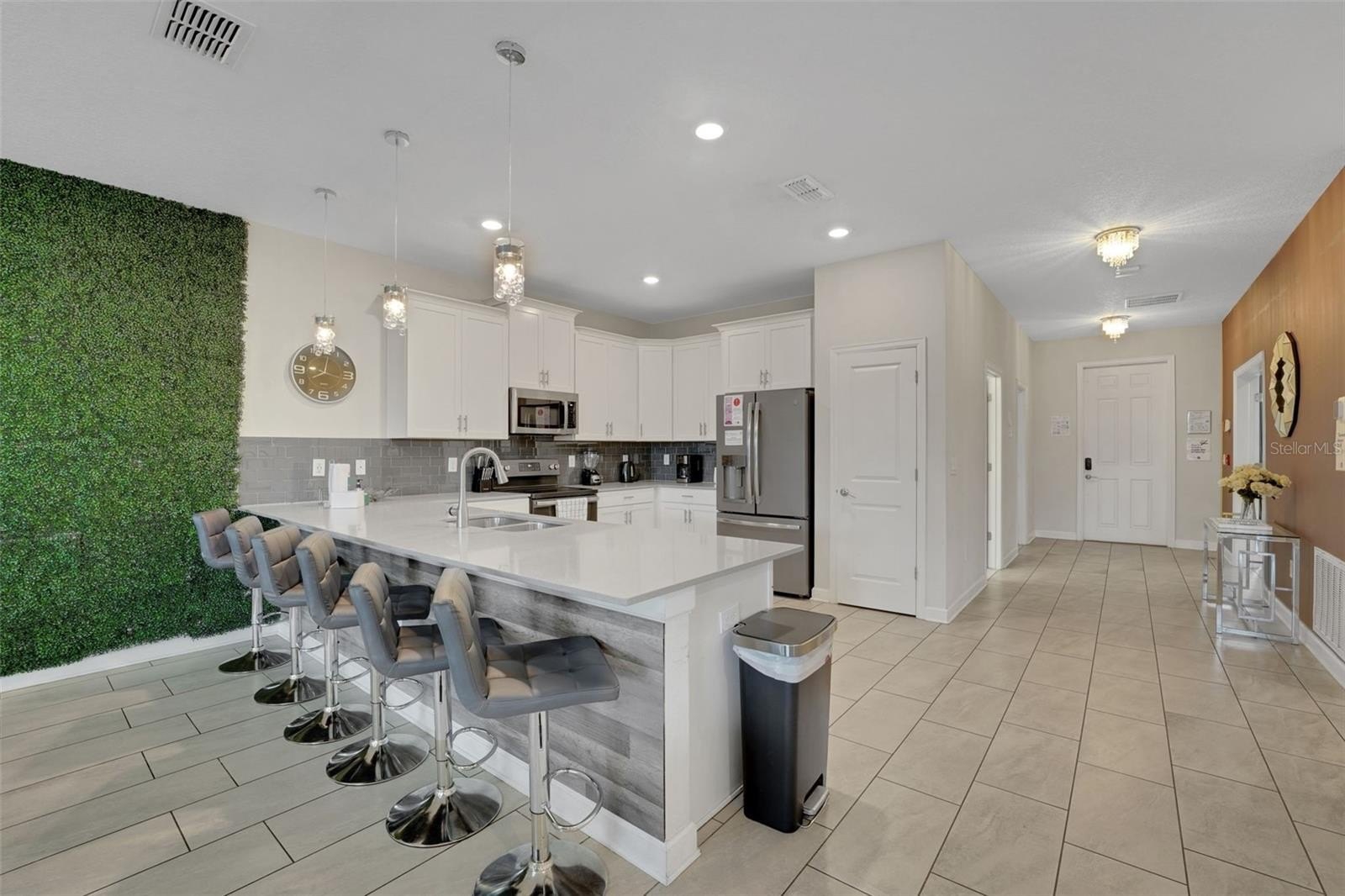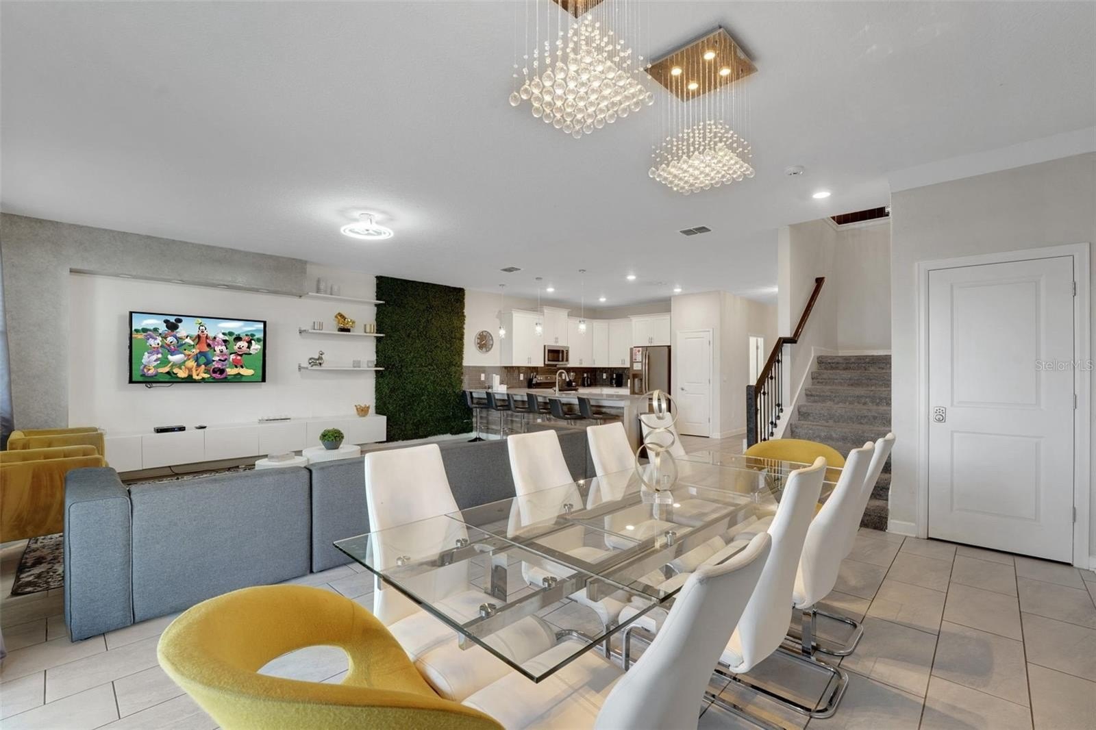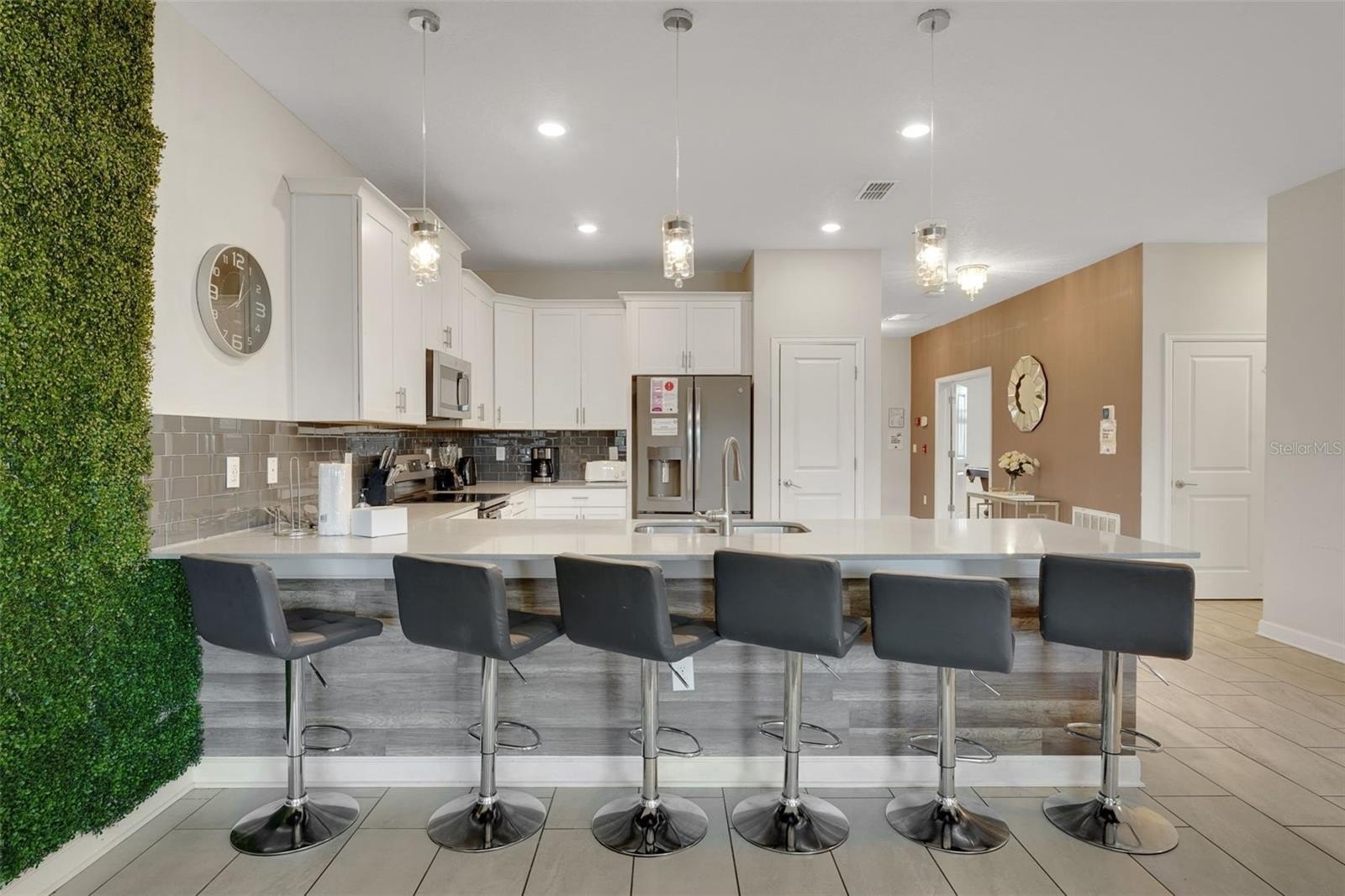 On a street made for stories, this home was designed for making them. This popular Santiago model sits on an enviable corner lot in Storey Lake Resort and offers eight bedrooms, 5 bathrooms and a huge 4,303 sq ft. Located just minutes from Walt Disney World and the heart of Orlando’s imagination, this home pairs contemporary architecture with inviting curb appeal, highlighted by a brick paver driveway and sleek stone accents. Beautifully furnished to a high standard, each room is enhanced with thoughtful and enchanting accents throughout that bring the home’s character to life. The first floor opens into a bright, welcoming living space where the kitchen, dining, and lounge areas flow as one. The kitchen features white modern cabinetry, a large center island, and stainless steel appliances—easy for morning coffee, shared meals, and unwinding together after a day of adventure. Upgraded light fixtures throughout the home add a warm, intentional style.