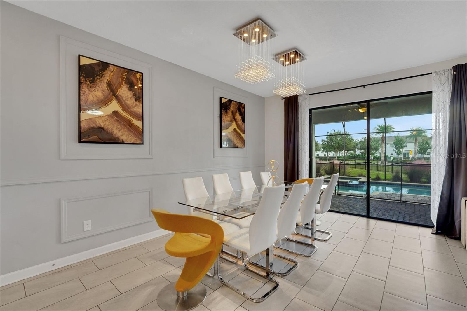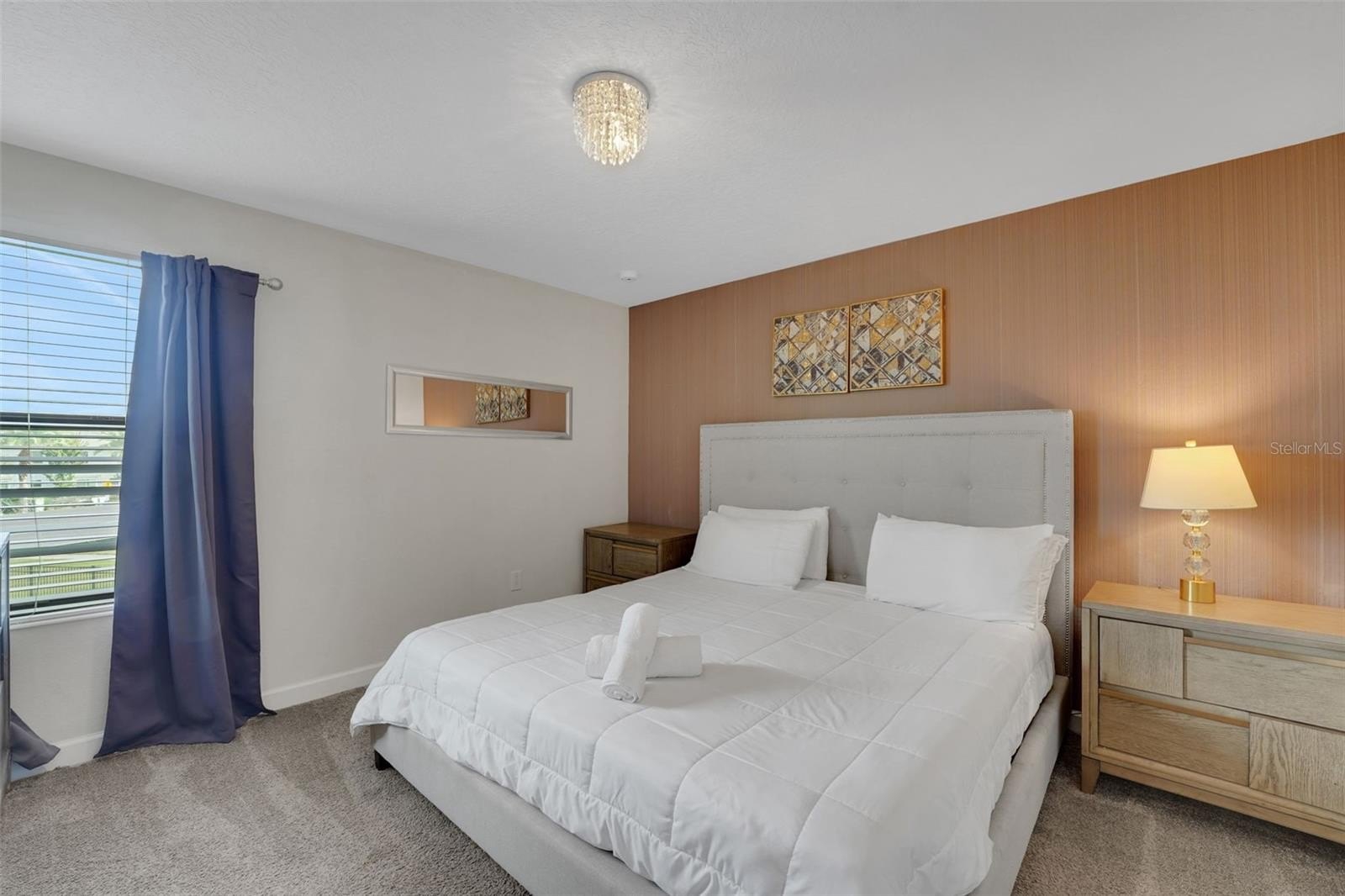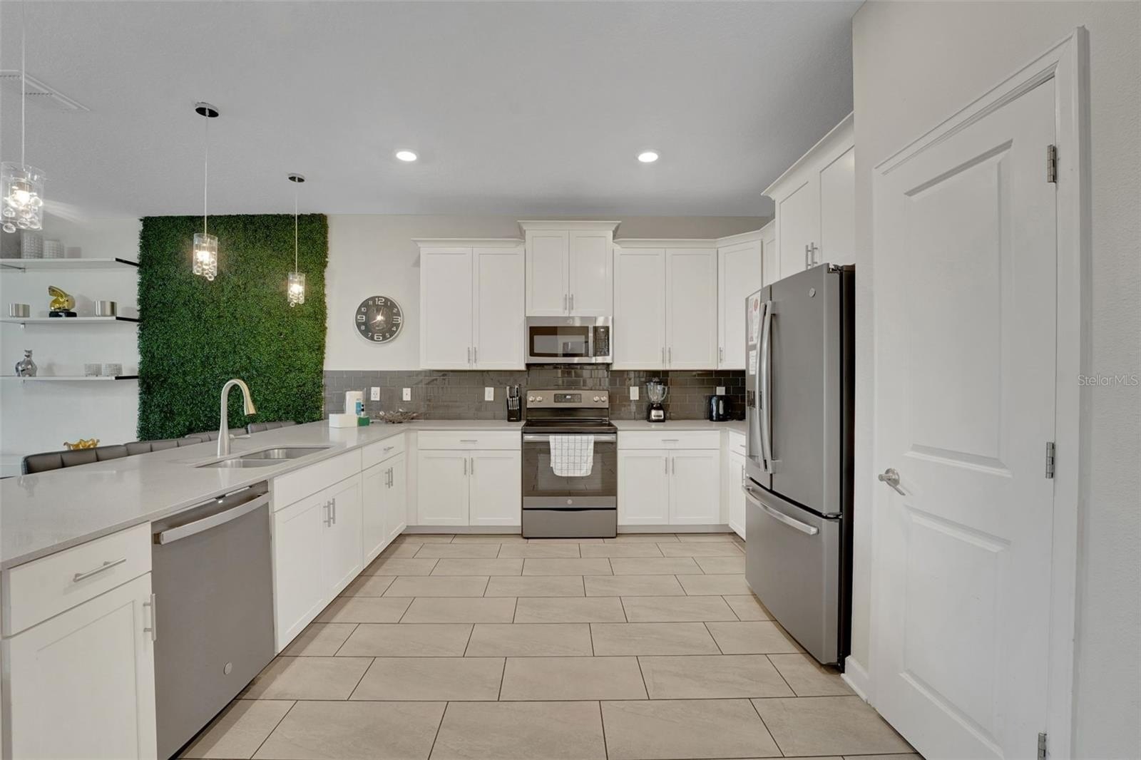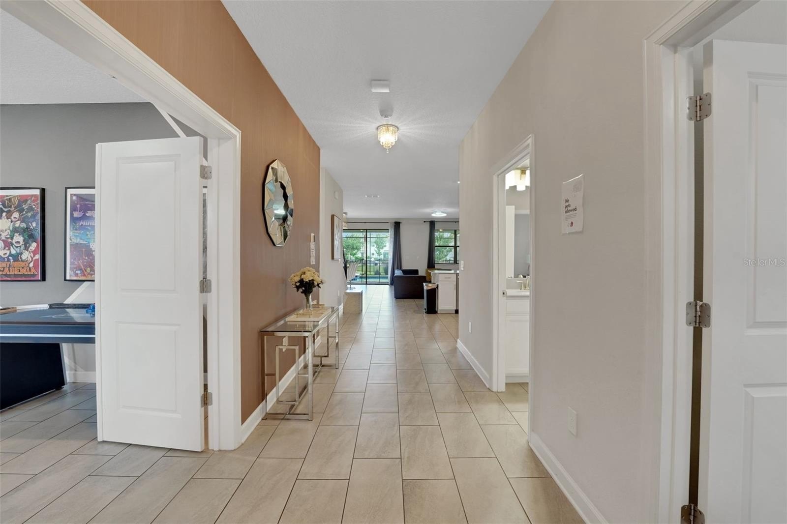 On a street made for stories, this home was designed for making them. This popular Santiago model sits on an enviable corner lot in Storey Lake Resort and offers eight bedrooms, 5 bathrooms and a huge 4,303 sq ft. Located just minutes from Walt Disney World and the heart of Orlando’s imagination, this home pairs contemporary architecture with inviting curb appeal, highlighted by a brick paver driveway and sleek stone accents. Beautifully furnished to a high standard, each room is enhanced with thoughtful and enchanting accents throughout that bring the home’s character to life. The first floor opens into a bright, welcoming living space where the kitchen, dining, and lounge areas flow as one. The kitchen features white modern cabinetry, a large center island, and stainless steel appliances—easy for morning coffee, shared meals, and unwinding together after a day of adventure. Upgraded light fixtures throughout the home add a warm, intentional style.