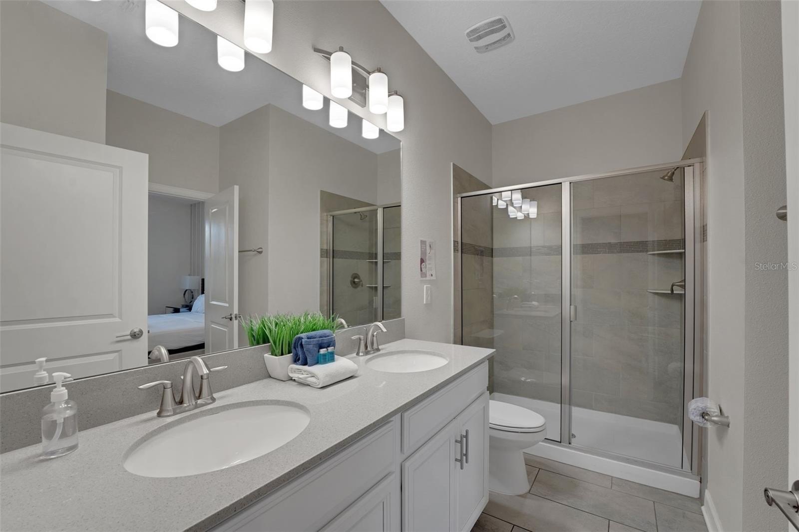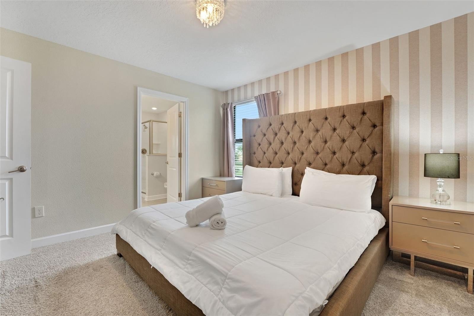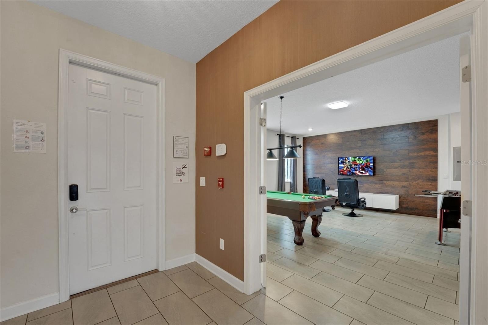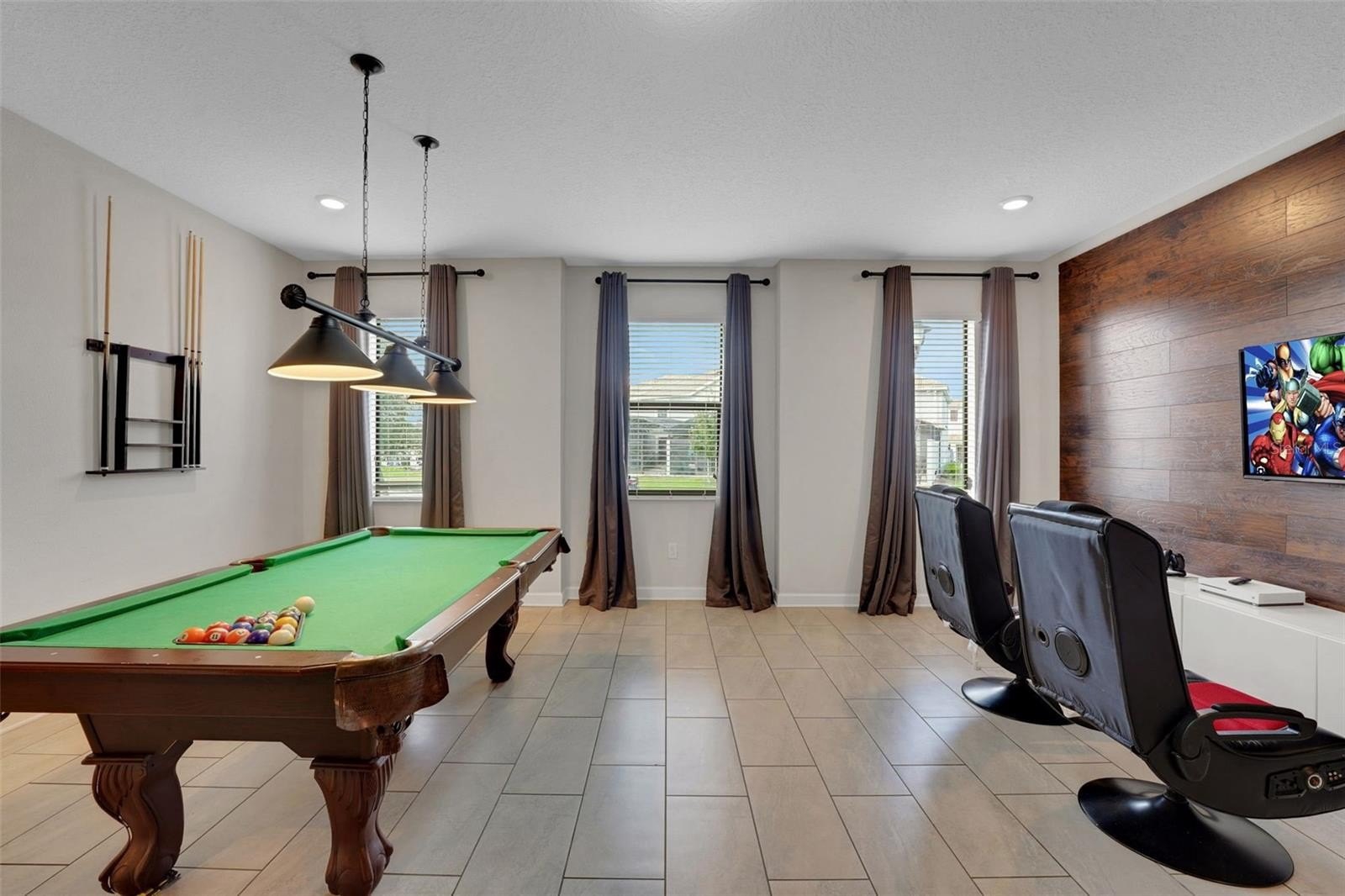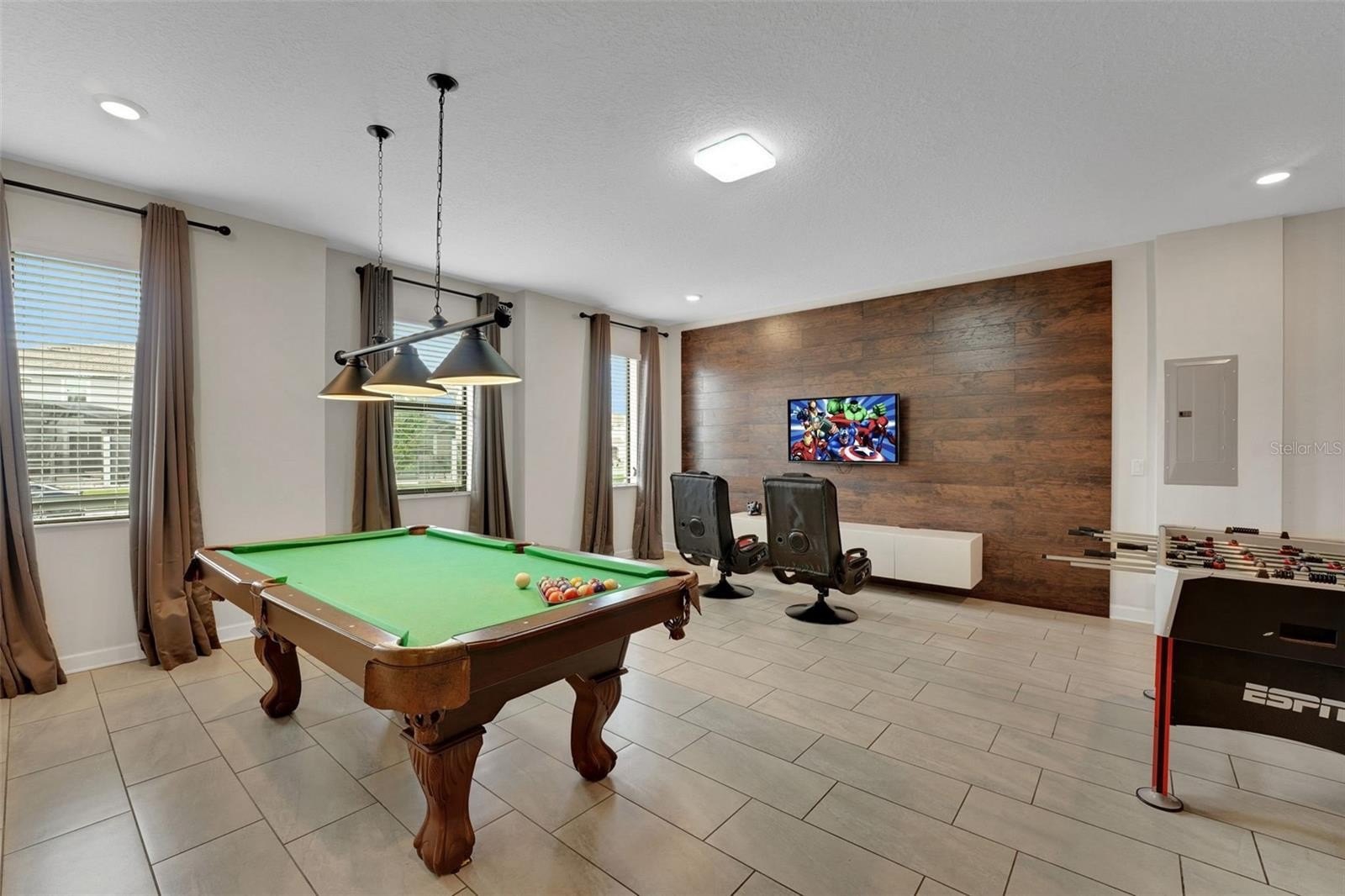 The primary suite on the first floor offers a peaceful place to rejuvenate, complete with a soaking tub, walk-in shower, and dual vanities. A second bedroom downstairs adds comfort for guests, while the interactive game room brings the spirit of play to life, featuring a pool table, foosball, air hockey, TV, Gaming Console and chairs.