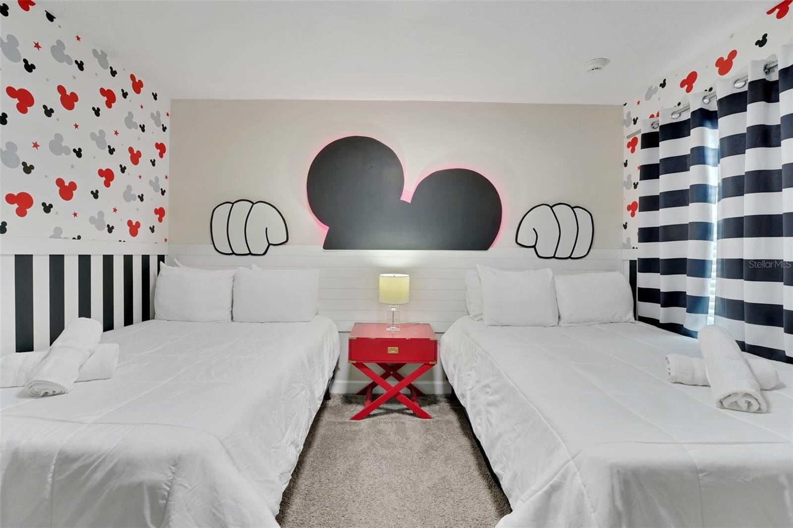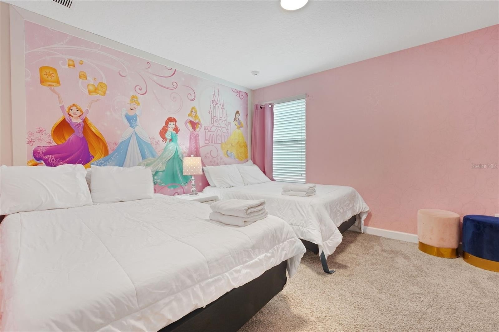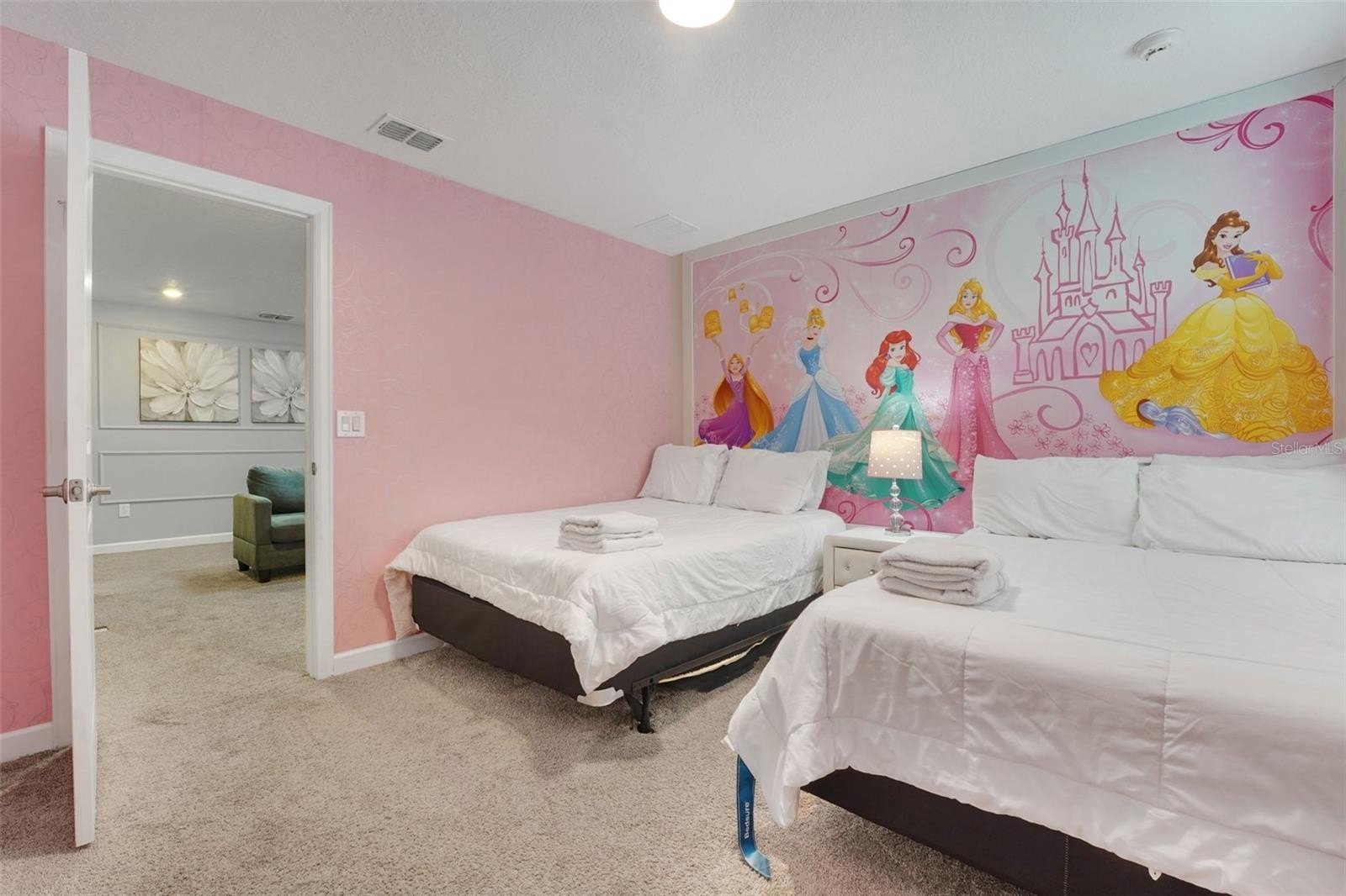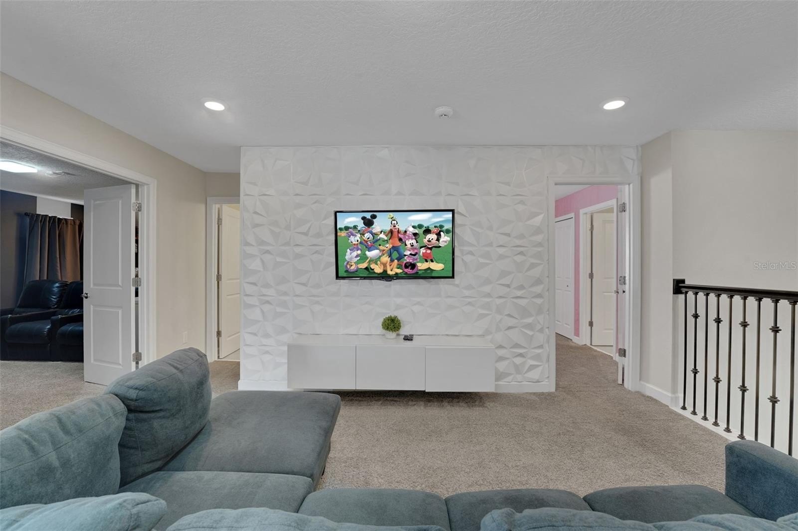 Upstairs, the home leans into imagination and delight. A Disney Princess room, a Mickey room, and an Avengers room bring joy and surprise at every turn—spaces guests remember and return for. The remaining bedrooms are designed with calm, comfort, and rest in mind. A loft lounge provides room to relax, and the media room has been transformed into a true home theater with theater-style seating.