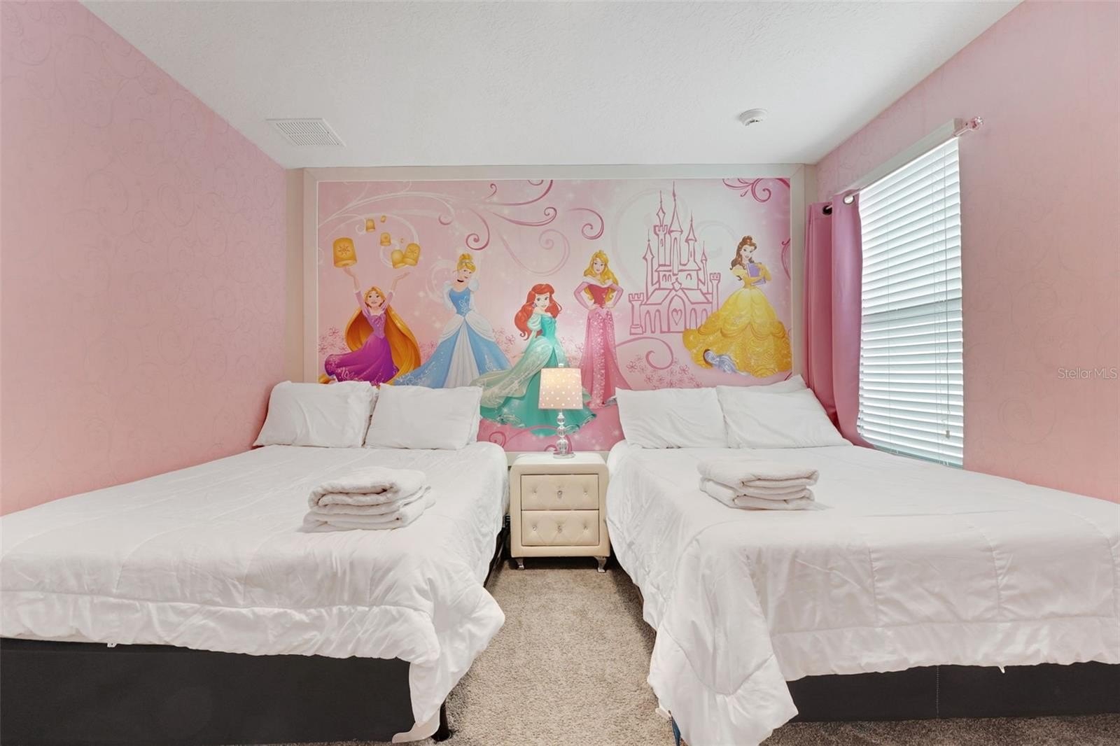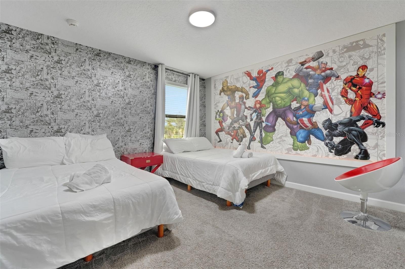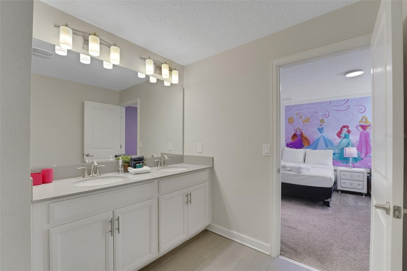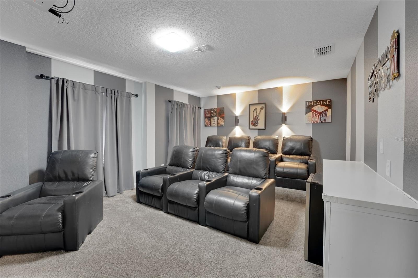 Upstairs, the home leans into imagination and delight. A Disney Princess room, a Mickey room, and an Avengers room bring joy and surprise at every turn—spaces guests remember and return for. The remaining bedrooms are designed with calm, comfort, and rest in mind. A loft lounge provides room to relax, and the media room has been transformed into a true home theater with theater-style seating.