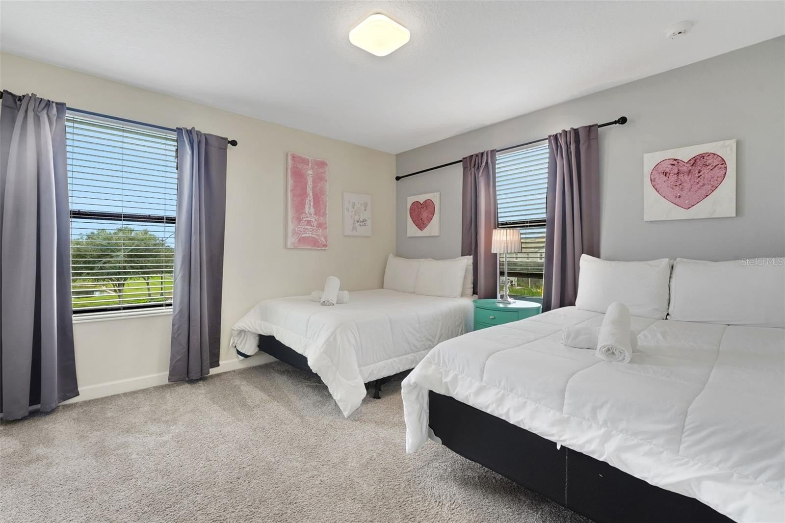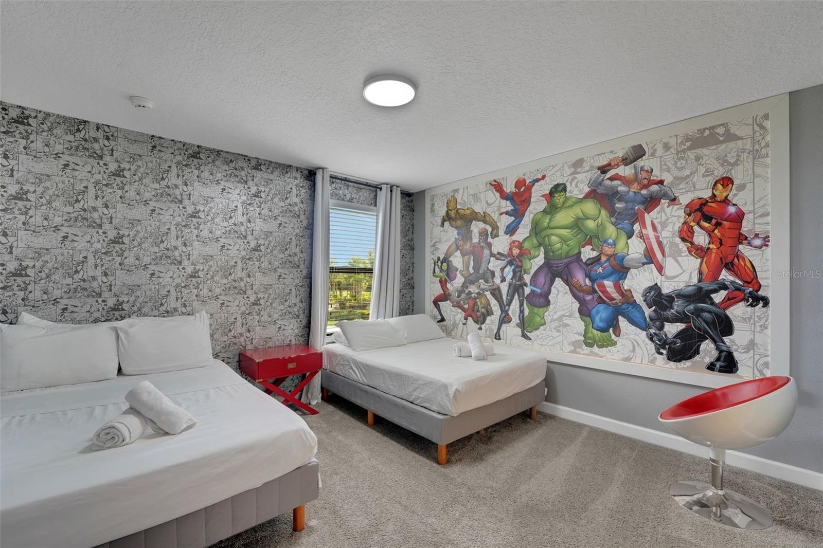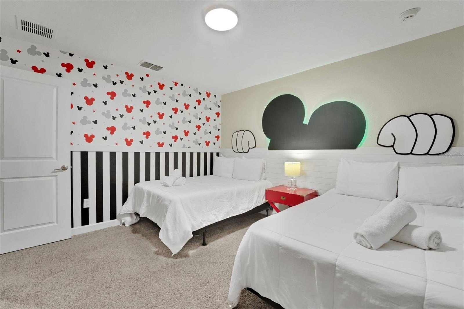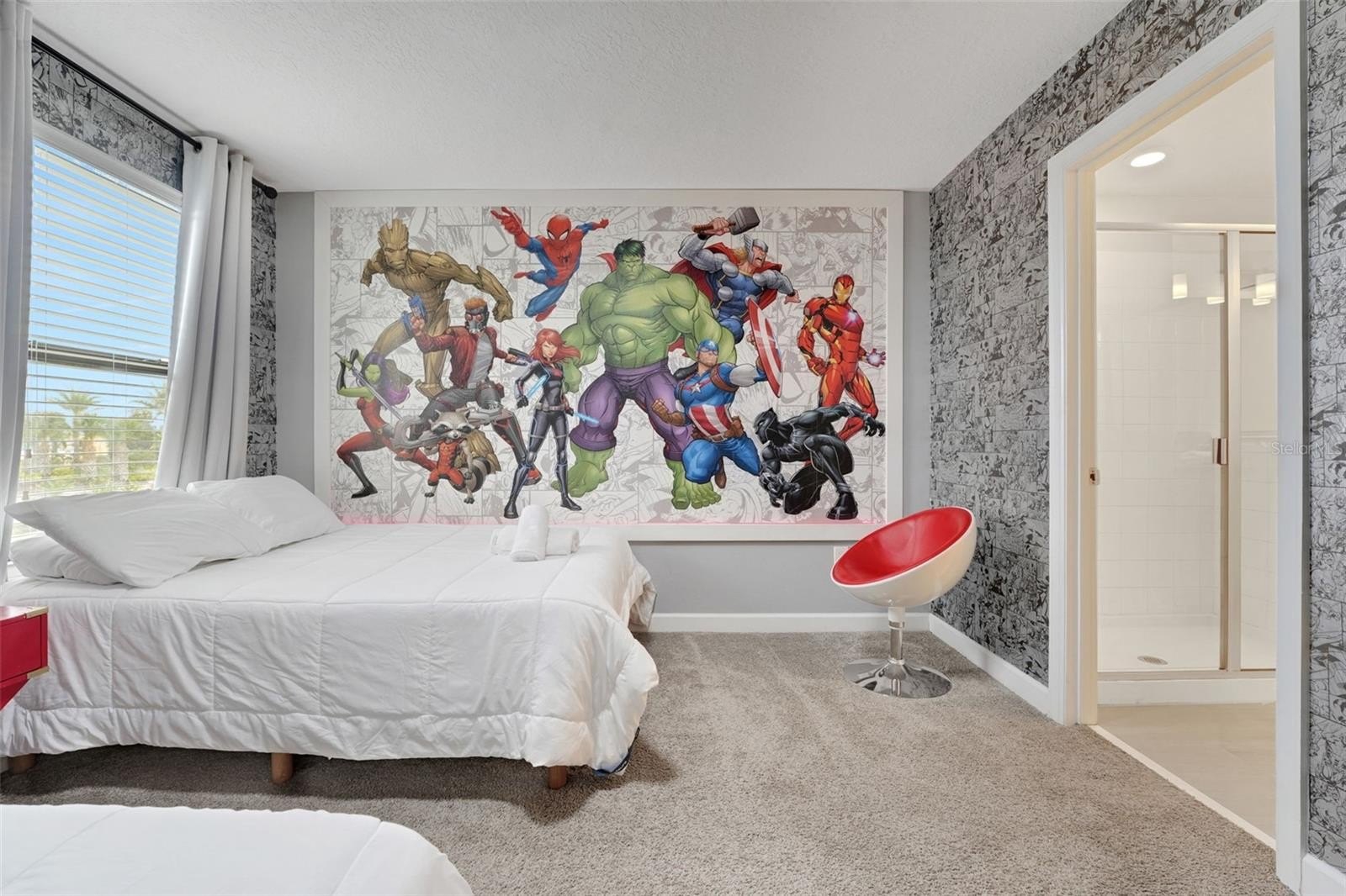 Upstairs, the home leans into imagination and delight. A Disney Princess room, a Mickey room, and an Avengers room bring joy and surprise at every turn—spaces guests remember and return for. The remaining bedrooms are designed with calm, comfort, and rest in mind. A loft lounge provides room to relax, and the media room has been transformed into a true home theater with theater-style seating.