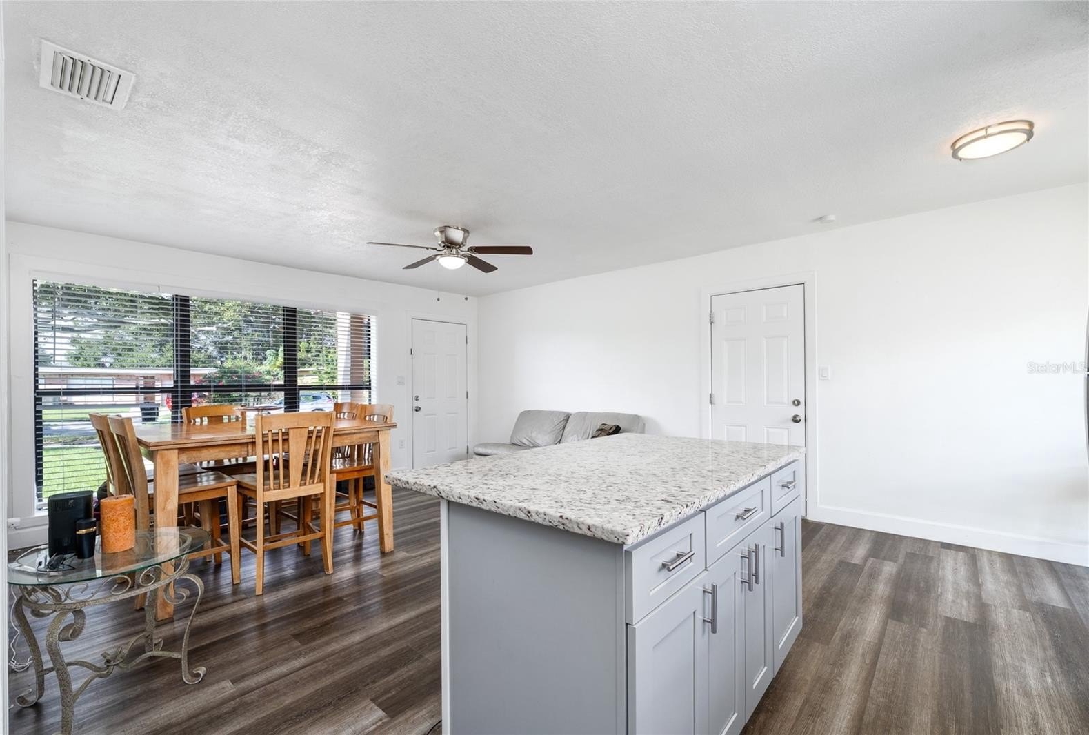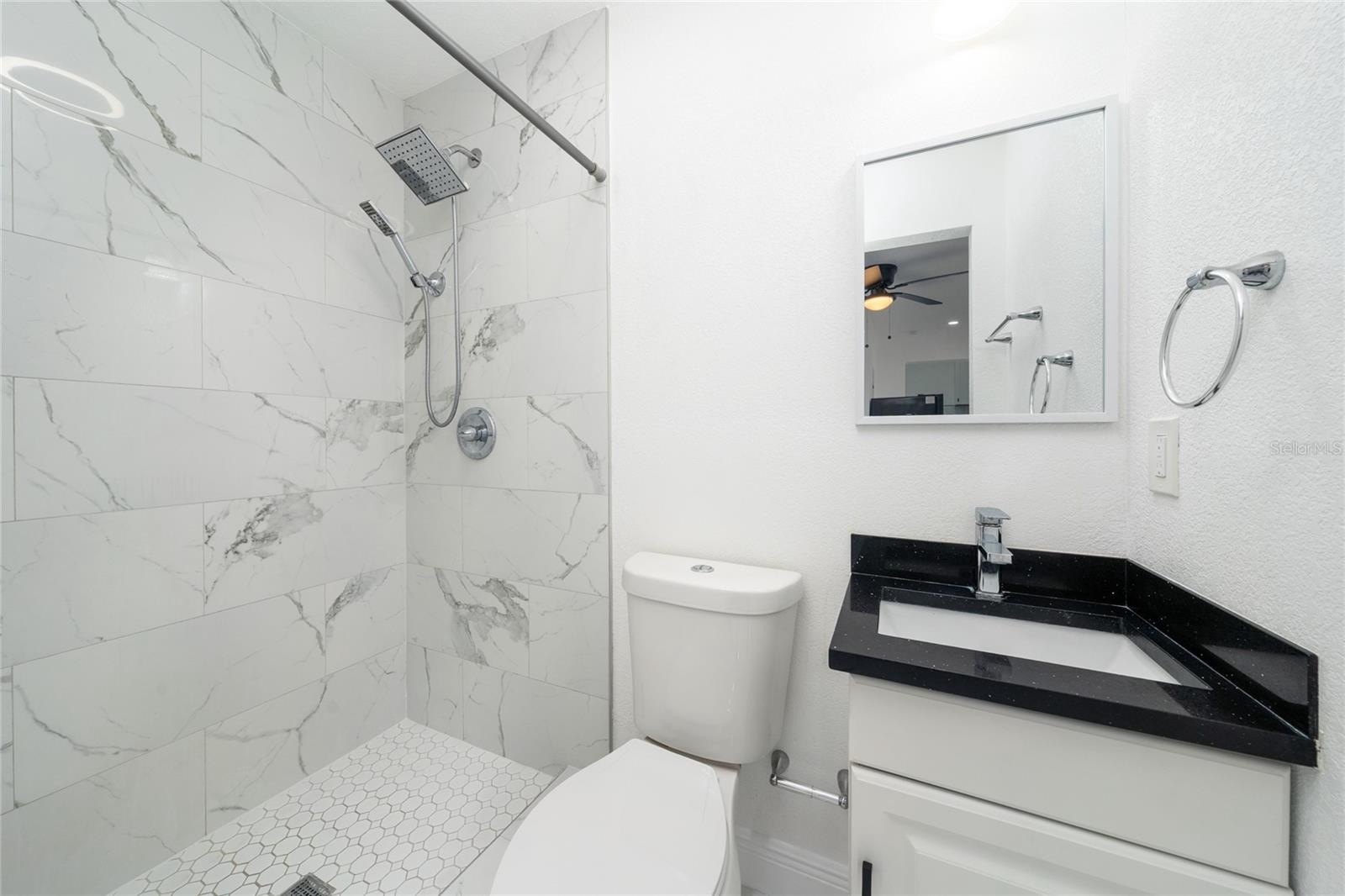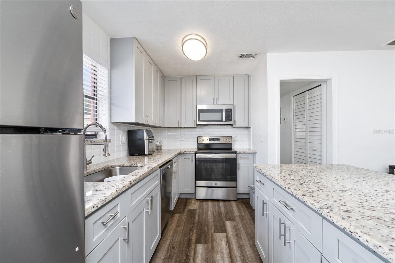 The kitchen and bathrooms are elegantly upgraded with sparkling Italian quartz countertops, while the home’s bright, airy ambiance is enhanced by fresh exterior paint, LED lighting, and modern ceiling fans.