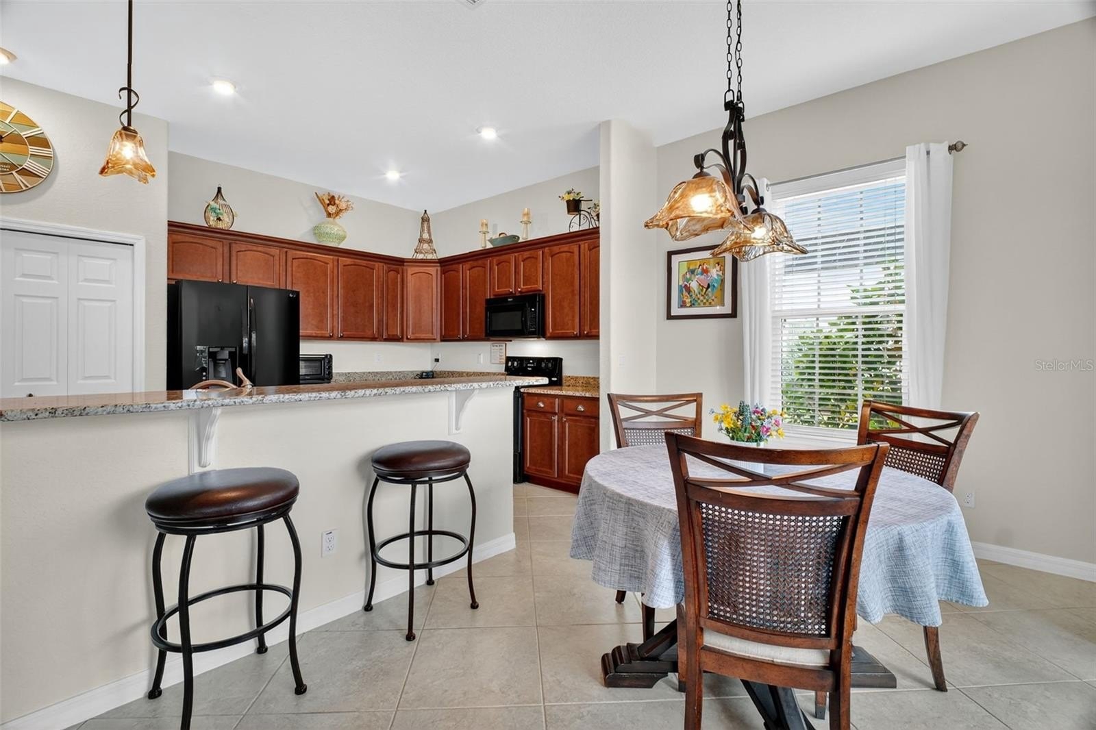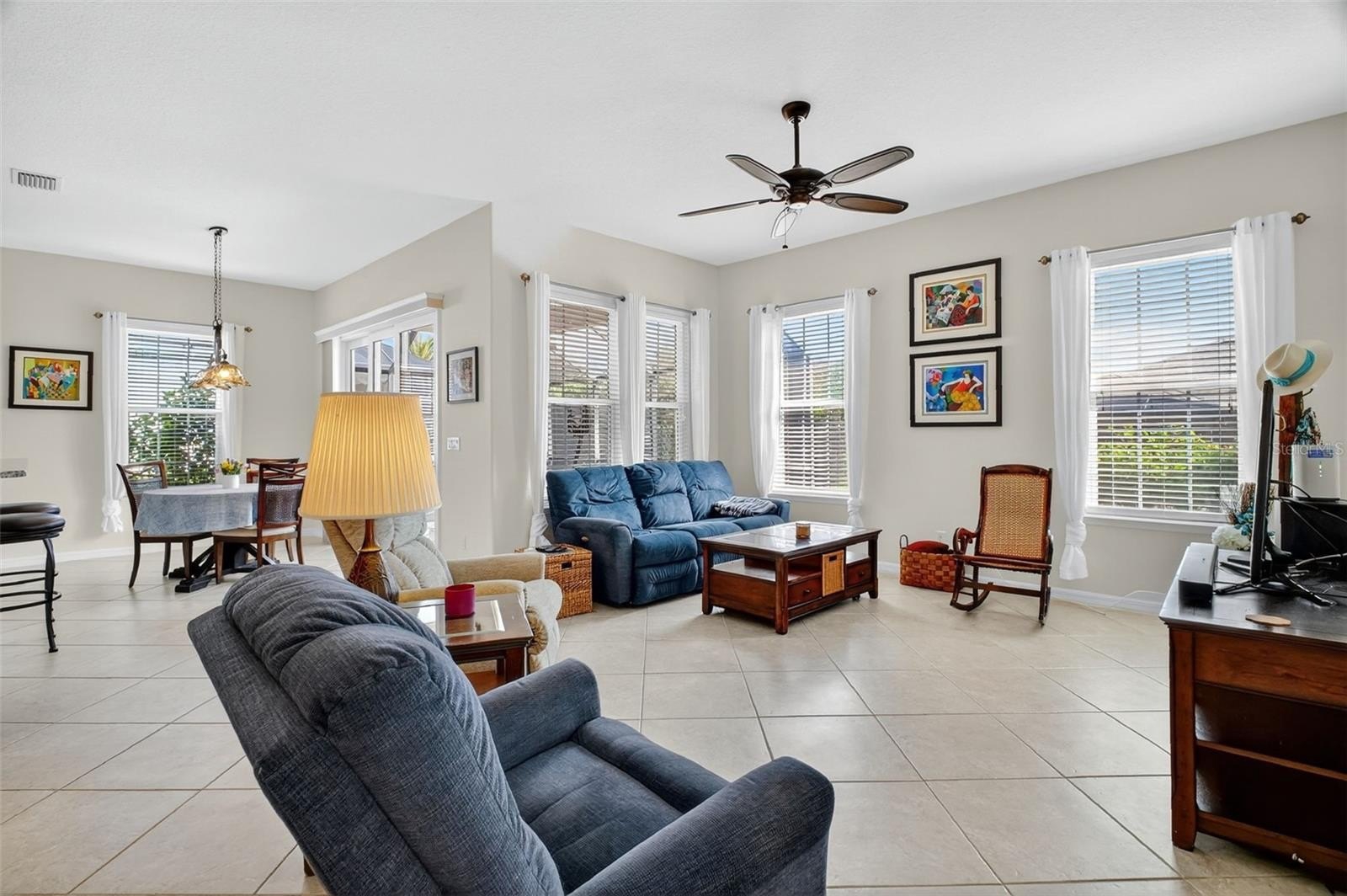 Situated in the heart of STONECREST’S vibrant 55+ community, just minutes from THE VILLAGES. This beautifully maintained 3-bedroom, 2-bath home offers 2,000 square feet of living space with soaring 10-FOOT CEILINGS and an open floor plan filled with natural light. The spacious living and dining areas are anchored by rich ceramic TILE FLOORING and flow seamlessly into a chef's kitchen featuring GRANITE COUNTER-TOPS, pendant lighting, a BREAKFAST BAR, a LARGE PANTRY, and a cozy breakfast nook.