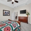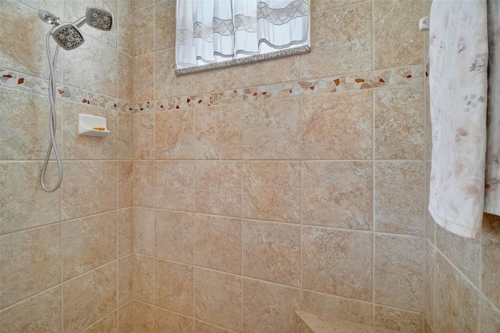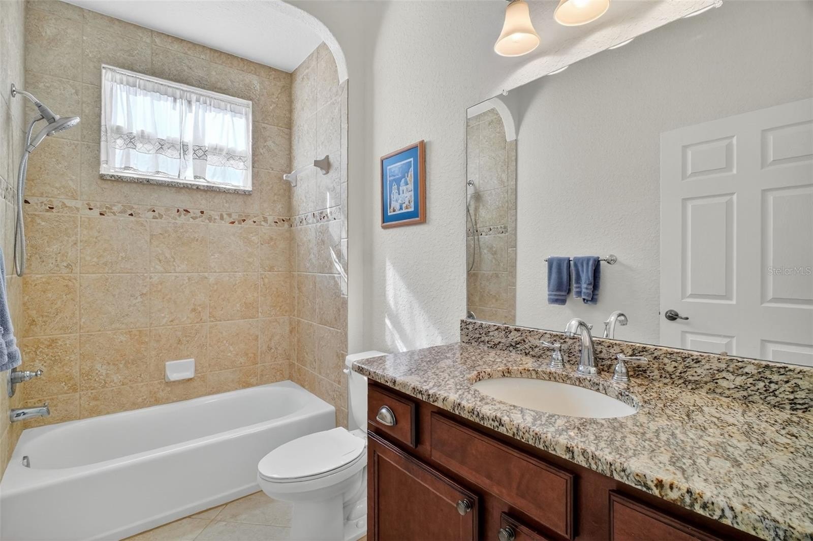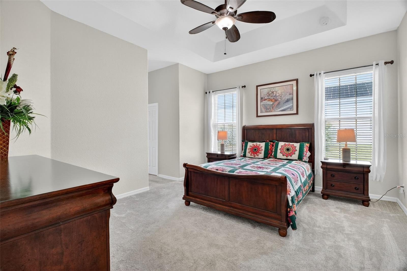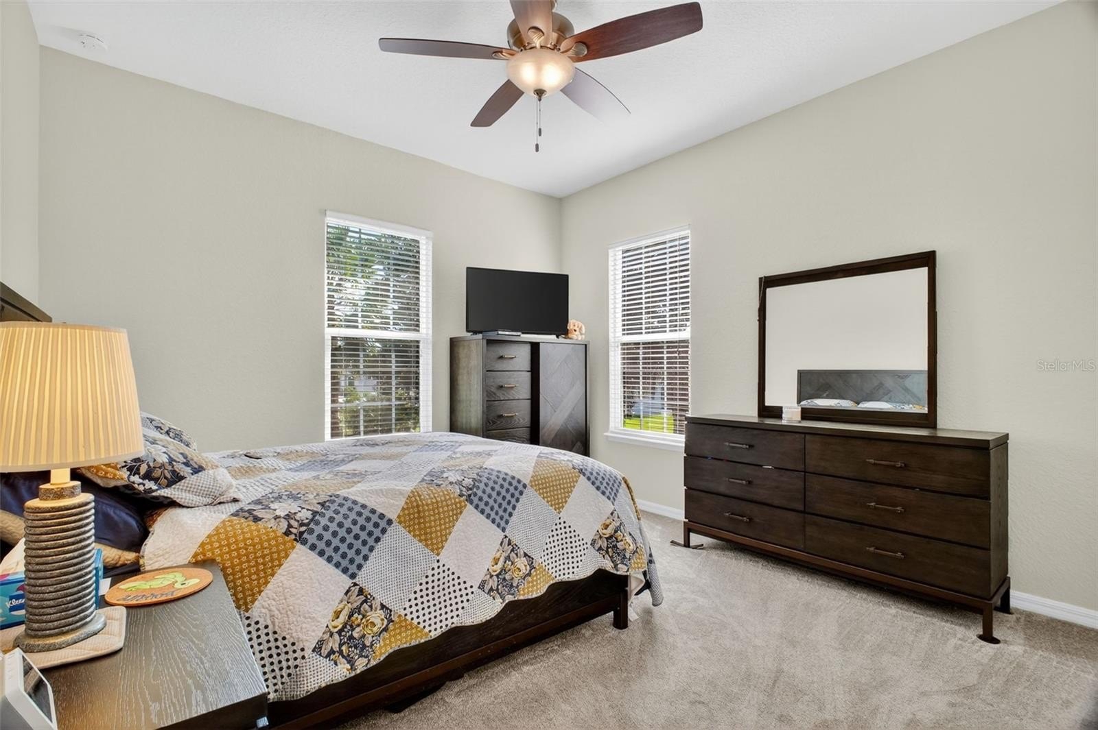 The primary suite is a relaxing retreat with a TRAY CEILING, ceiling fan, his-and-hers WALK-IN CLOSETS, and a spa-inspired en-suite bathroom with DUAL GRANITE VANITIES, a beautifully TILED WALK-IN SHOWER, and a stunning GARDEN TUB framed by arched privacy windows. Two generously sized guest bedrooms, each with a built-in closet and newer plush carpeting, are served by a full guest bathroom featuring a granite vanity and a tiled tub-shower combo. A separate laundry room provides added convenience and functionality. The spacious TWO-CAR GARAGE offers plenty of room for vehicles, golf carts, and storage.