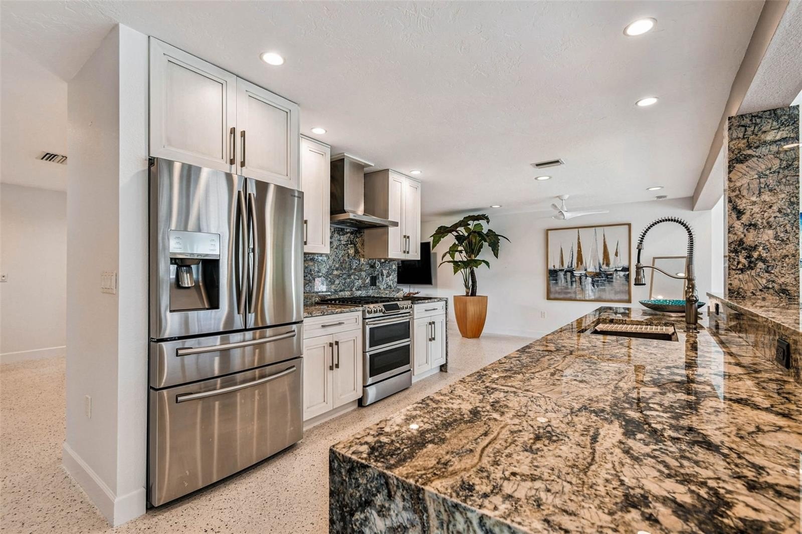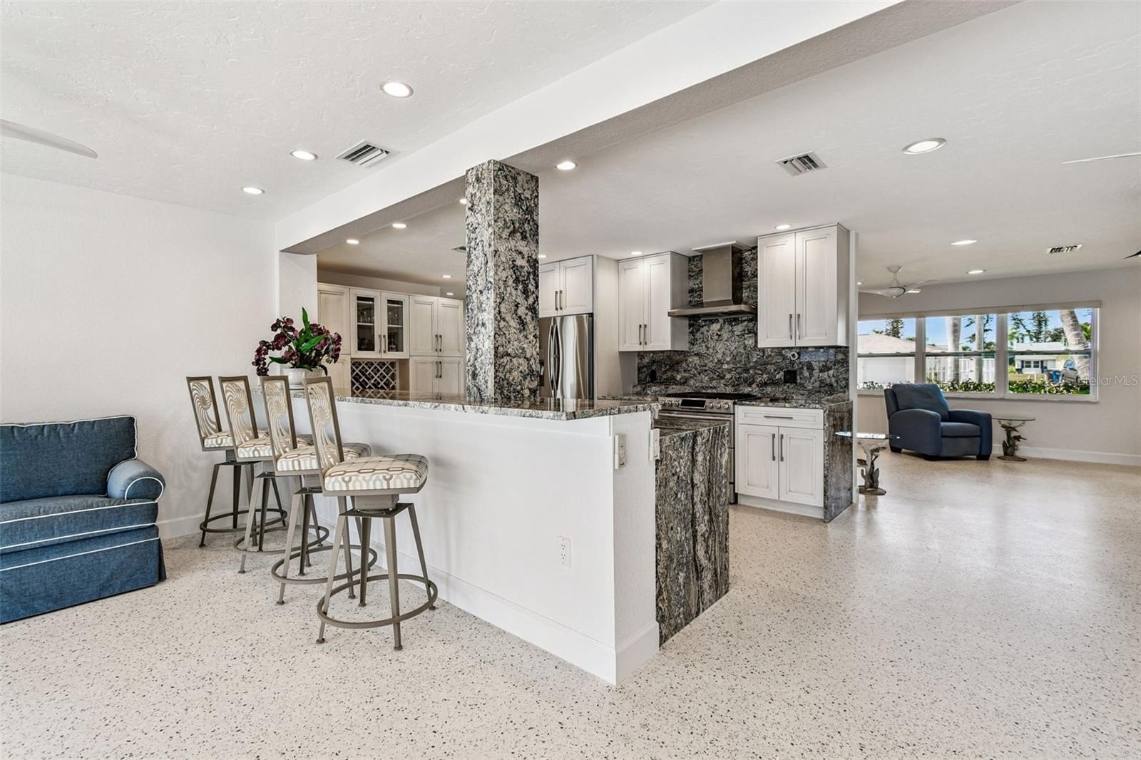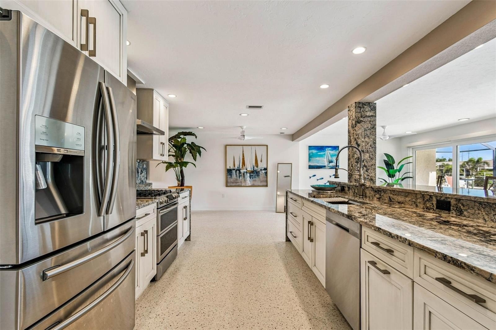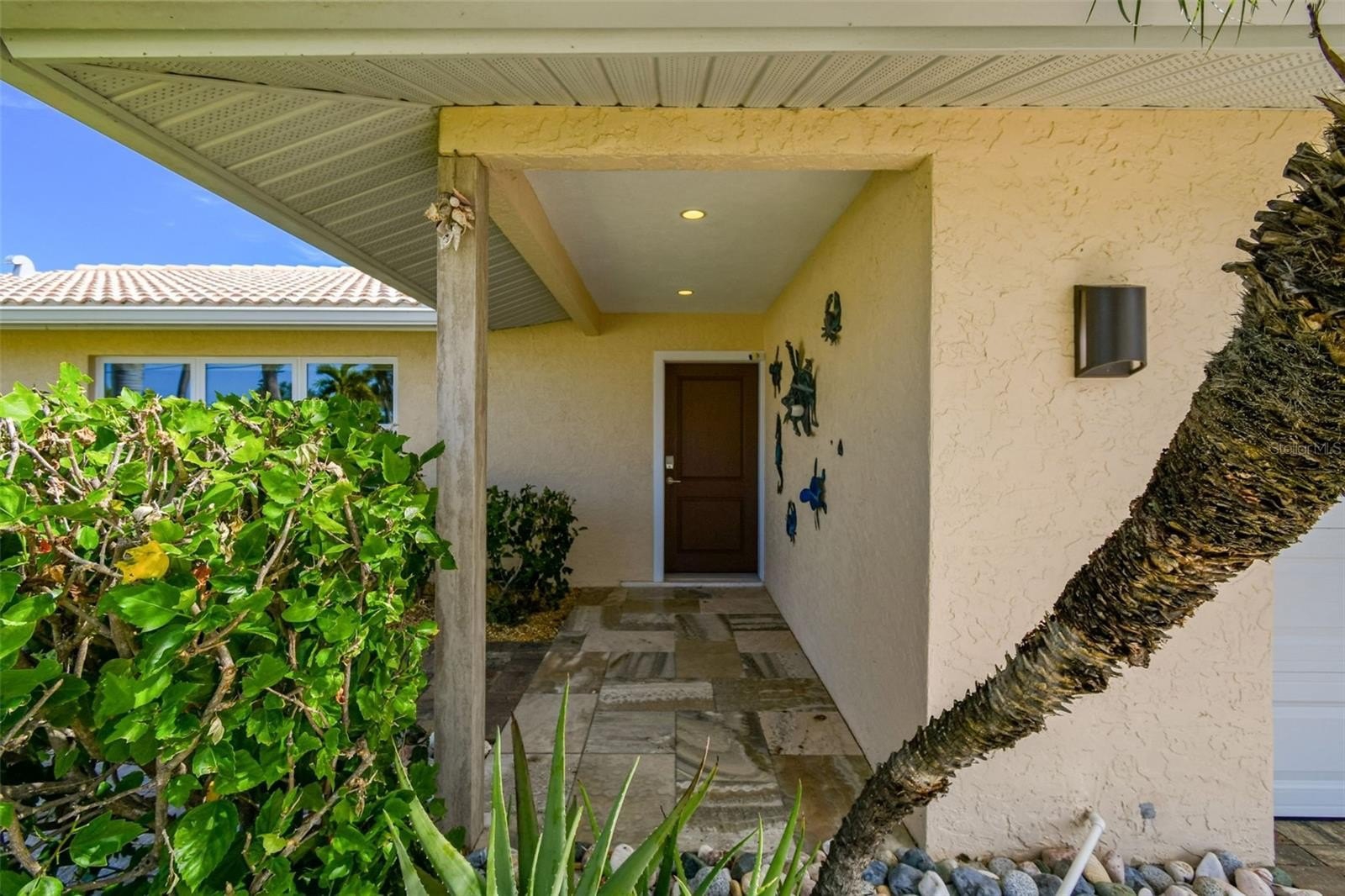 Waterfront dream home with private dock & boat lifts! Fully remodeled and furnished, this coastal ranch invites you to experience the ultimate Florida lifestyle on a saltwater canal with quick Gulf access—just minutes from Anna Maria Island and Longboat Key. This stunning retreat offers effortless boating, fishing, and sunset cruising from your private backyard oasis. An inviting entrance featuring unique international exotic stones, mature palms, and a full irrigation system welcomes you home. Set on 93 feet of seawall, the property showcases an elevated terrace finished in RARE ONYX and reinforced block walls with rebar construction for lasting strength. Enjoy a private dock with a 15,000-lb boat lift, new double Jet Ski lift, and spacious fish-cleaning station—perfect for the boating enthusiast. Originally a three-bedroom home, it was reimagined into a spacious two-bedroom layout with an enlarged primary suite and open flow; a third bedroom could be added. Since 2018, the residence has been redesigned top to bottom, featuring a glazed ceramic tile roof, steel beam reinforcement, and all-new systems throughout. Interiors are a showcase of luxury and artistry, highlighted by crystal-accented granite, Azurite slabs and seamless terrazzo floors creating a sleek, contemporary aesthetic. Every detail reflects sophistication, from Minka remote-control fans and LED lighting to propane gas conversion for high-end cooking performance. The gourmet kitchen is a true centerpiece—adorned with Azurite stone counters in deep ocean hues, waterfall island, full-height backsplash, wine bar, and Wolf hood vented through the roof. Prepare your fresh catch without lingering odors and entertain with ease. Four hurricane-rated sliders open to the screened and heated saltwater pool and spa for seamless indoor-outdoor living. The self-cleaning pool and propane heater warm the spa in minutes, while underwater lighting sets the mood for relaxing evenings. The primary suite captures the morning light, featuring porcelain wood-look floors, a custom walk-in closet, and a spa-inspired bath clad in striking Patagonia Quartzite with rain shower, three body jets, and handheld sprayer. Graber designer shades add privacy and elegance. Built for durability and low-maintenance living, this home includes a wind mitigation report qualifying for low insurance rates, impact glass, new electrical and plumbing, Rinnai tankless water heater, generator, and updated systems throughout. A Hardie plank shed, vinyl fencing with double gates, and ample outdoor storage enhance function and value. The home appraised above list price and was unaffected by the 2024 hurricanes. Enjoy direct boating access to the Intracoastal and Sarasota Bay with nearby waterfront restaurants, sandbars, golf, beaches, and world-class fishing. Play pickleball at GT Bray Park, shop local markets, or bike through Robinson Preserve and the historic Cortez village. Ideally located in Bradenton, just 12 miles to downtown Sarasota and 5 miles to SRQ Airport, this home combines elegant coastal design with everyday convenience. Live where dolphins and manatees greet you at your dock, and sunsets paint the sky over the Gulf. 4911 Bimini Drive isn’t just a home—it’s your slice of paradise. Come see for yourself in private or join me at an upcoming open house!