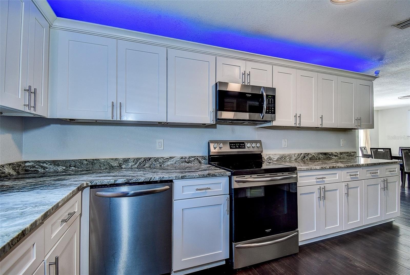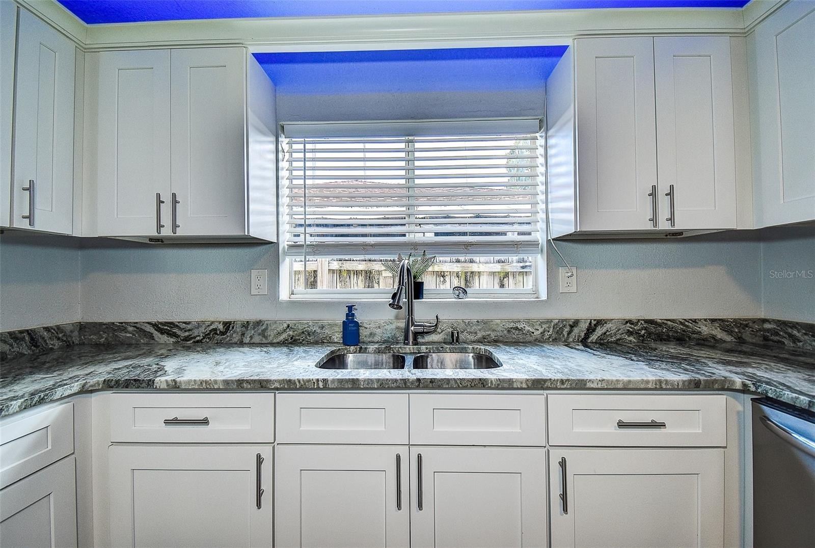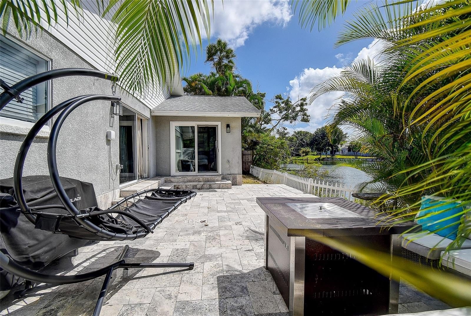 The kitchen is truly a standout, featuring an unusually generous amount of counter space, ideal for those who love to cook, entertain, and spread out. Ample cabinet storage and an open flow into the dining and living areas make this home as functional as it is beautiful. Both the main living area and master bedroom open through sliding glass doors to a gorgeous travertine patio overlooking a peaceful water view, providing a serene backdrop for morning coffee or evening relaxation.