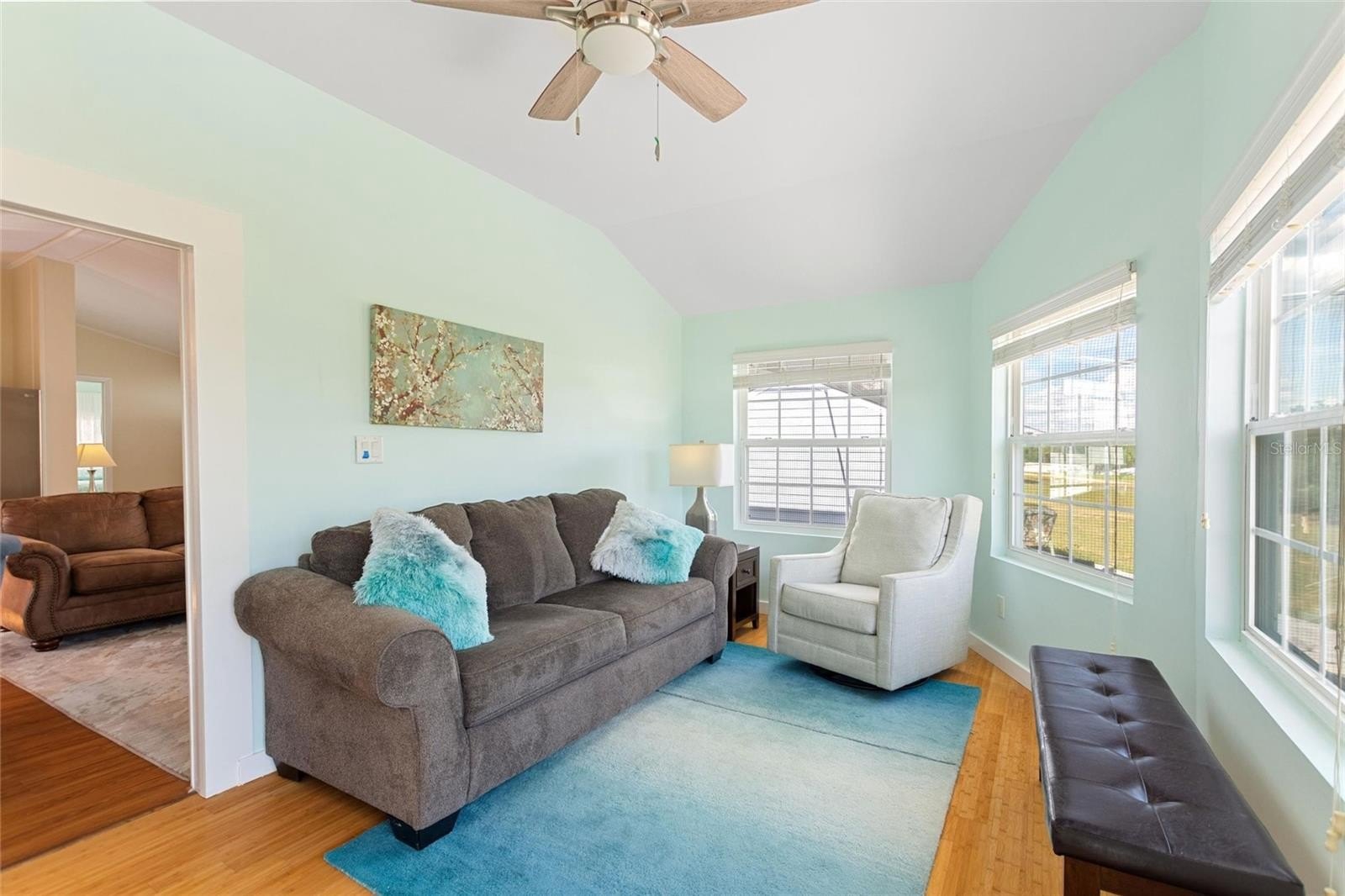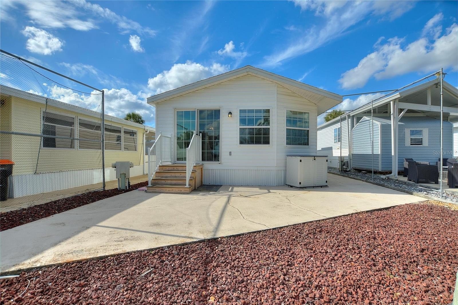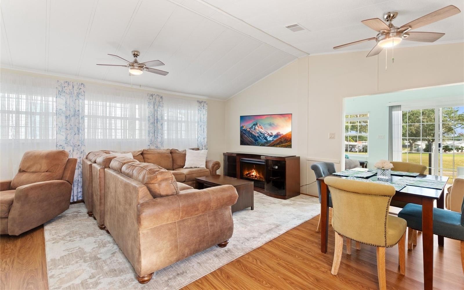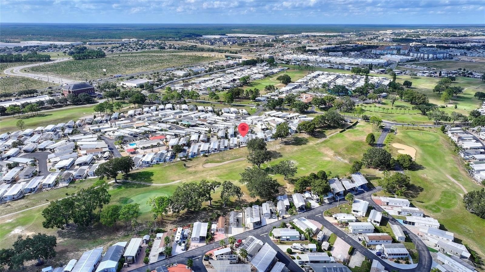 Partially Furnished Park Model on Owned Land with East-facing 4-Seasons FL Room & Patio on Deer Creek Golf Course fairway #1 has 2-vehicle Carport, Covered Walkway and Stairs to front entry. 2 Bedroom / Great Room / Updated Full Bath with Laundry / Solid Surface Floors throughout. 2025 updates: Shingled Roof, Underhome Armor Tie-Down System, Water Heater, Dual side-rail stairs from Composite Deck outside 4-Seasons FL Room to Patio. 2024 updates: Fiberglass front door and storm door. 2023 updates: Bath Fitter shower & LG French door refrigerator. 2022 updates: Bryant 3-ton 14 SEER A/C & heat pump, GE stacked washer/dryer, Maytag microwave. Stainless-steel kitchen appliances & ceramic tile backsplash. Seller says dishwasher could be installed in a free-standing kitchen island. Recently painted interior walls and ceilings. Newer ceiling fans and vaulted ceiling throughout. Golf ball net on north side of home. Sold As-Is. Mockingbird Ridge is a 55+ golf cart friendly community. $145 monthly Mockingbird Ridge fee includes water, sewer, trash pickup, lawn care and exclusive access to private Mockingbird Ridge community center and pool. Adjacent to executive 18-hole Deer Creek Golf & Country Club, privately owned and open to the public. Restaurants, shopping, Disney, Universal, Orlando & Central FL entertainment nearby, easy access to I-4, medical facilities, airports & Sunrail Station. Advent Health hospital is 4 miles away.