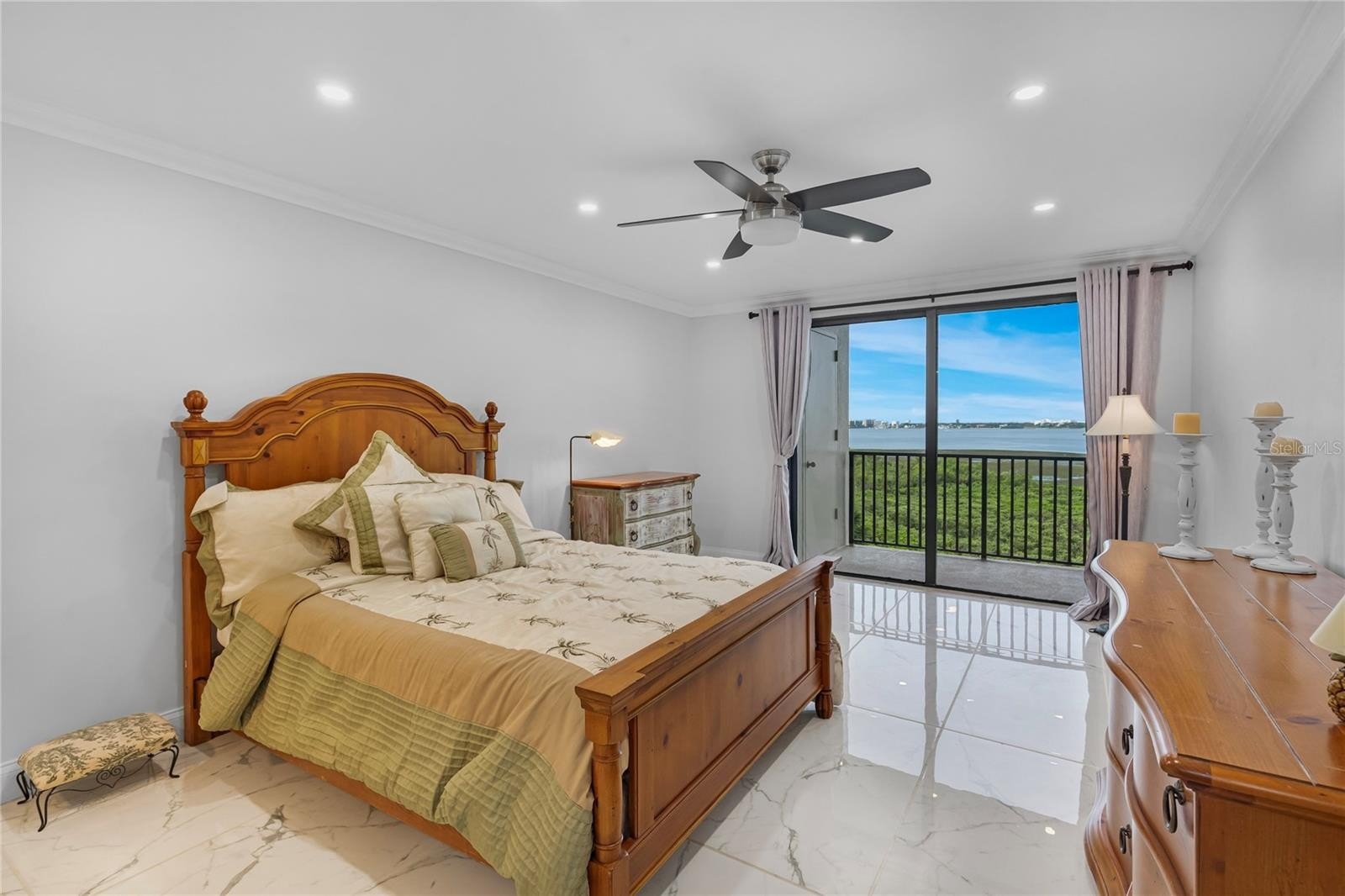 The open-concept design features a spacious kitchen with crisp white cabinetry and premium stainless steel appliances, seamlessly flowing into light-filled living spaces adorned with modern porcelain tile. The thoughtful split-bedroom floor plan ensures both comfort and privacy, all while maintaining continuous water views.