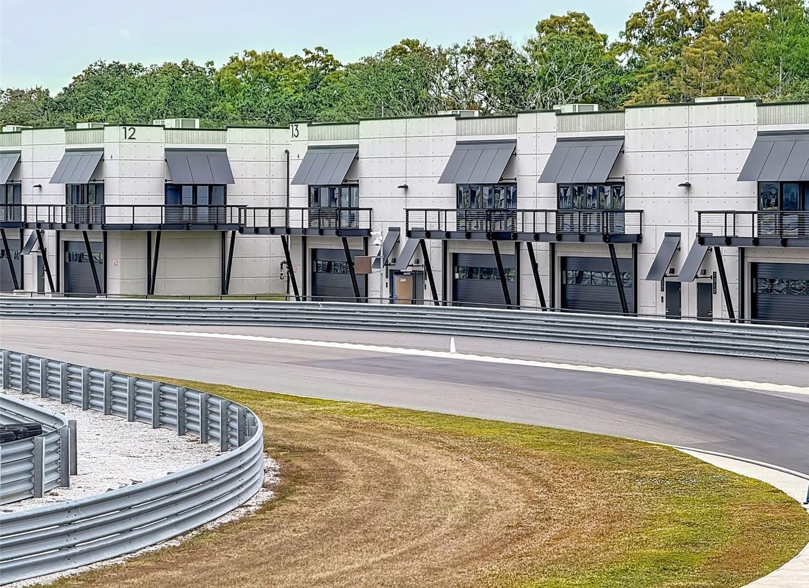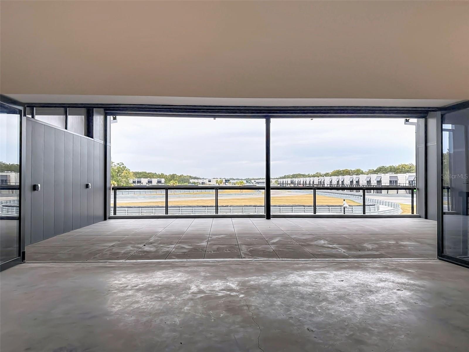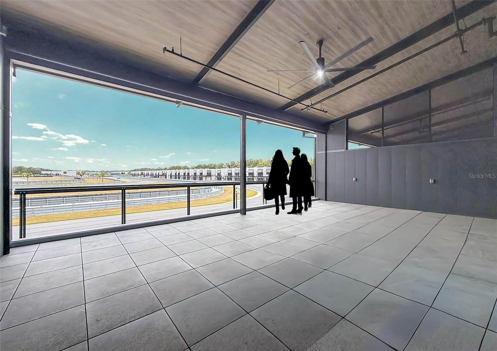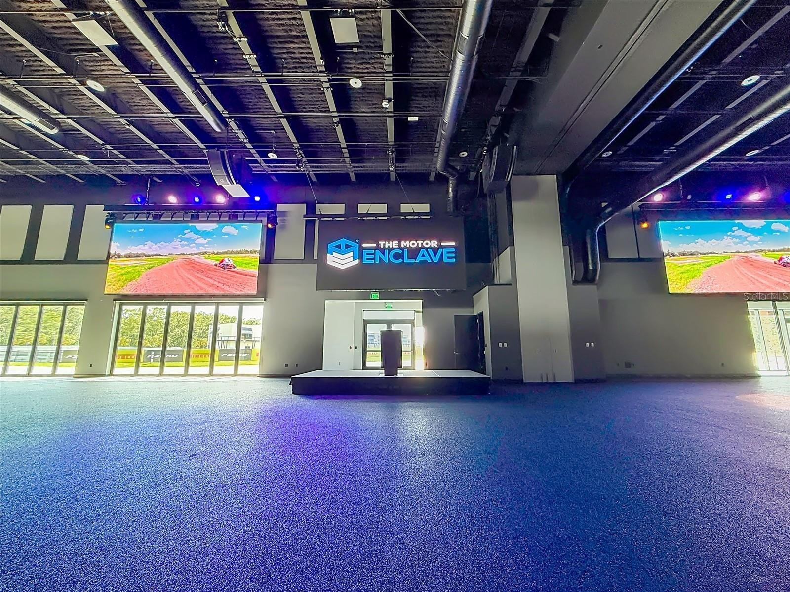 One or more photo(s) has been virtually staged. Motor Enclave Garage Condo Unit #1405 — a rare, premium track-front position overlooking the heart of The Motor Enclave’s 1.72-mile road course and the Event Center beyond. Very few units offer this level of direct vantage and depth of vertical space. If you’ve been waiting for a buildout that is not raw slab or a single loft, but one where the most time-consuming structural AND expensive to build, elements are already completed — this is it. Unit #1405 delivers approx. 4,840± sq.ft. total under roof, with about 4,140± sq.ft. of usable interior / walkable space spread across three interior levels PLUS a 700± sq.ft. covered trackside balcony. This is a true multi-story configuration — not just a single mezzanine platform. The main level is wide, open, and ready for lifts, car display, golf carts, tools, storage, or vehicle staging bays — with polished concrete floors, exposed steel, clean drywall, and a steel staircase already in place. The second level transitions into a massive entertainment zone, where a dramatic wall of accordion glass doors fully opens to the huge covered balcony — creating a seamless indoor/outdoor venue for watching cars rotate through the bend below. The balcony includes motorized roll-down screens for comfort, shading, and privacy — a perfect environment for weekend race-watching, golden hour cocktails, or morning espresso during lapping sessions. Up on the 3rd level, the elevation + privacy make this an ideal location for a private office, sim racing studio, conference suite — or even a potential fully enclosed bedroom retreat if an owner wants to create a more residential-styled upper “hideout.” This top level has the scale and separation to function as a true upper deck rather than a catwalk mezz. Each level includes fire suppression sprinklers, and HVAC is already installed to this unit as part of The Motor Enclave construction standards. Electrical and water rough-ins are also positioned for future bathroom(s), wet bar, or kitchenette build, allowing a buyer to personalize to their specific vision without starting from scratch. Located on 200+ acres at the I-75 / I-4 interchange in Tampa, The Motor Enclave is the largest private garage community in the world — purpose-built for authentic, active motorsport lifestyle. Herman Tilke-designed circuit, a 2-acre skid pad for autocross, 100 acres of off-road trails, resort-style pool, plus the 37,000 sq.ft. Event Center for major activations, corporate functions, car launches, social events, and automotive culture gatherings. This is not simply storage — this is a clubhouse for people who live cars. Premium track-front multi-story units like #1405 almost never become available. Schedule your private showing today!