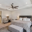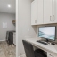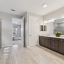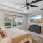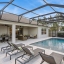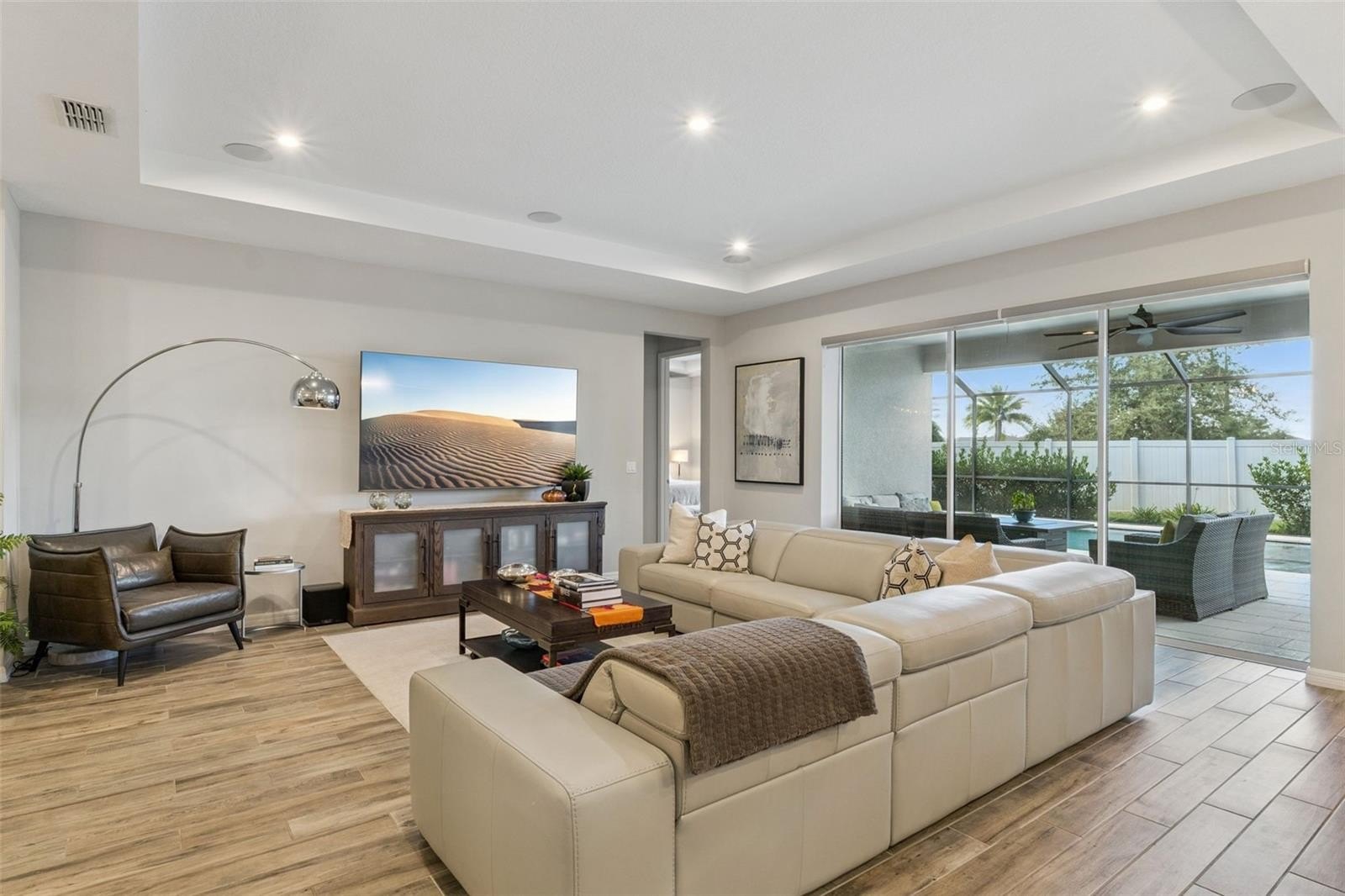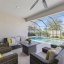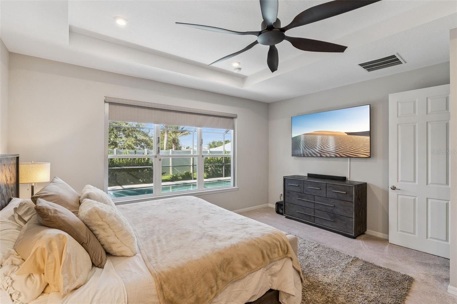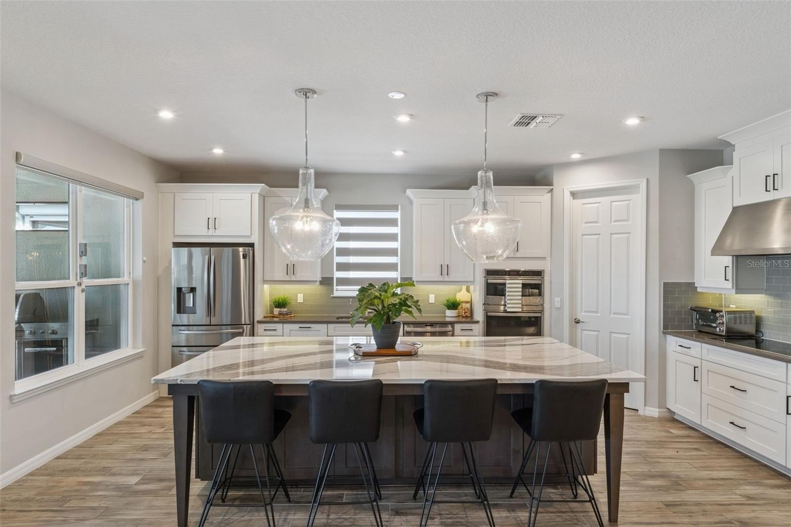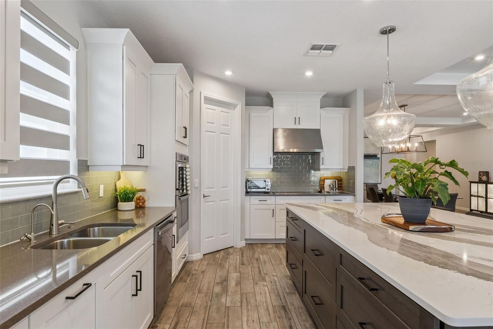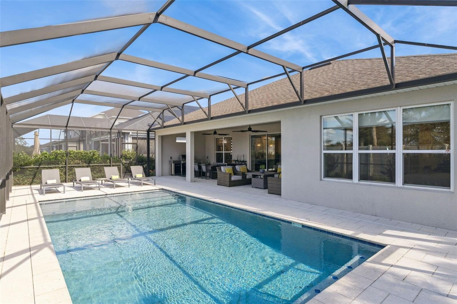 The heart of the home is the kitchen, thoughtfully designed with a quartz center island, tile backsplash, built-in oven, and ample storage. Gourmet kitchen hardware, cushion-close doors and drawers, crown molding, hidden dishwasher, Elegant 42” cabinetry, pendant lighting, and under-cabinet LED accents enhance the space, while the open-concept layout seamlessly connects the kitchen, living, and dining areas—perfect for both everyday living and entertaining. Pocket sliding glass doors in the living room fully open to the outdoor oasis, where a sparkling pool and covered seating area await. The privacy-fenced backyard ensures a tranquil escape. Enjoy countless stunning sunsets overlooking this backyard. The primary suite is a true sanctuary, complete with a sitting area, elegant tray ceiling, and a spa-inspired bathroom featuring a frameless glass shower, dual quartz vanities, and an expansive walk-in closet. Each of the three secondary bedrooms features its own private ensuite bathroom, offering unparalleled convenience and privacy for family and guests alike, a rare and highly desirable feature! Designed for both comfort and functionality, this home also includes a built-in desk tucked away for added versatility adjacent to the generous laundry room. The three-car inline garage provides extra storage options with an epoxy floor.