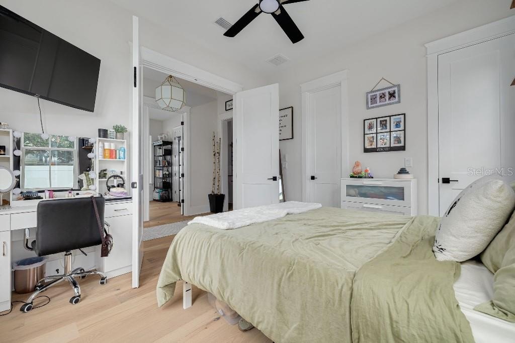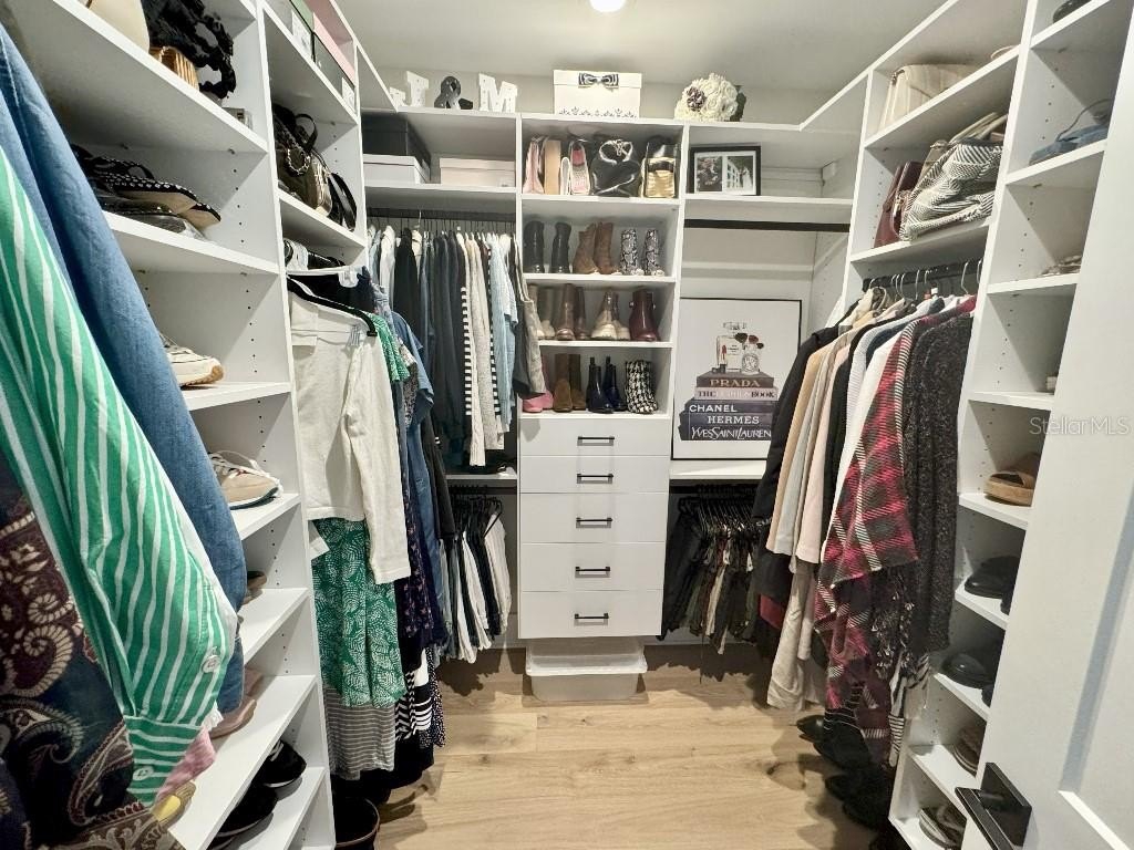 The spacious owner’s suite is a true retreat, featuring two large custom made walk-in closets, dual vanities, free-standing soaking tub, and a walk-in shower.