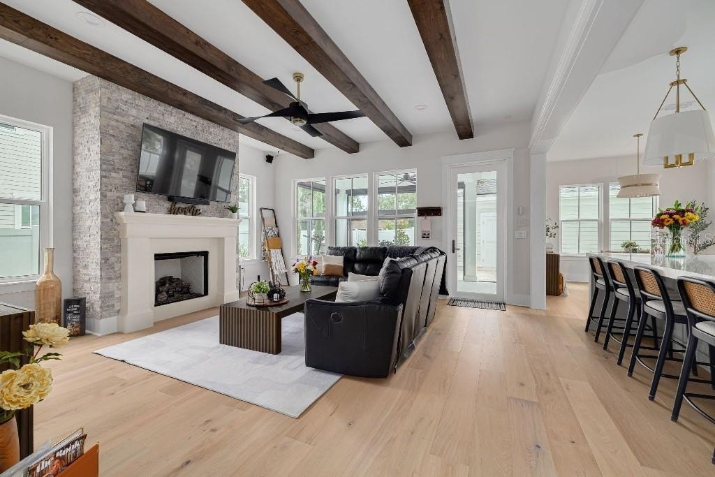 - Striking exposed beams ceiling in the family room