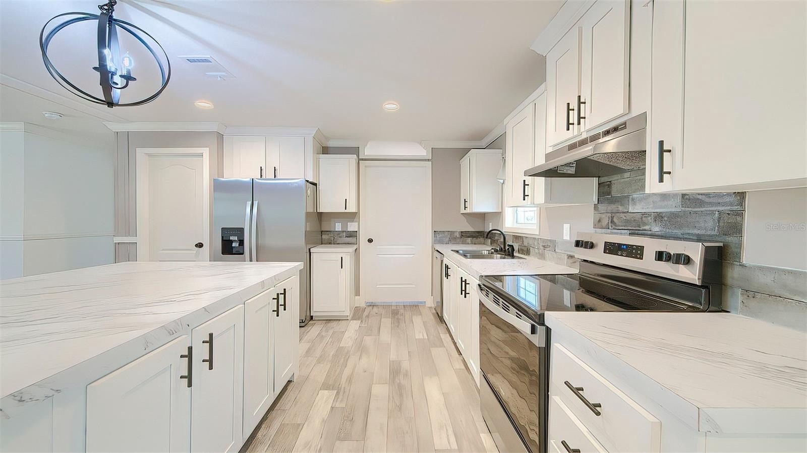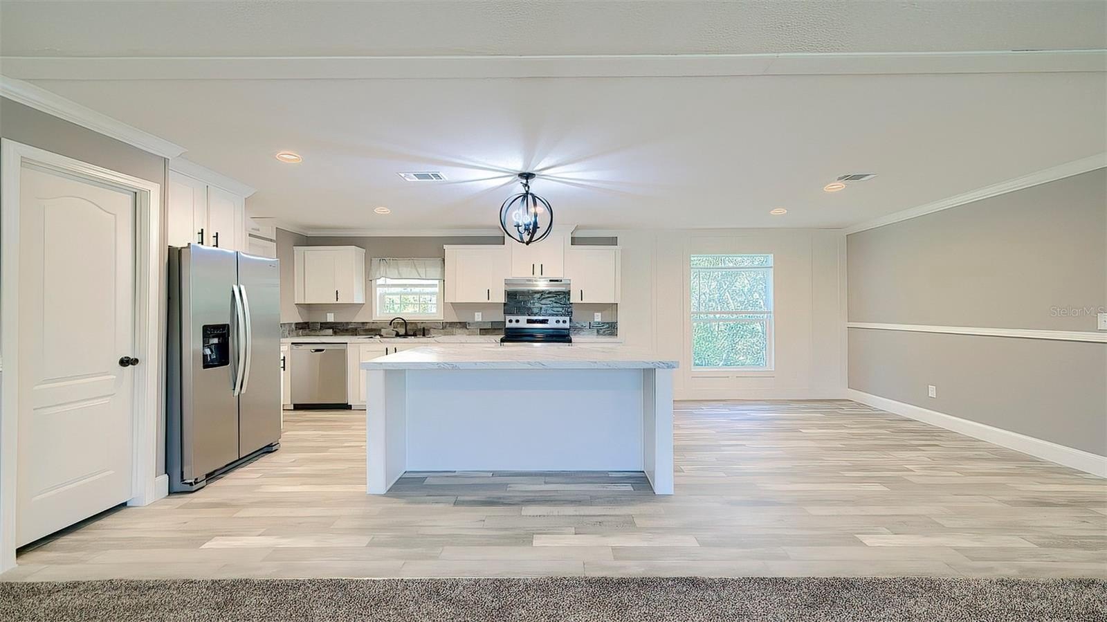 Step inside to discover a bright and airy kitchen featuring shaker cabinetry, stainless-steel appliances, marble-look countertops, and a spacious island that’s perfect for entertaining. The living and dining areas flow seamlessly, creating an inviting space for family gatherings and everyday living.